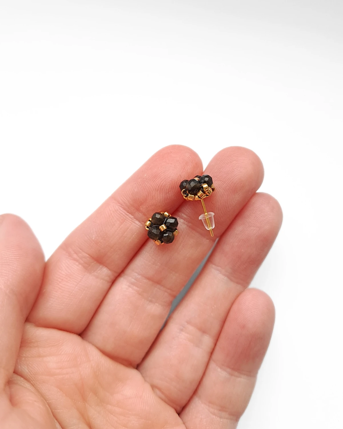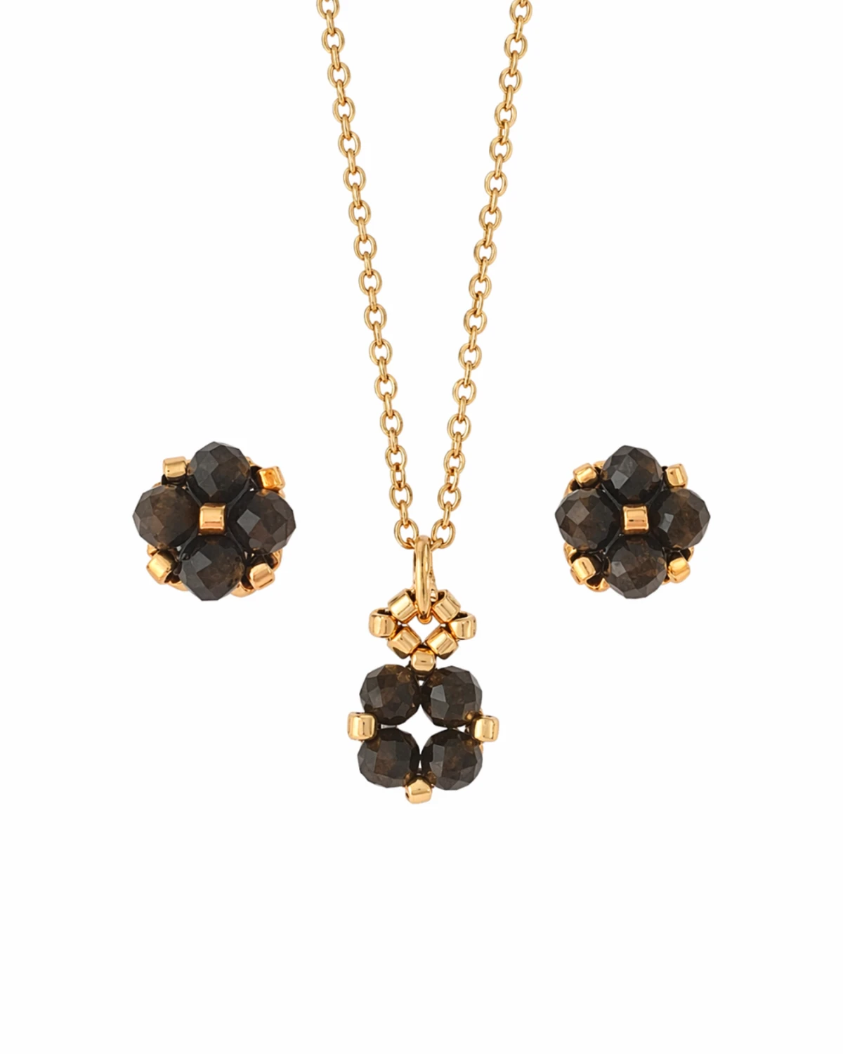 Delikatny komplet z obsydianu to połączenie minimalistycznych sztyftów i pasującego naszyjnika, które razem tworzą spójną, harmonijną całość. Biżuteria z obsydianu złocistego zachwyca głęboką czernią z subtelnym, złotym połyskiem widocznym w świetle. W połączeniu ze złotymi detalami tworzą elegancką, wyrazistą kompozycję o ponadczasowym charakterze. Minimalistyczna forma i niewielki rozmiar sprawiają, że są wygodne w noszeniu, a jednocześnie przyciągają spojrzenia swoją tajemniczą głębią.