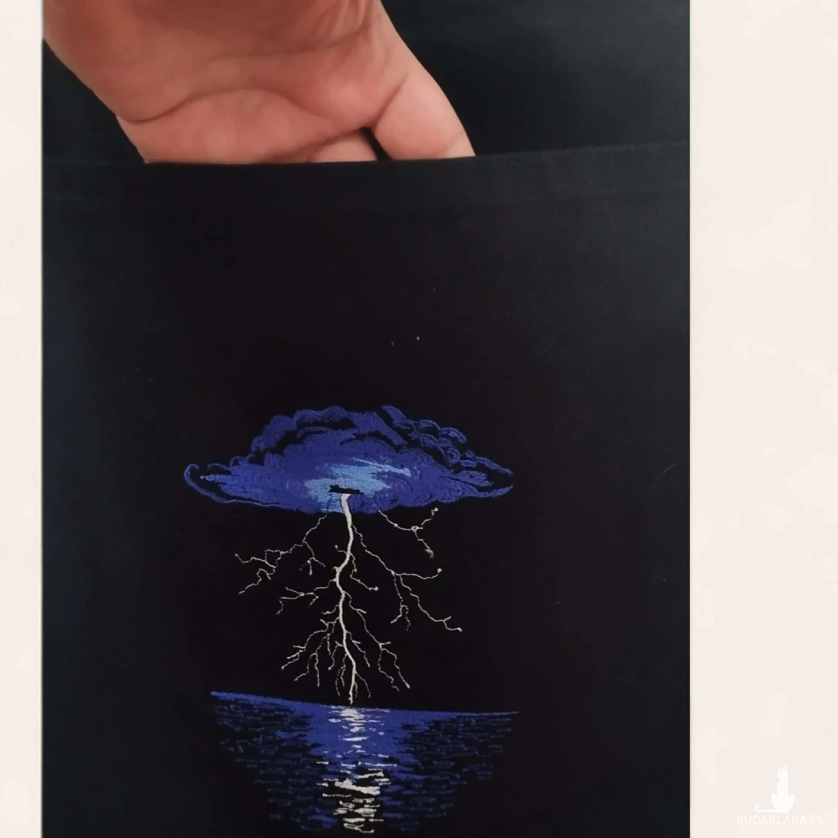 Przód torby z dużą kieszenią ozdobioną haftem. Dno torby poszerzone - tak aby mogła pomieścić wszystkie niezbędne drobiazgi i przydasie.