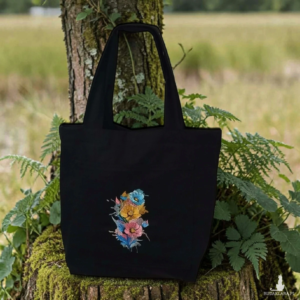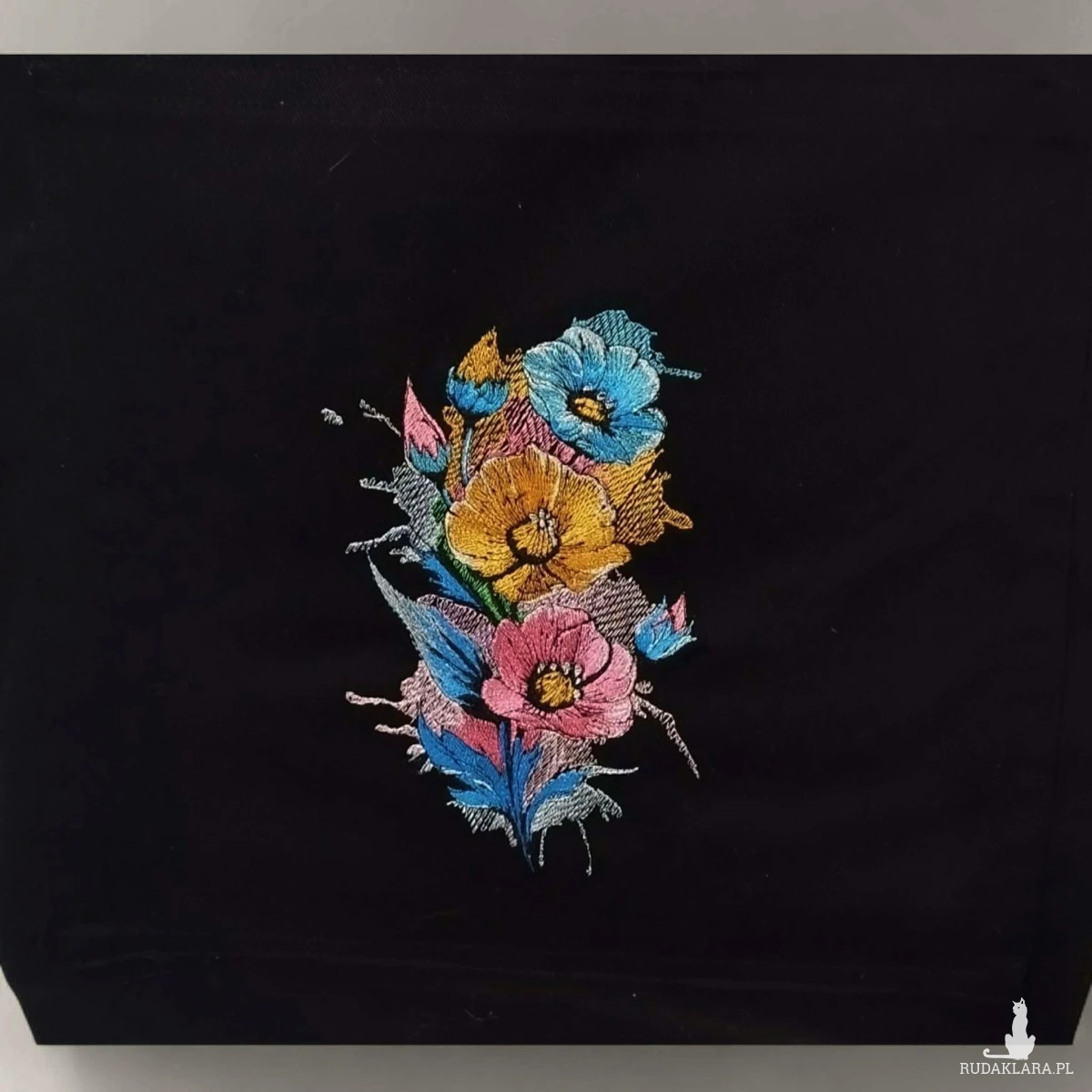 Czarna torba z kieszonką i haftem w kwiaty