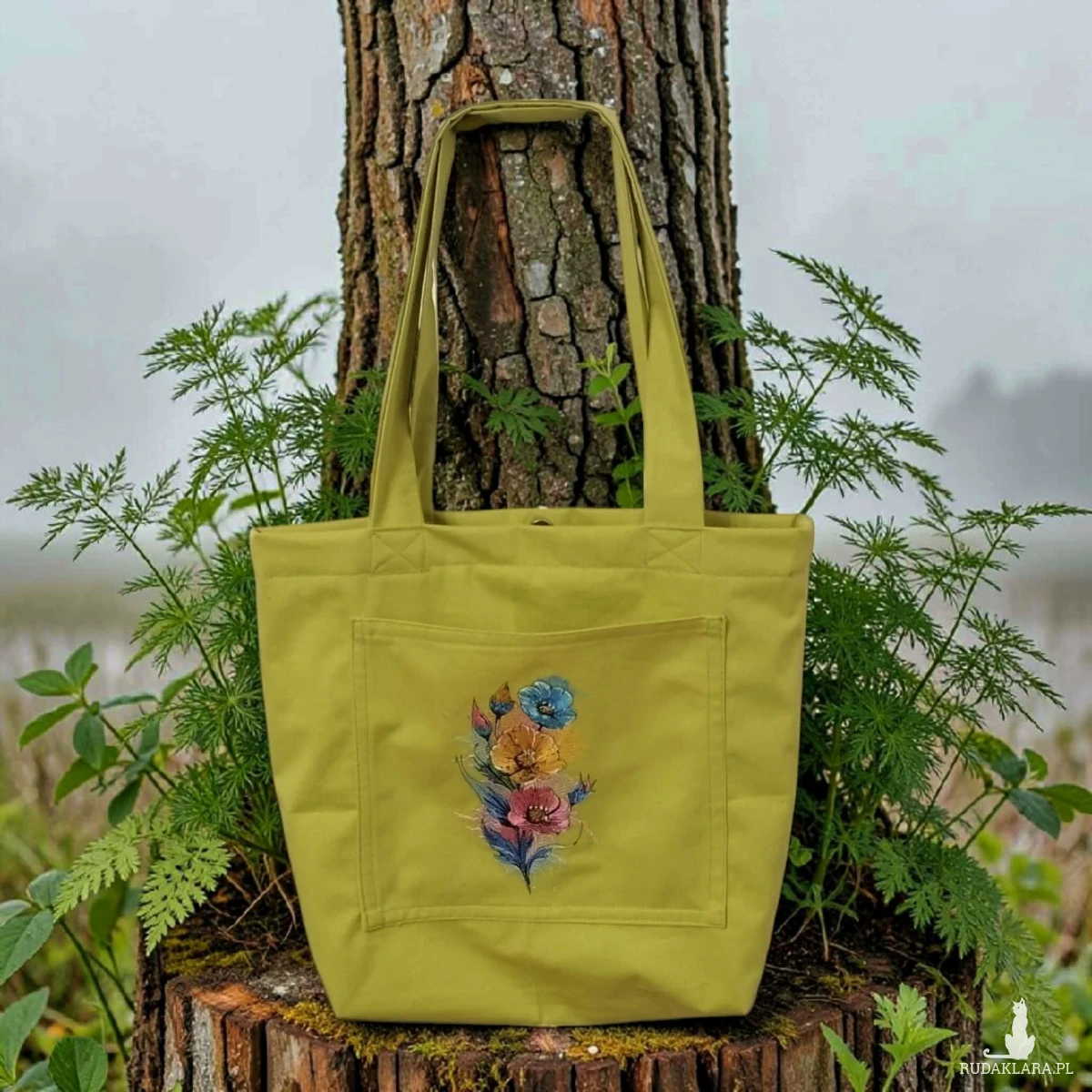 Przód torby z dużą kieszenią ozdobioną haftem. Dno torby poszerzone - tak aby mogła pomieścić wszystkie niezbędne drobiazgi i przydasie.