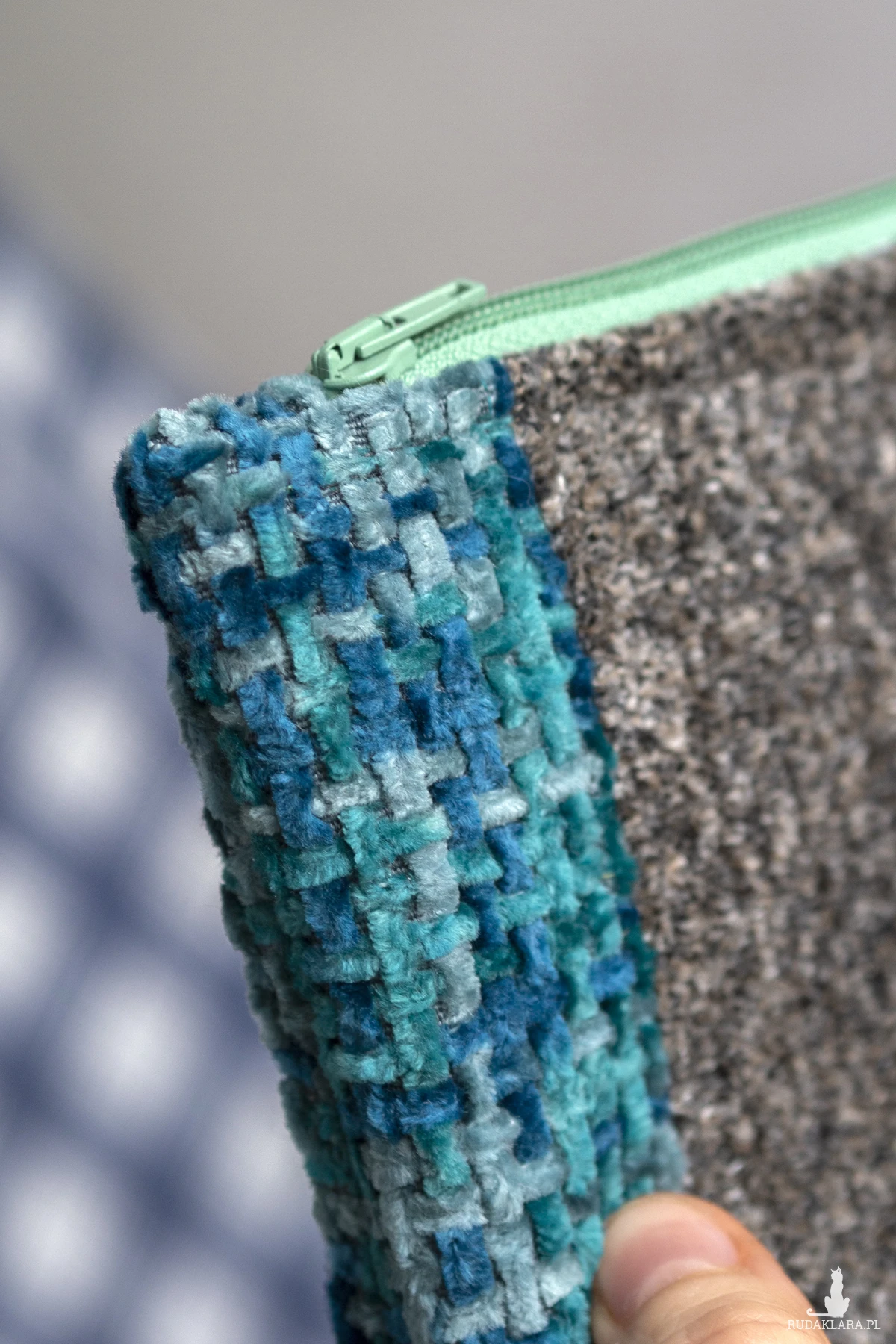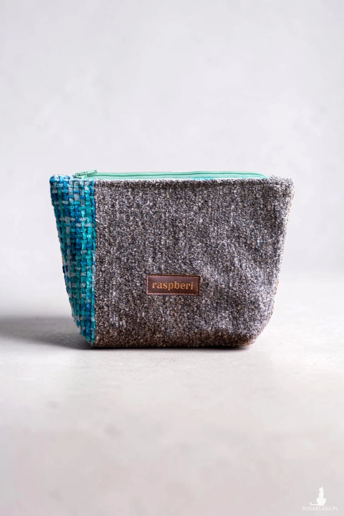 Duża kosmetyczka w kolorze turkusowo-szarym. Stworzona w duchu no waste.
