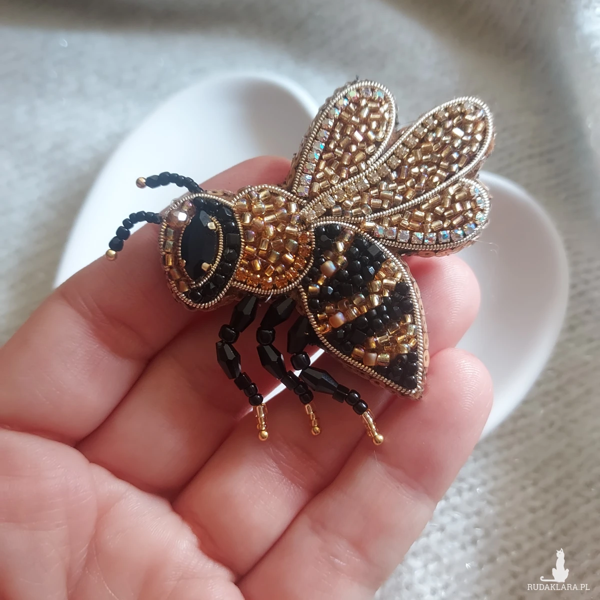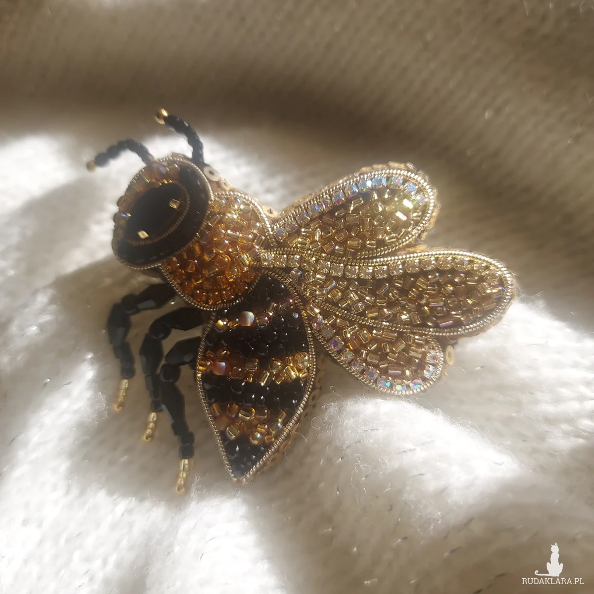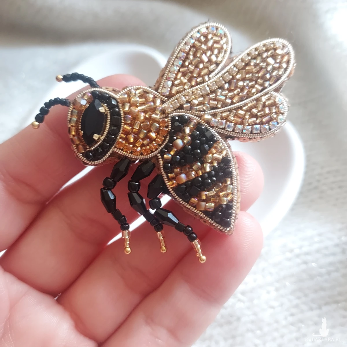 Ta cudowna broszka pszczoła powstała ręcznie haftem koralikowym - to magia blasku kryształków, koralików oraz cyrkonii.