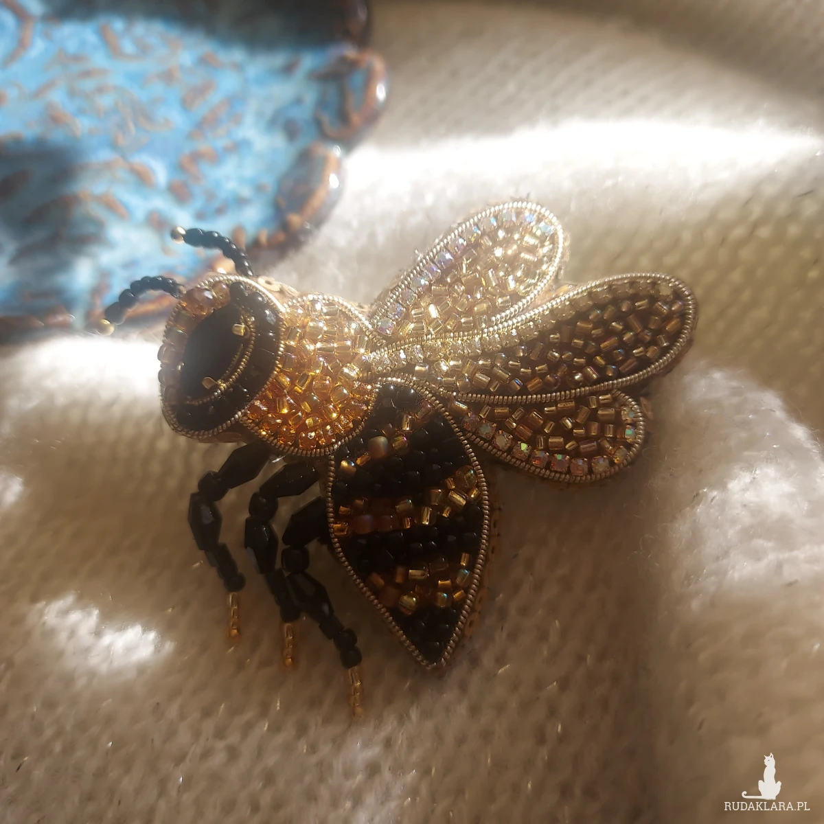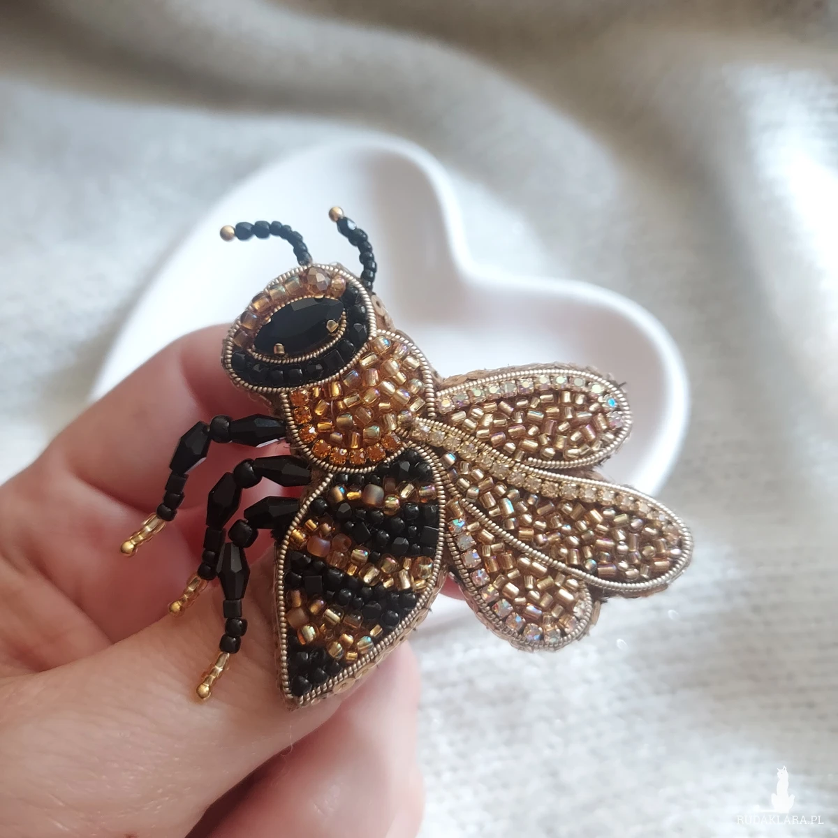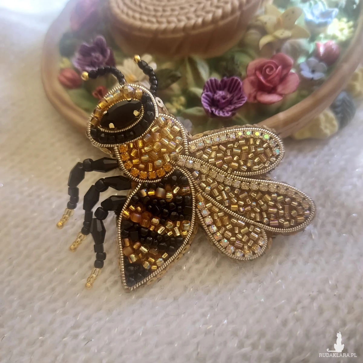Ta cudowna broszka pszczoła powstała ręcznie haftem koralikowym - to magia blasku kryształków, koralików oraz cyrkonii.