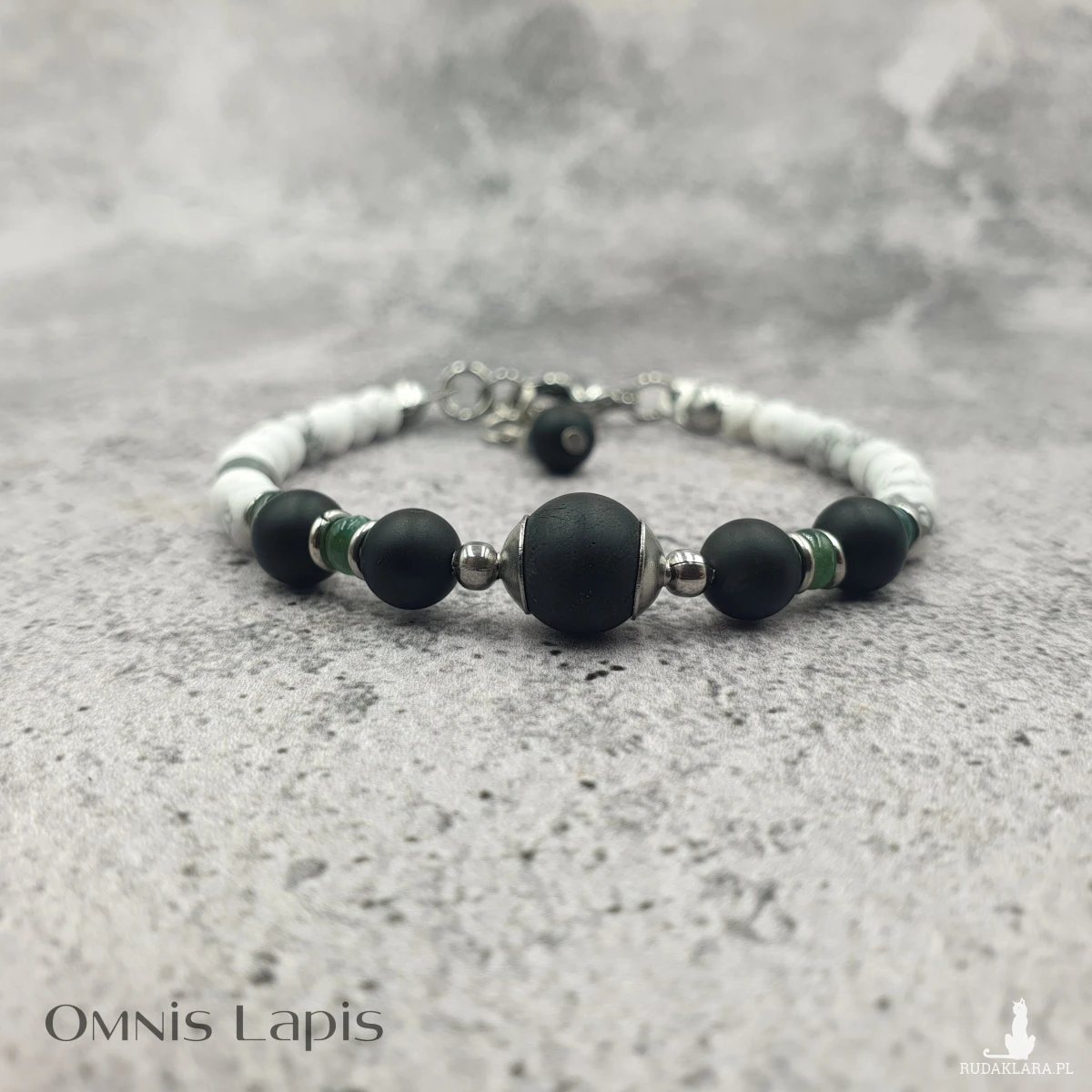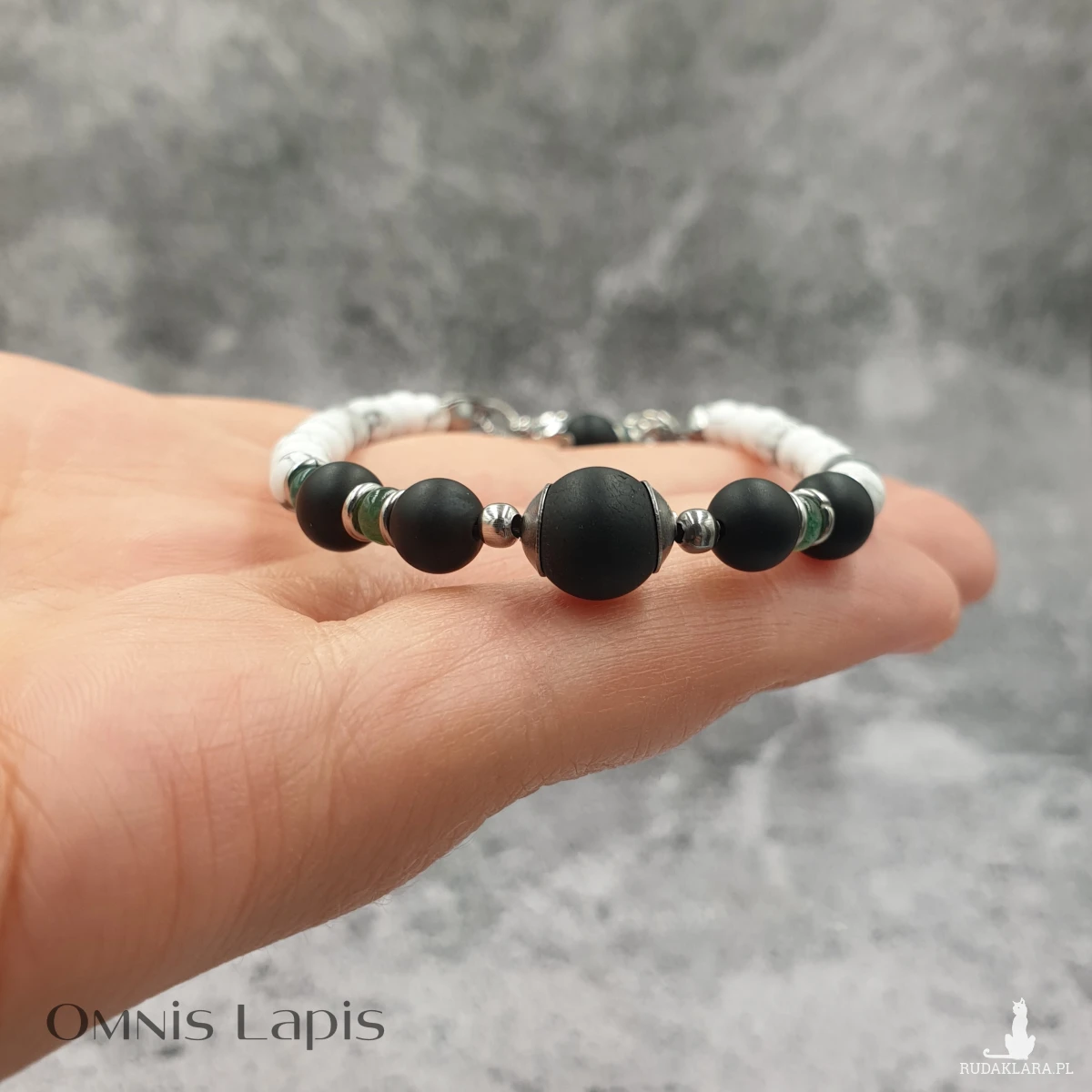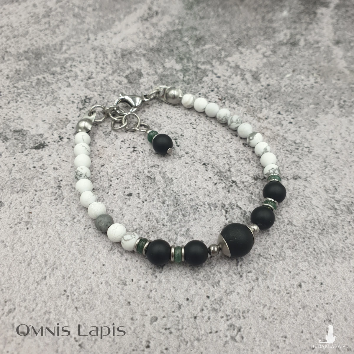 Wykonana z kul białego howlitu, czarnego onyksu i turmalinu oraz oponek agatu indyjskiego. Kamienie przedzielone przekładkami ze stali szlachetnej.