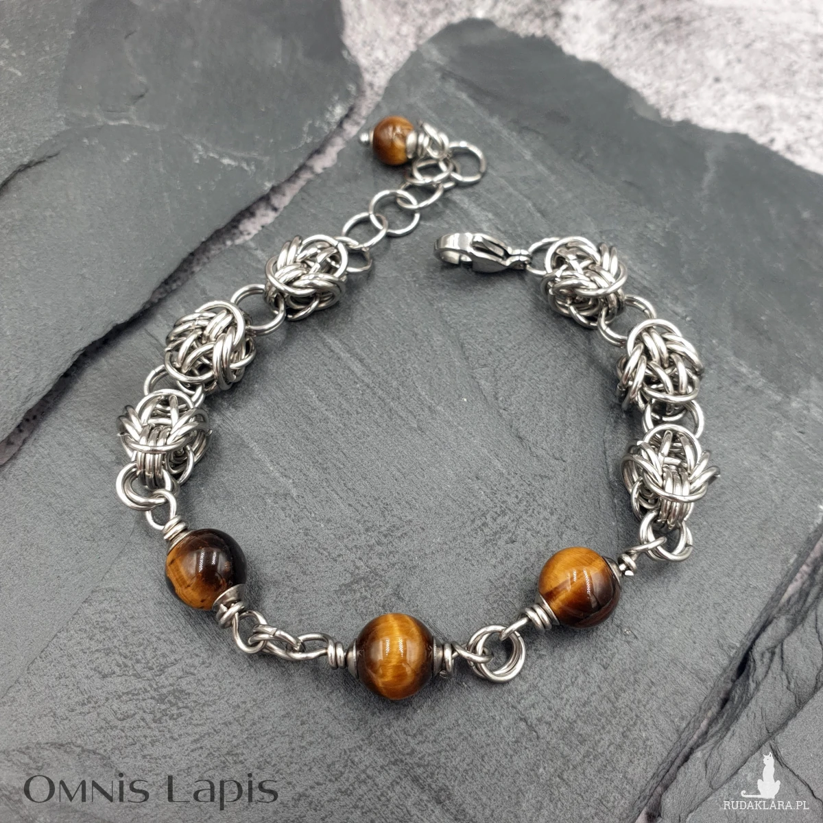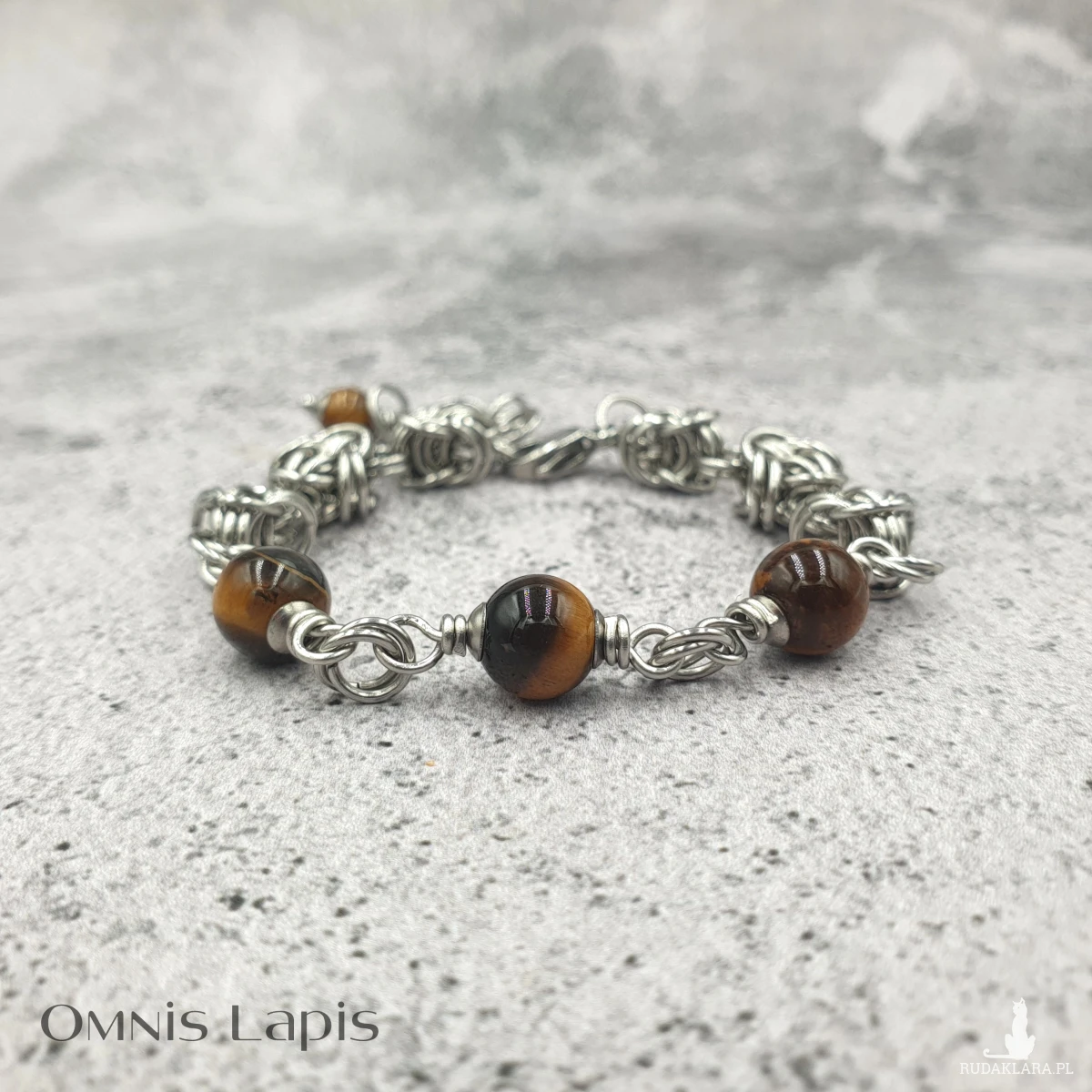 Oryginalna bransoletka wykonana w technice chainmaille: dawnej sztuce tworzenia łańcuchów. Bransoletka wykonana ze stali szlachetnej. Ozdobiona kulami mieniącego się tygrysiego oka.