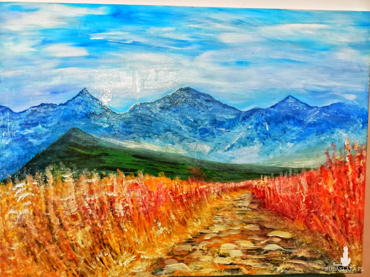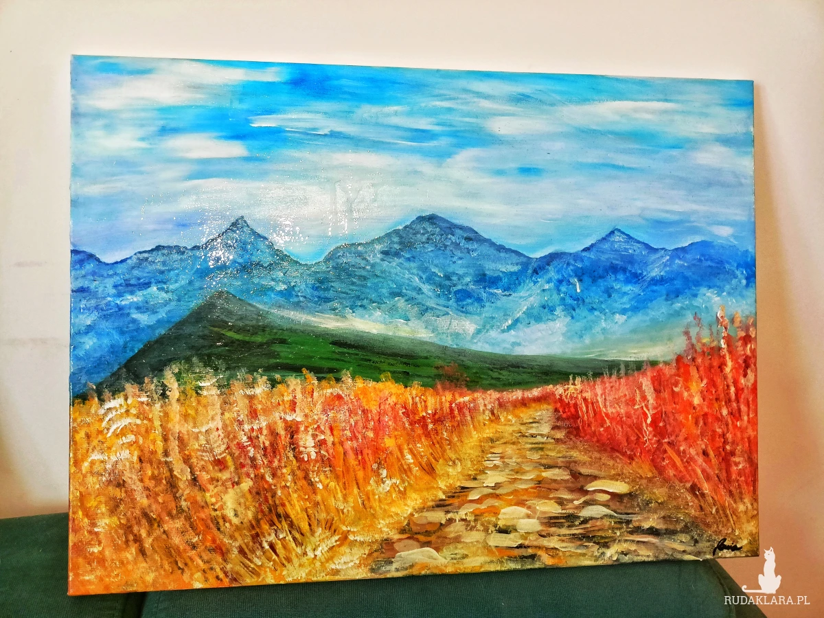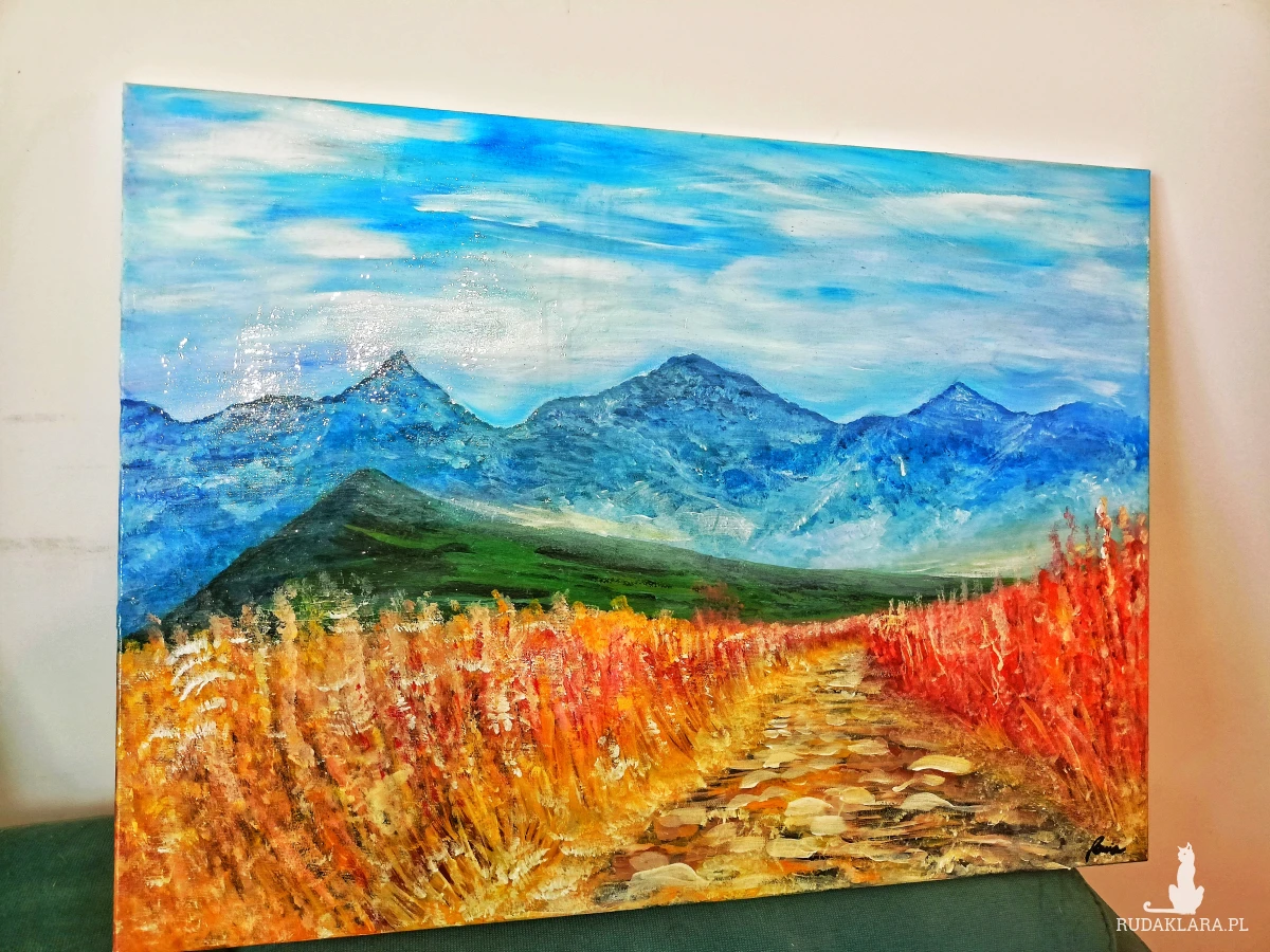 Ten ręcznie malowany obraz przedstawiający górski szlak w Tatrach to idealny wybór dla miłośników krajobrazów, górskich wędrówek i sztuki z charakterem.