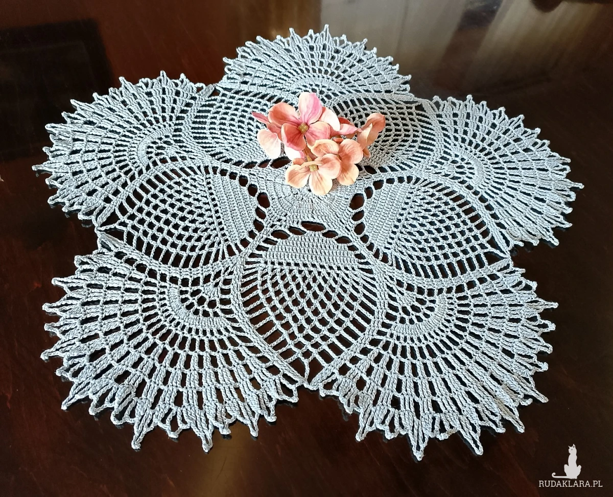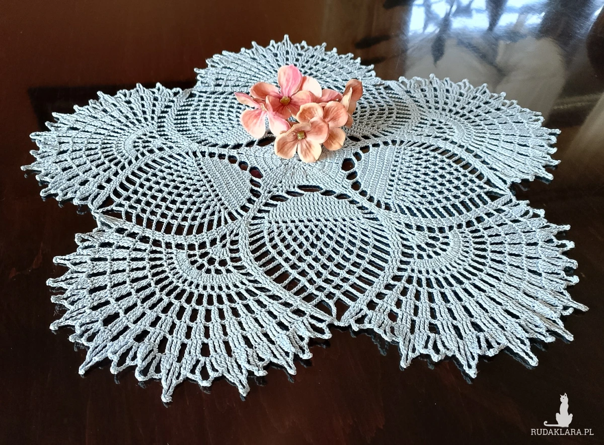 Bardzo dekoracyjna serwetka, o pięknym wzorze, wykonana w całości ręcznie z kordonka w kolorze jasno niebieskim.