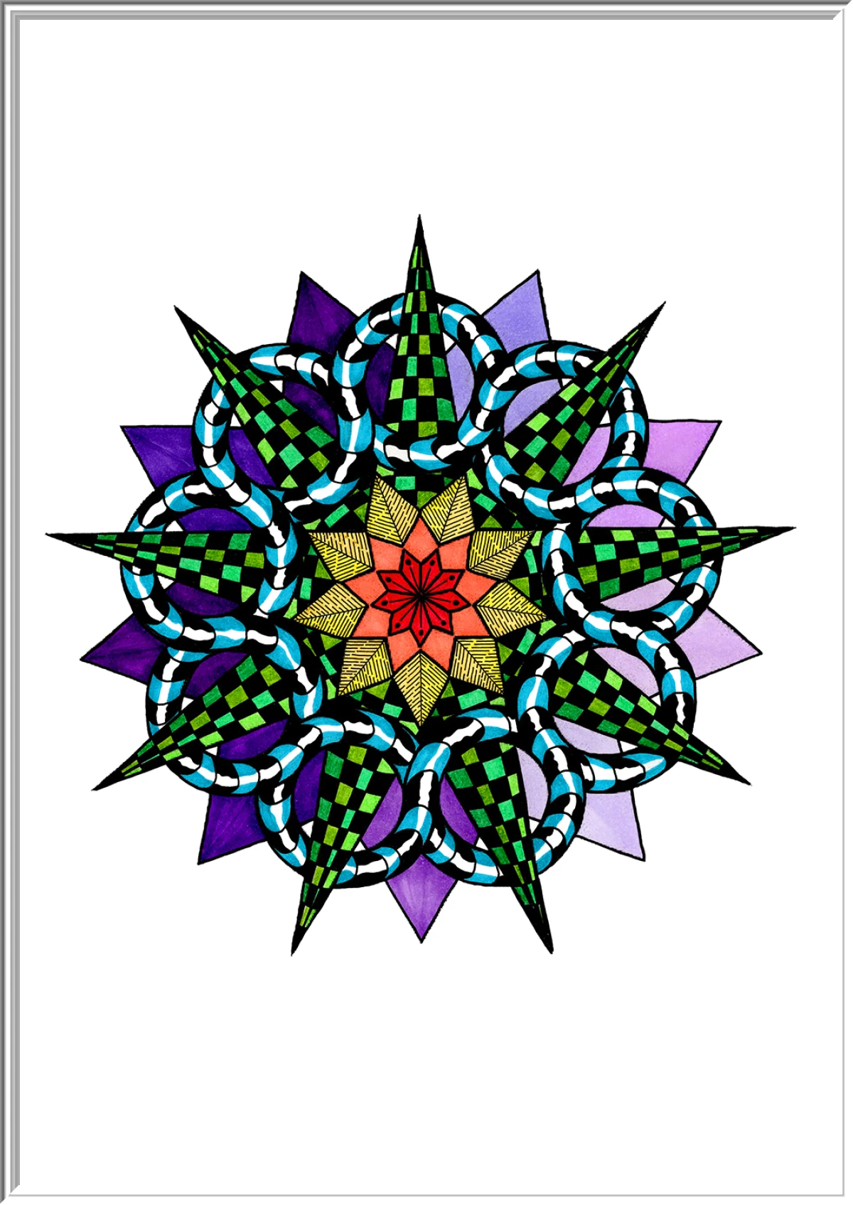 się szachownicą (czarno-zieloną) i spiralnymi detalami. Całość wibruje energią