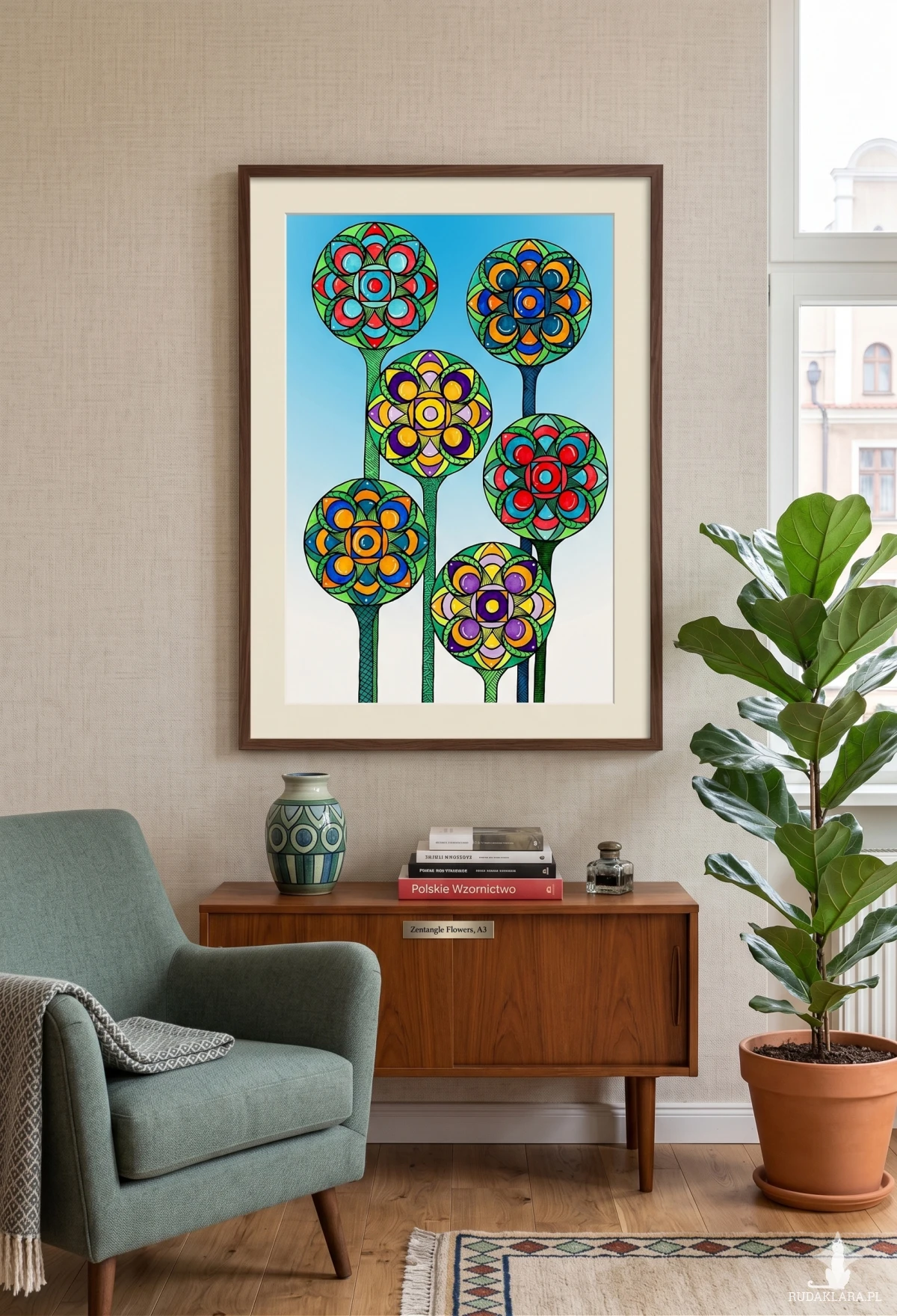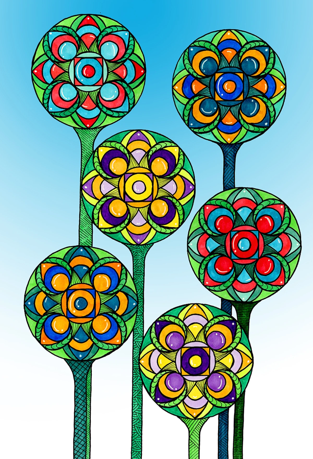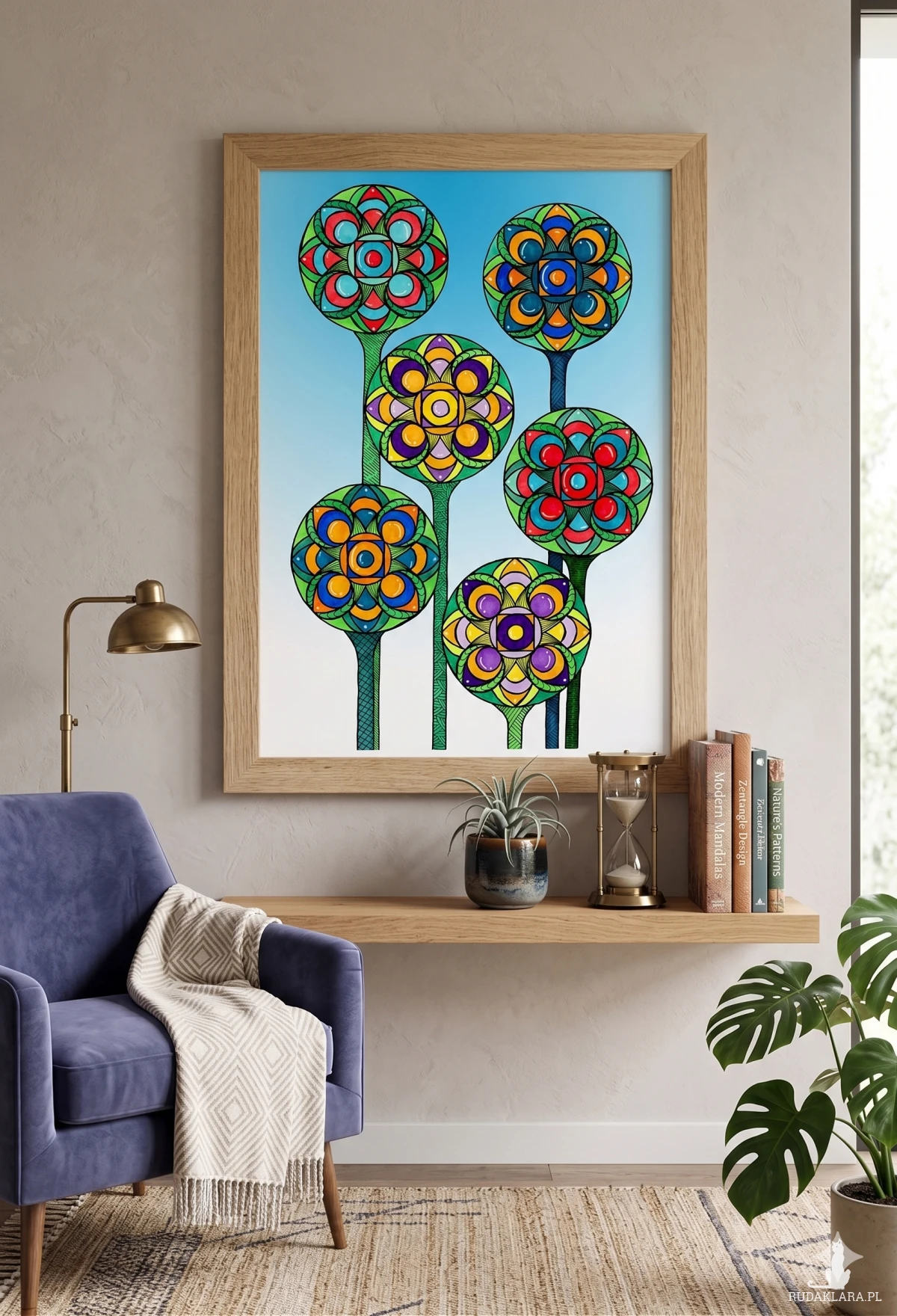 Rysunek przedstawia sześć mandali osadzonych na smukłych, zielonych łodygach, które niczym drzewa lub niezwykłe kwiaty wyrastają ku niebu. Każda mandala jest unikatowa – zbudowana z geometrycznych wzorów i kontrastowych barw, od czerwieni, błękitów i fioletów po żółcie i zielenie. Kompozycja emanuje harmonią i energią, a zarazem łączy naturalny motyw roślinny z duchowym symbolem mandali. To wizualna metafora rozkwitu wewnętrznej równowagi i piękna.