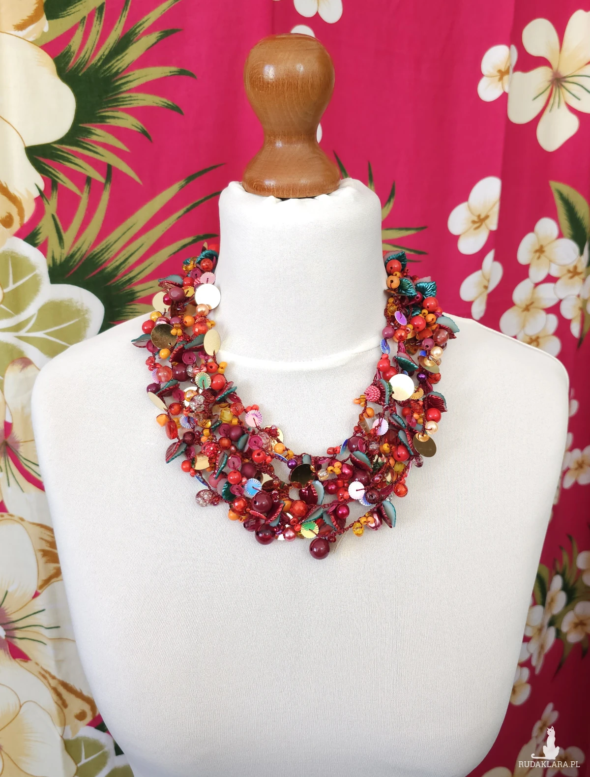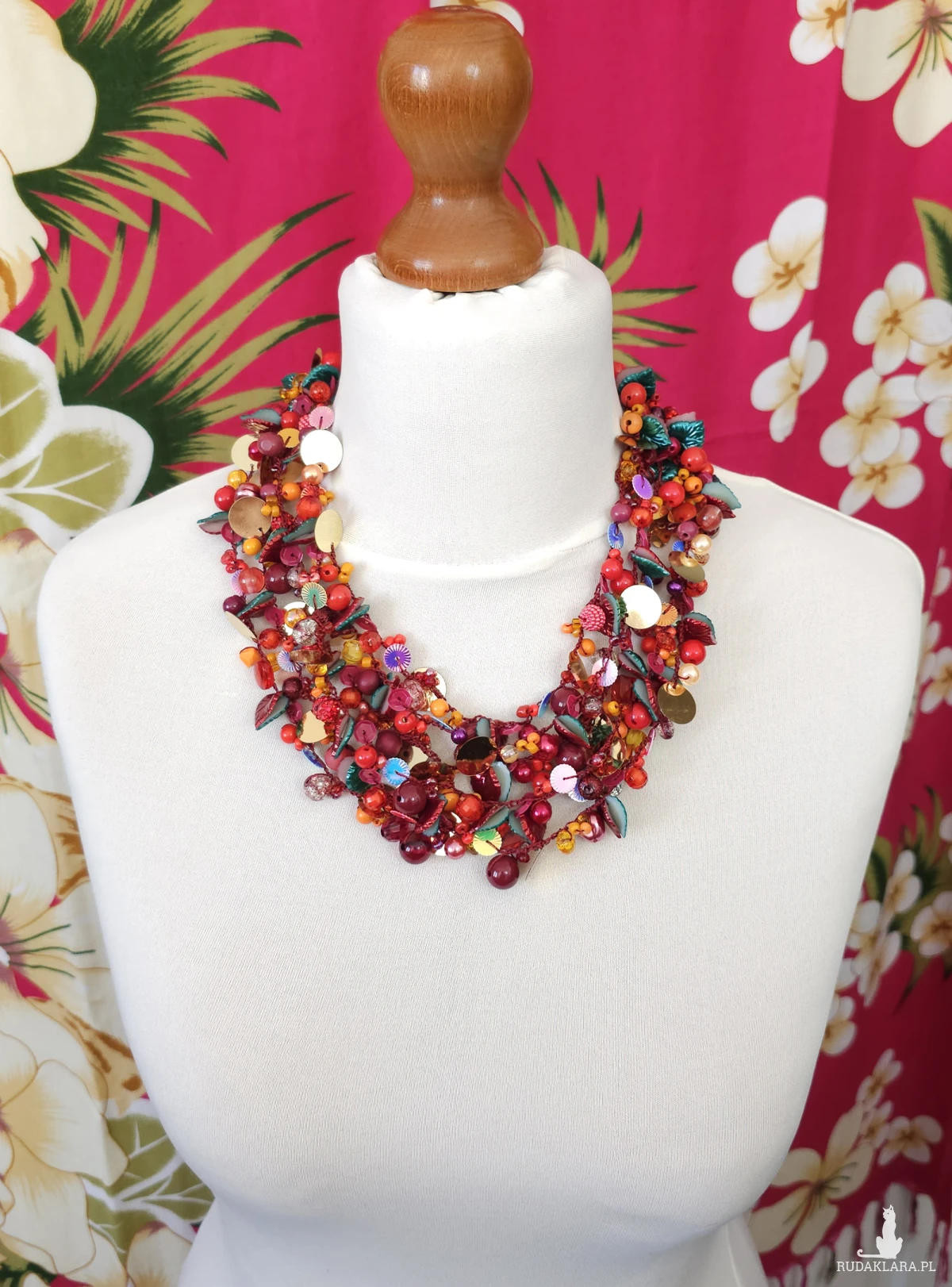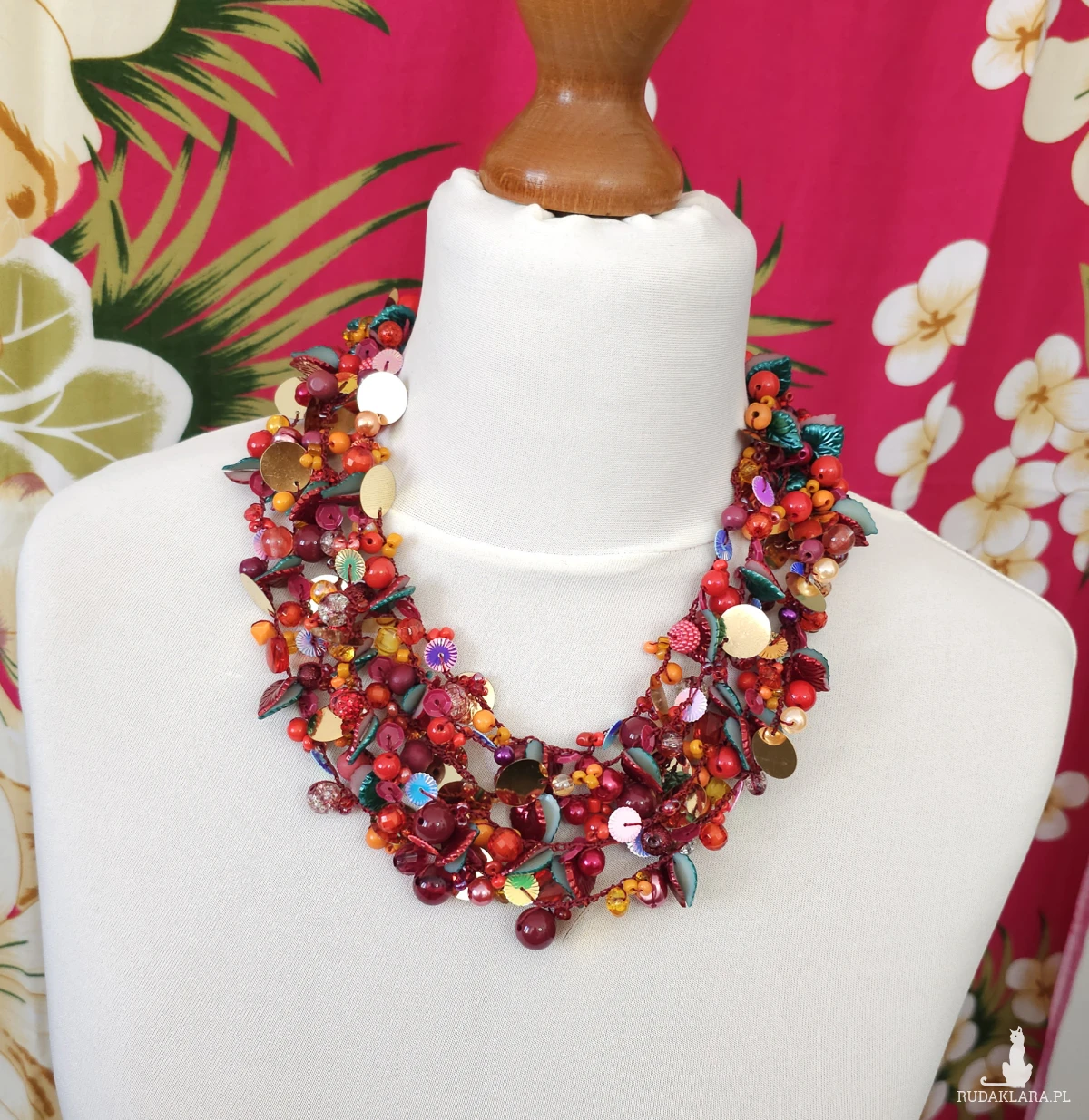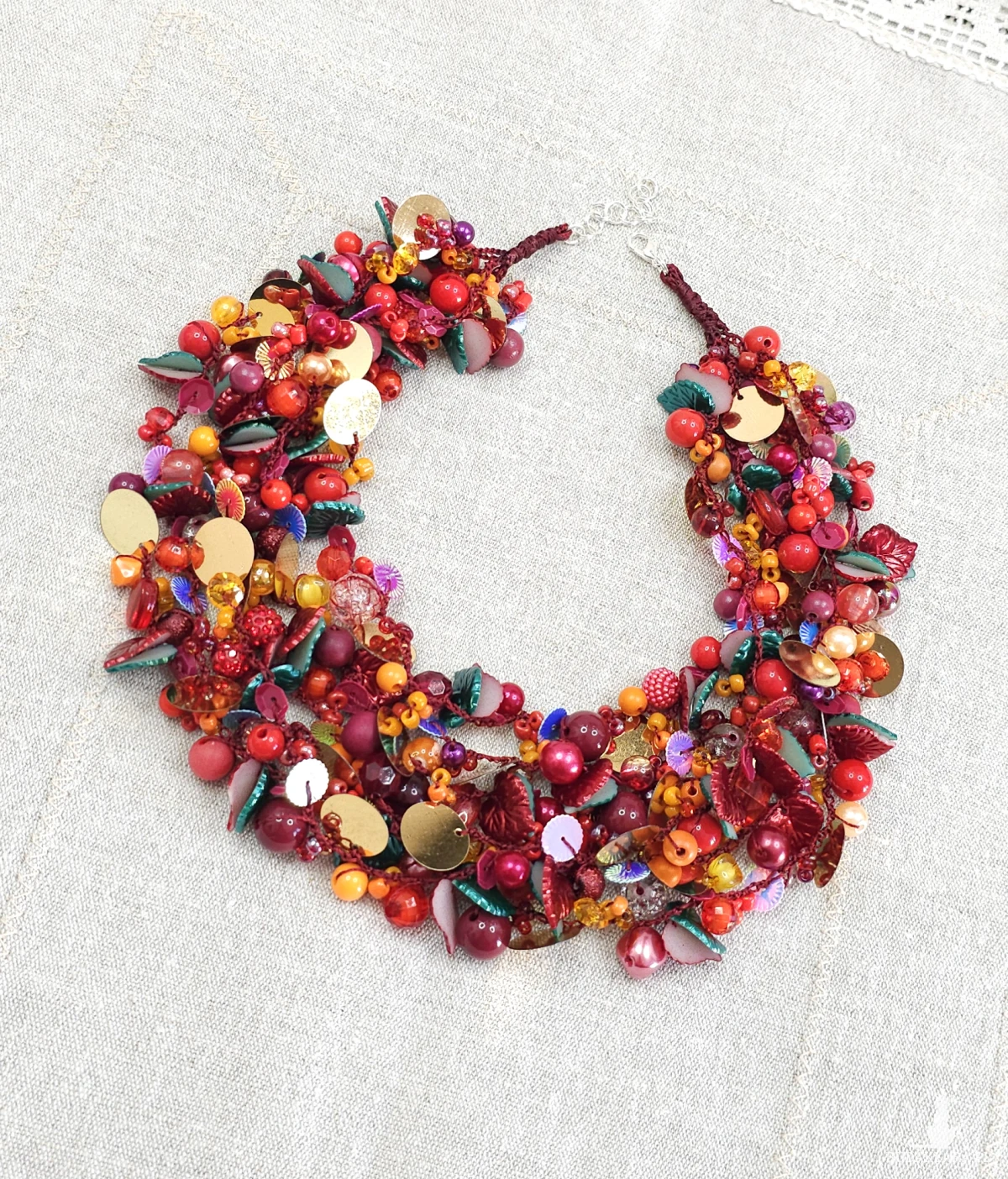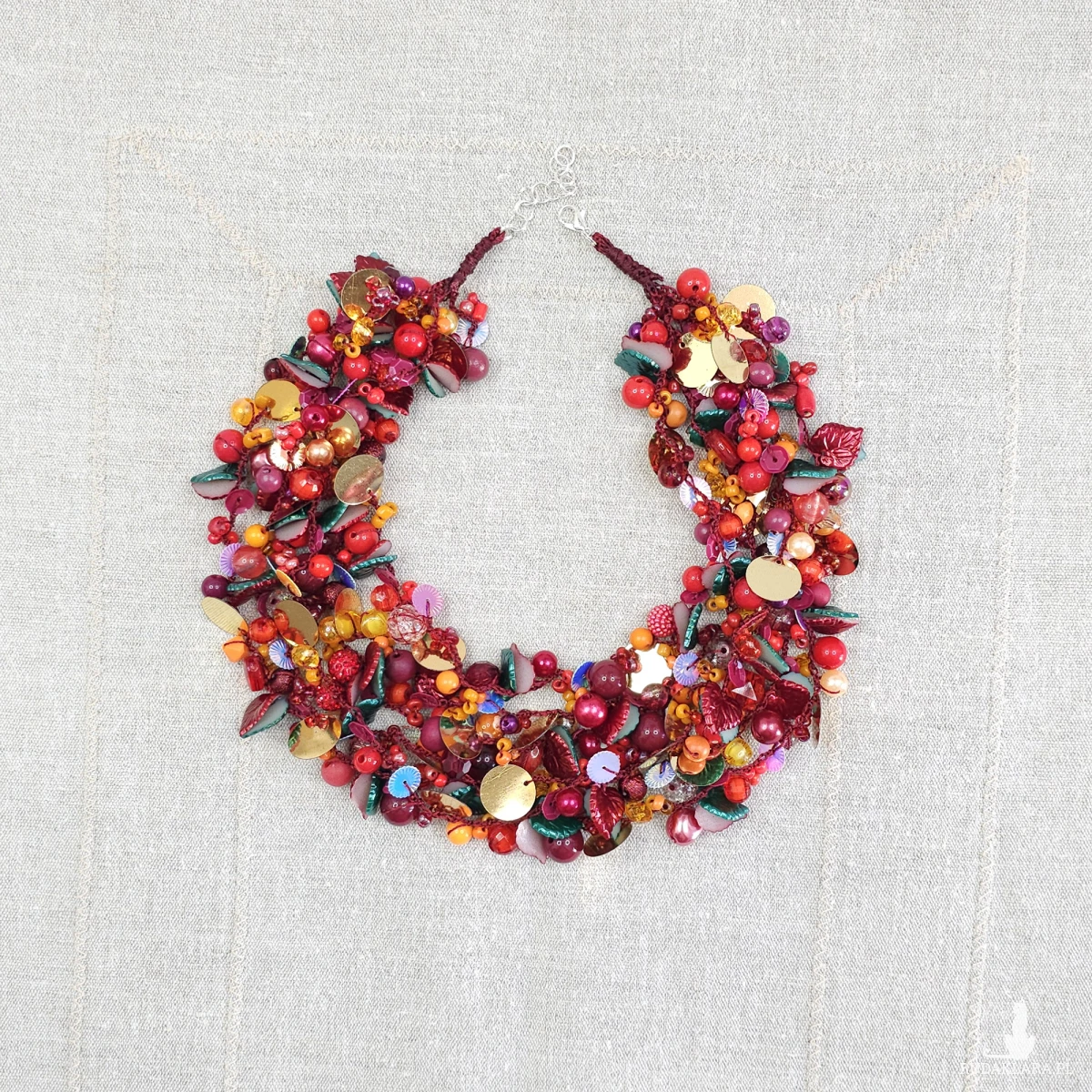Opiera się na gęstym splocie setek elementów: szklanych koralików, akrylowych listków, lśniących cekinów oraz metalowych, lustrzanych blaszek w kolorze złota. Całość utrzymana w intensywnej palecie czerwieni, oranżu i złota, przełamana ciemną zielenią.