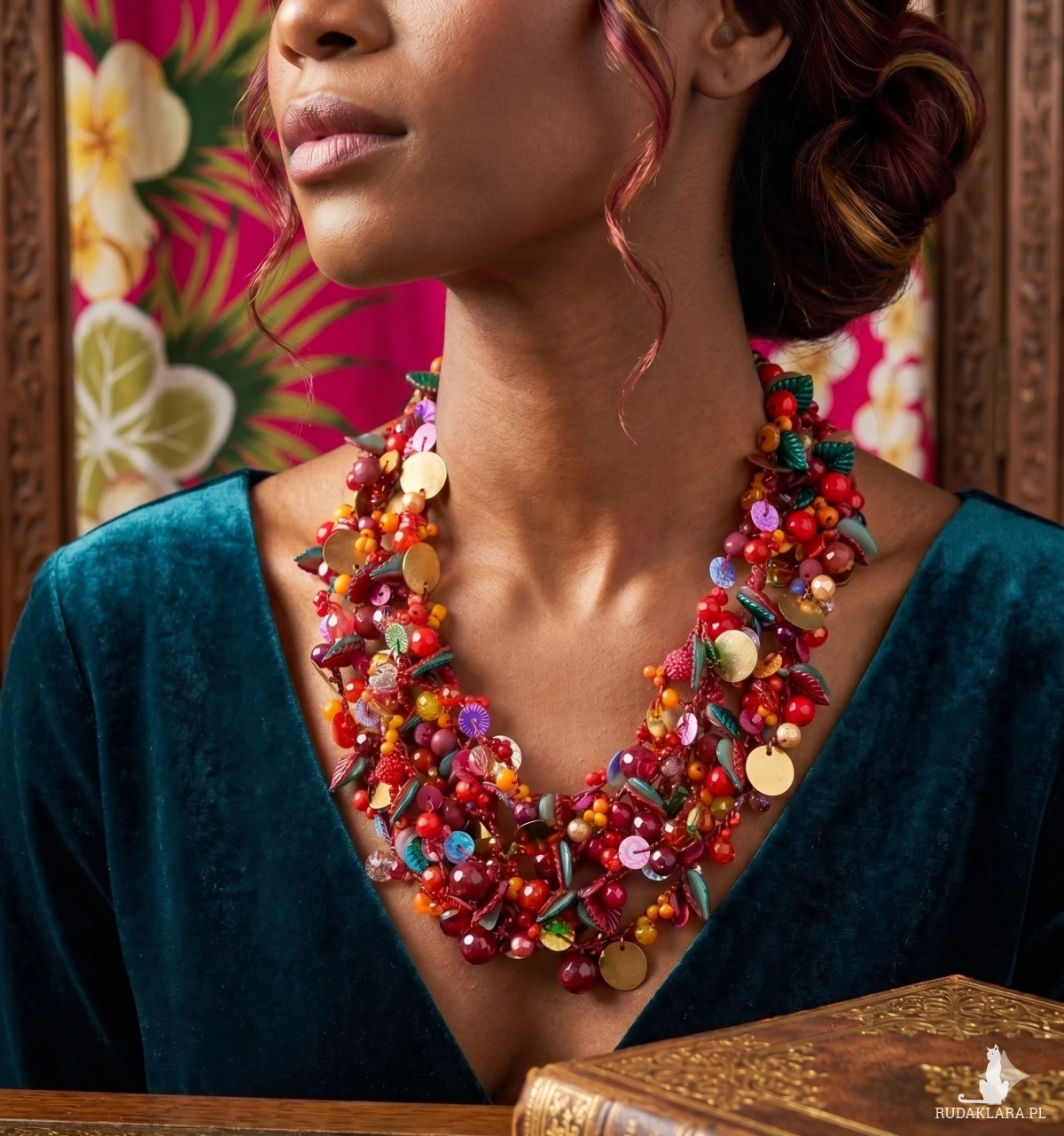 Bogaty, wielowarstwowy naszyjnik typu statement.