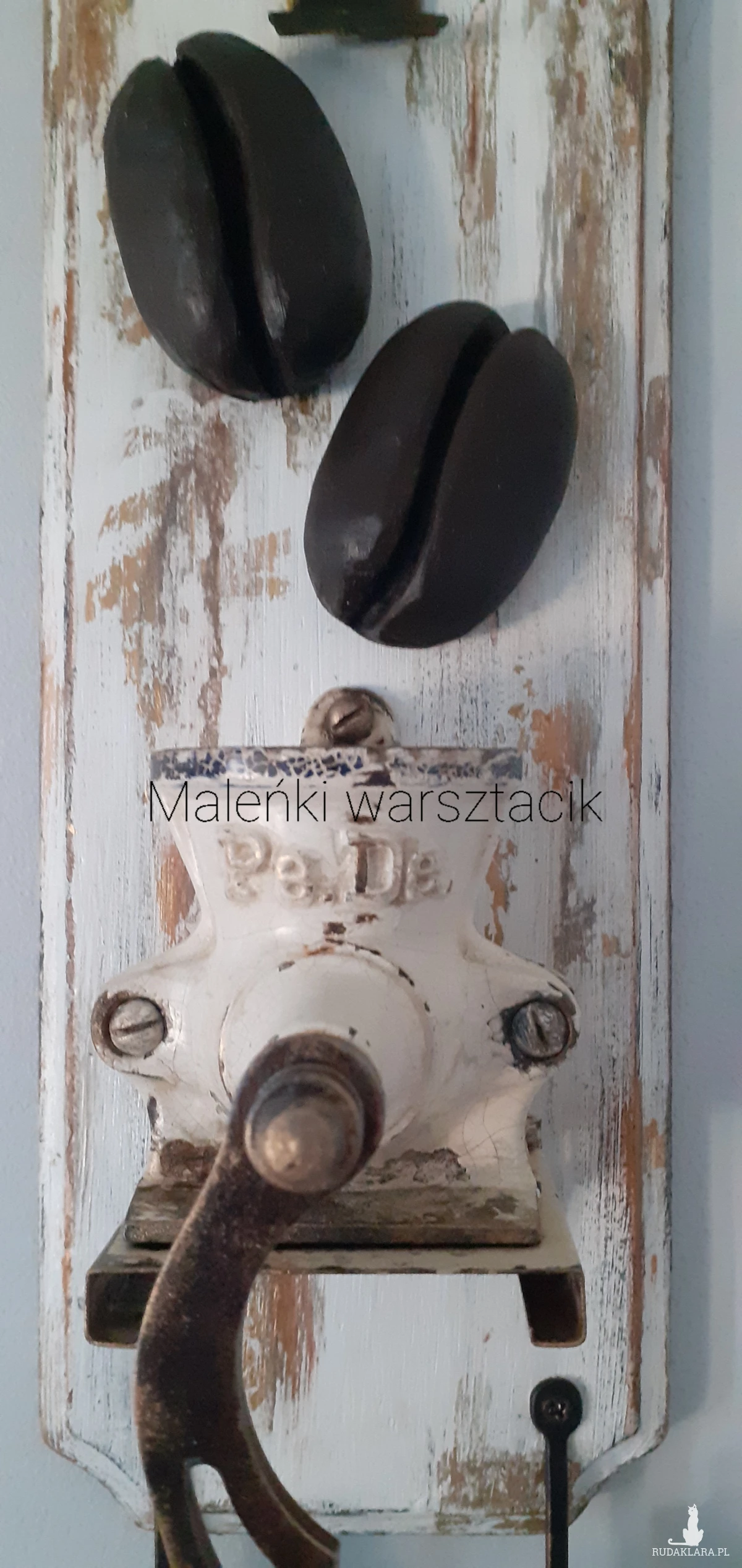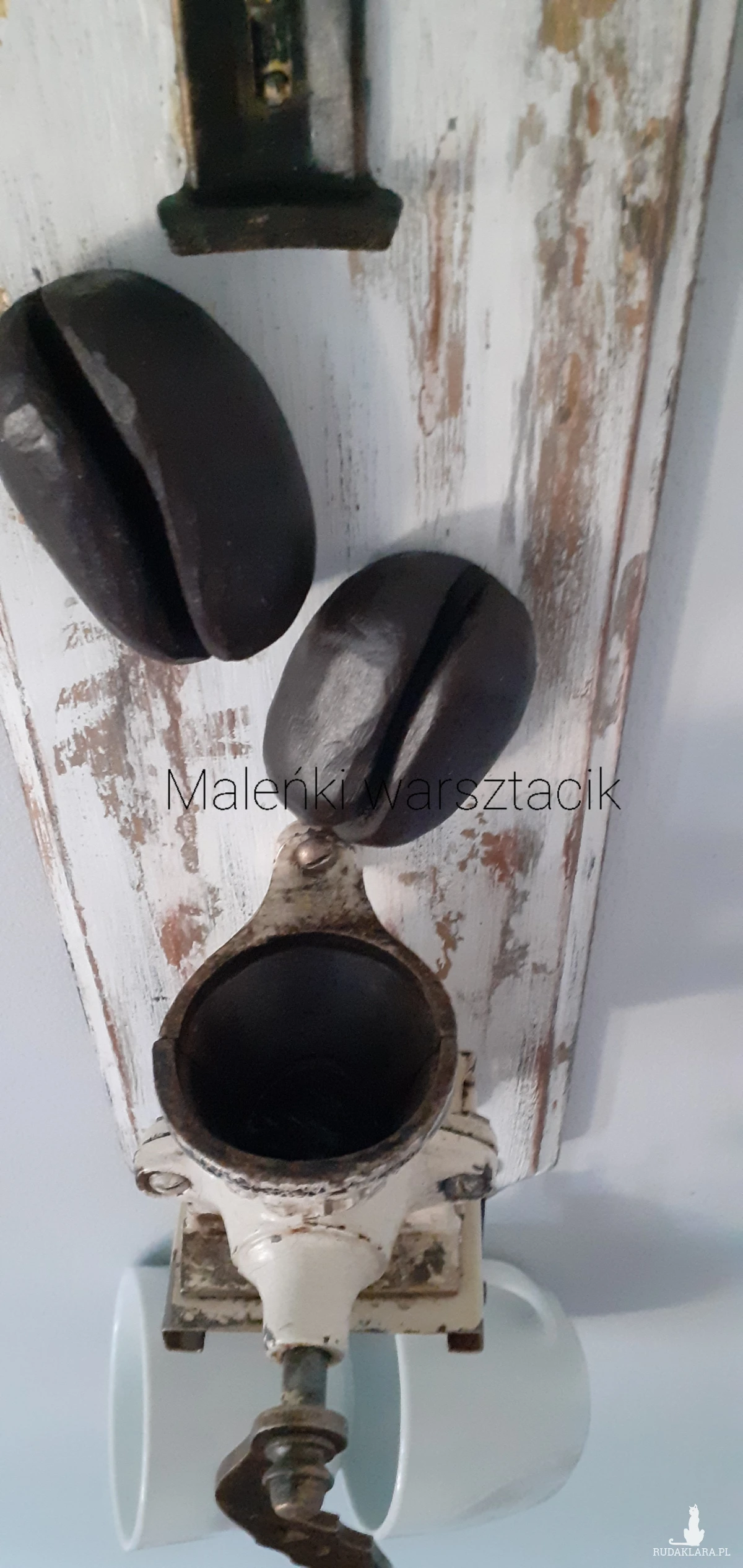 - Detale: Na desce umieszczono dwa wyrzeźbione z drewna lipowego ziarna kawy.