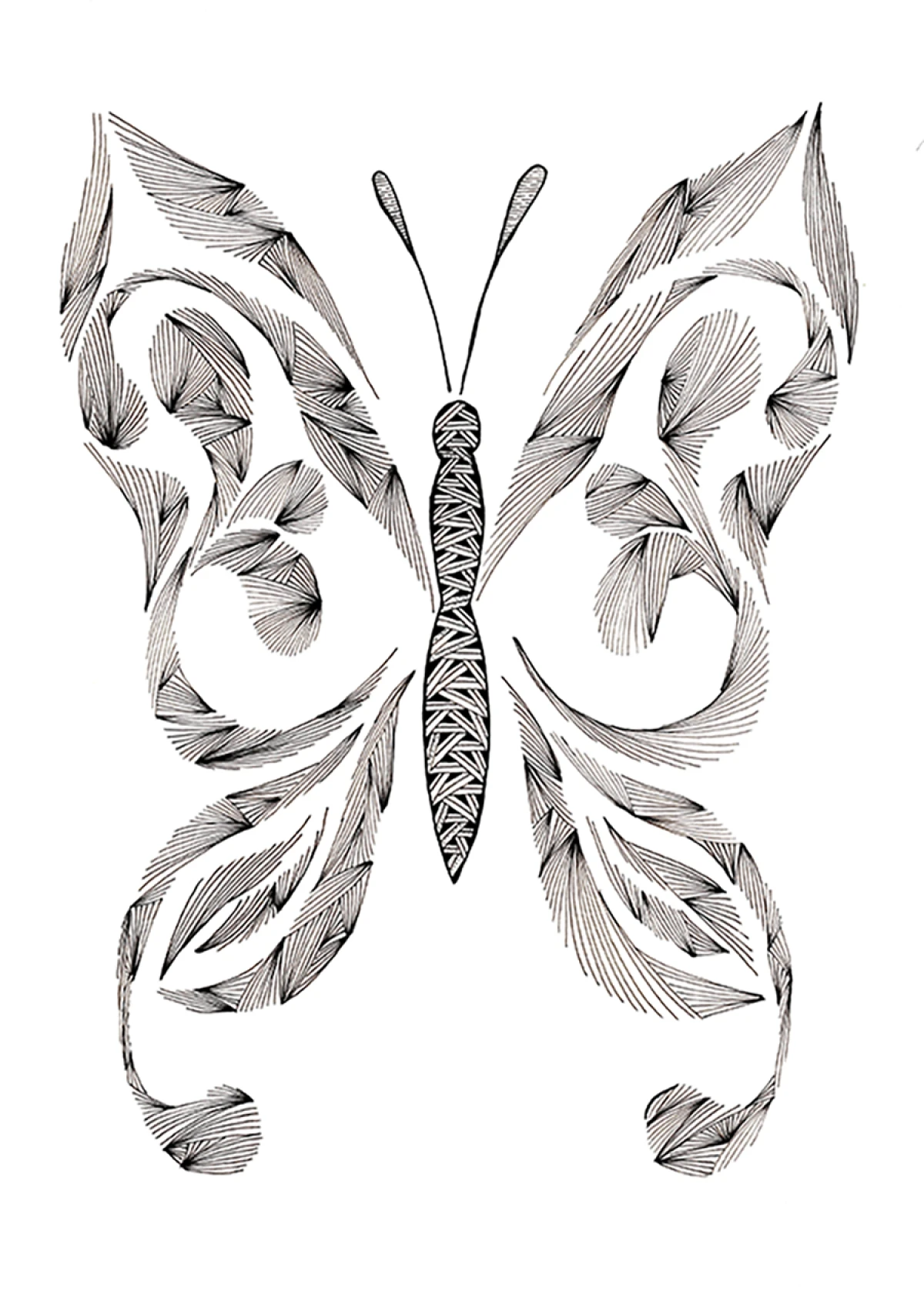 Delikatna, graficzna ilustracja motyla wykonana w całości przy użyciu liniowego wzoru w czerni i bieli.