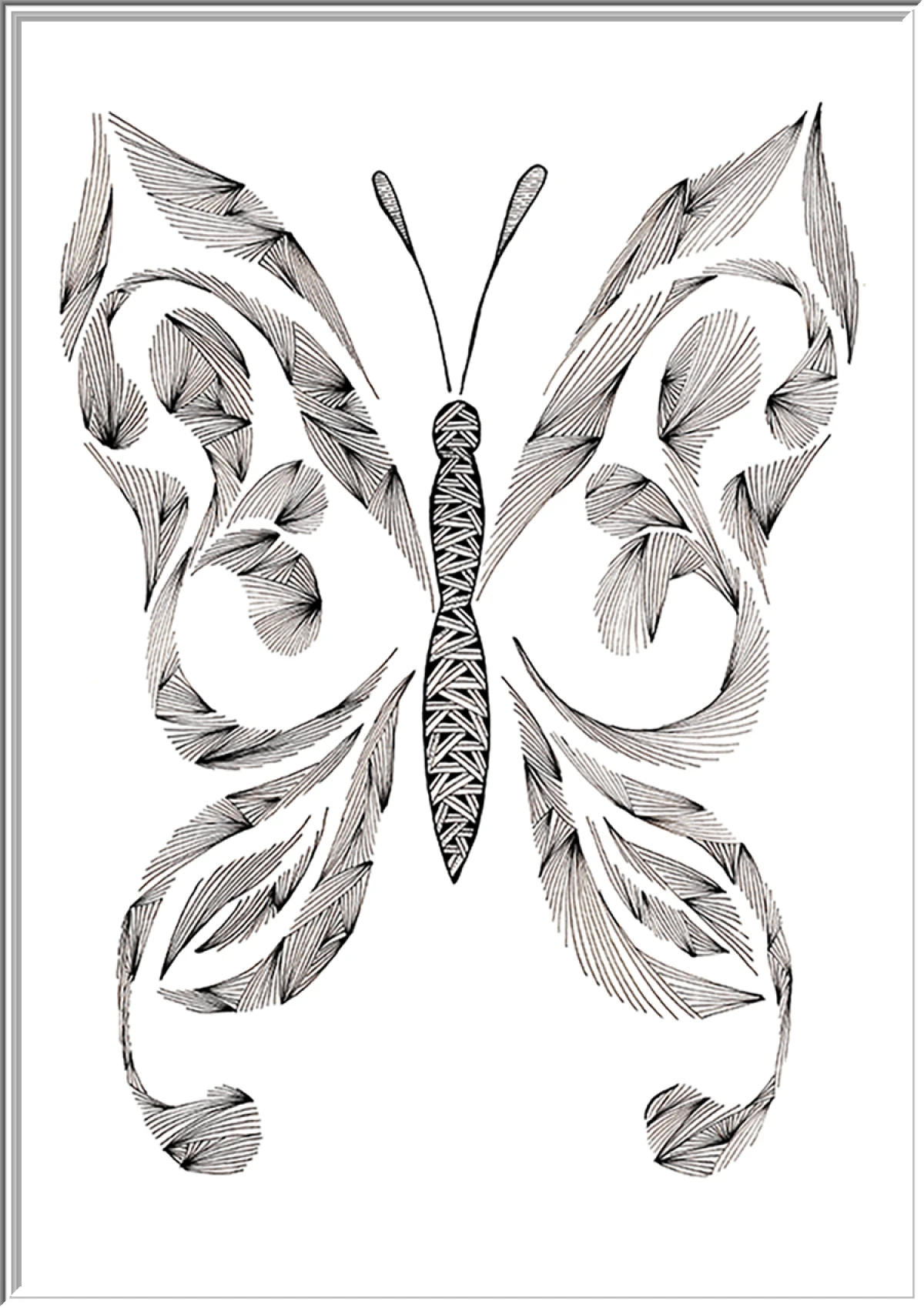 Skrzydła nie są wypełnione kolorem, lecz składają się z gęsto rysowanych, falistych linii, które układają się w wirujące, ażurowe kształty, nadając postaci motyla wrażenie lekkości, ruchu i niemal przejrzystości.