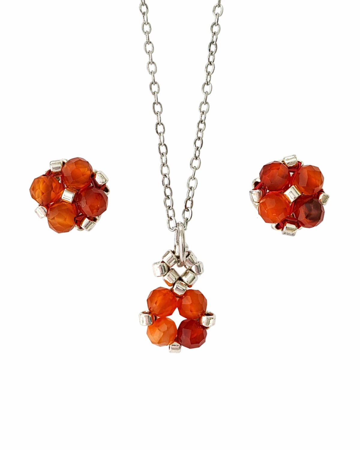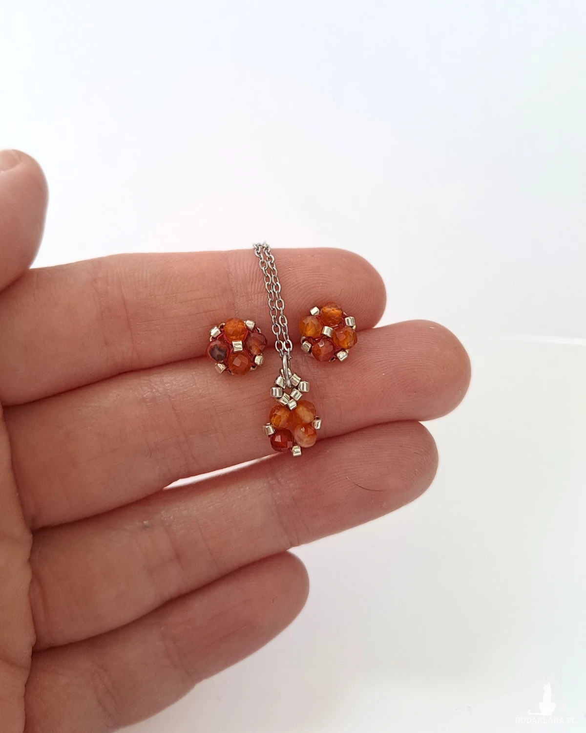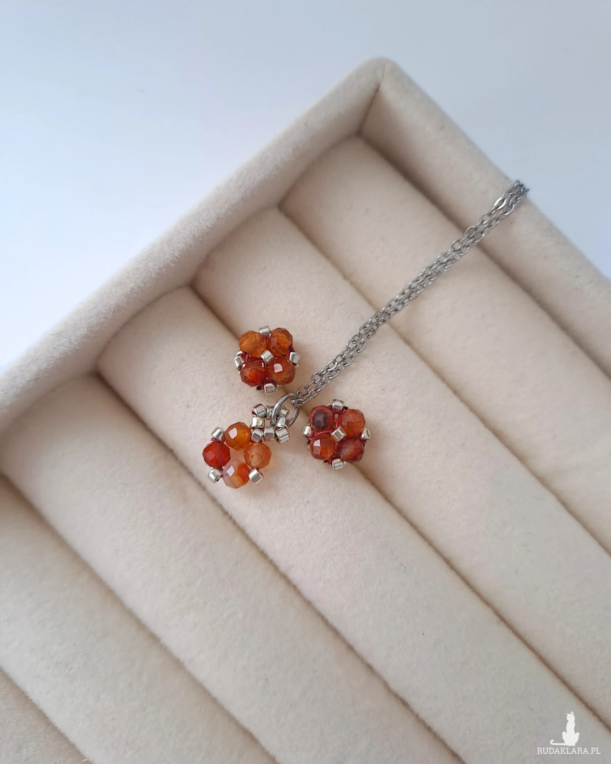 Delikatny komplet z karneolem to połączenie minimalistycznych sztyftów i pasującego naszyjnika, które przyciągają uwagę ciepłym, nasyconym odcieniem pomarańczu i minimalistyczną formą. W połączeniu ze srebrnymi detalami tworzą wyrazistą, ale wciąż subtelną kompozycję.