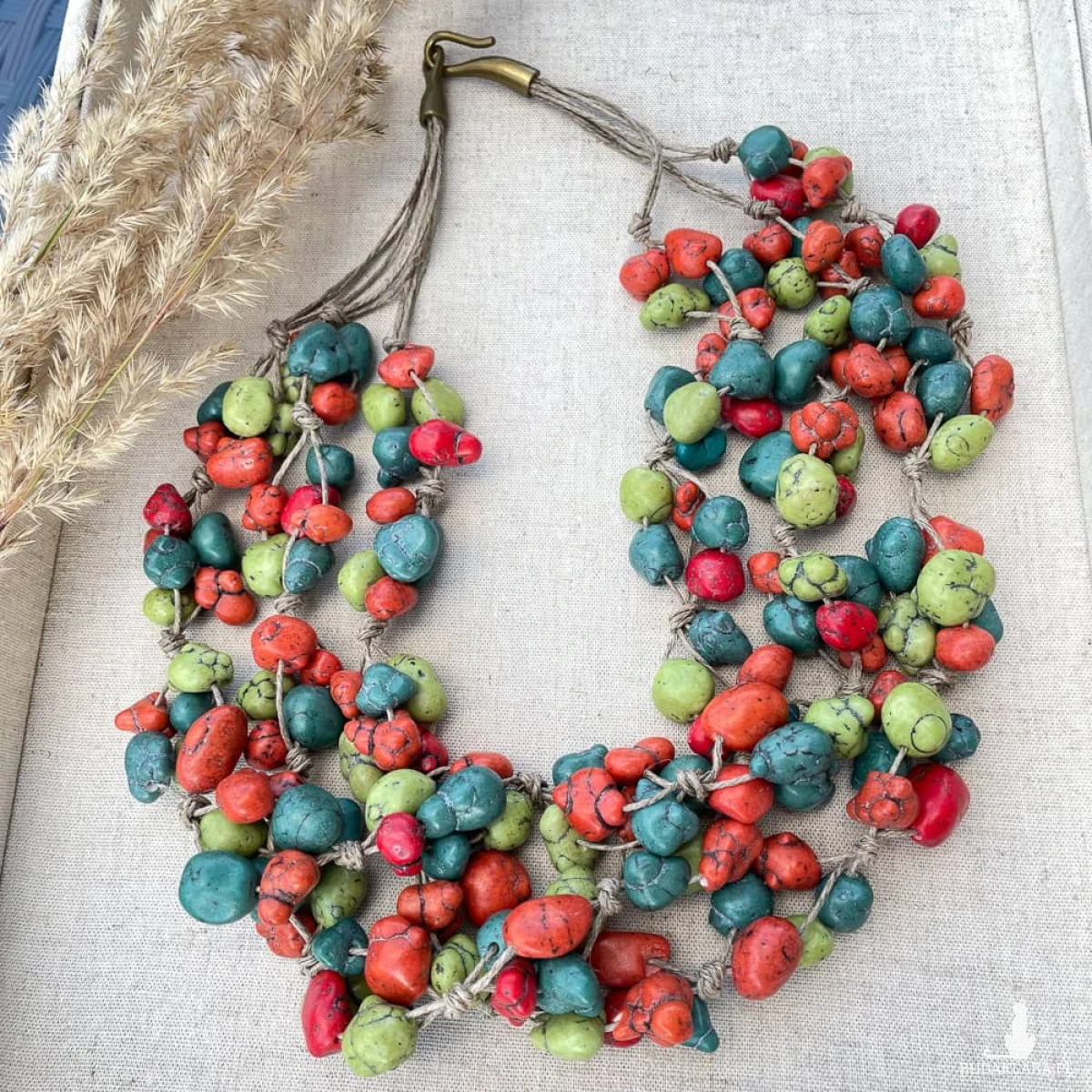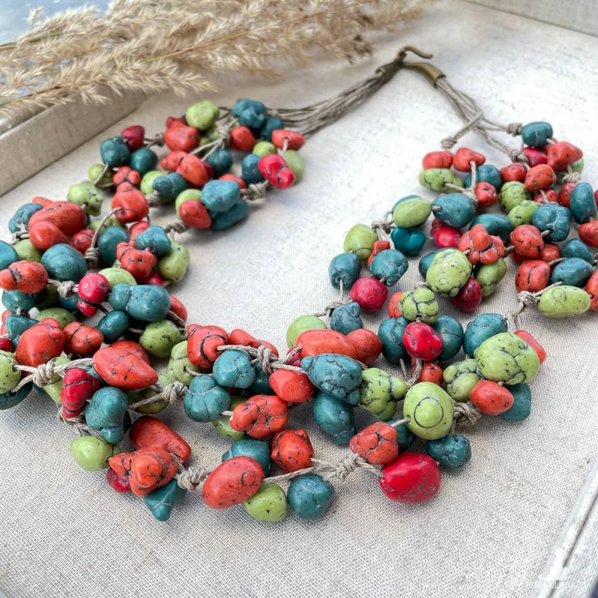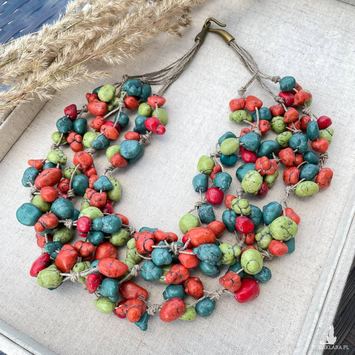 Lniany naszyjnik z howlitem to biżuteria w stylu etnicznym, wykonana z