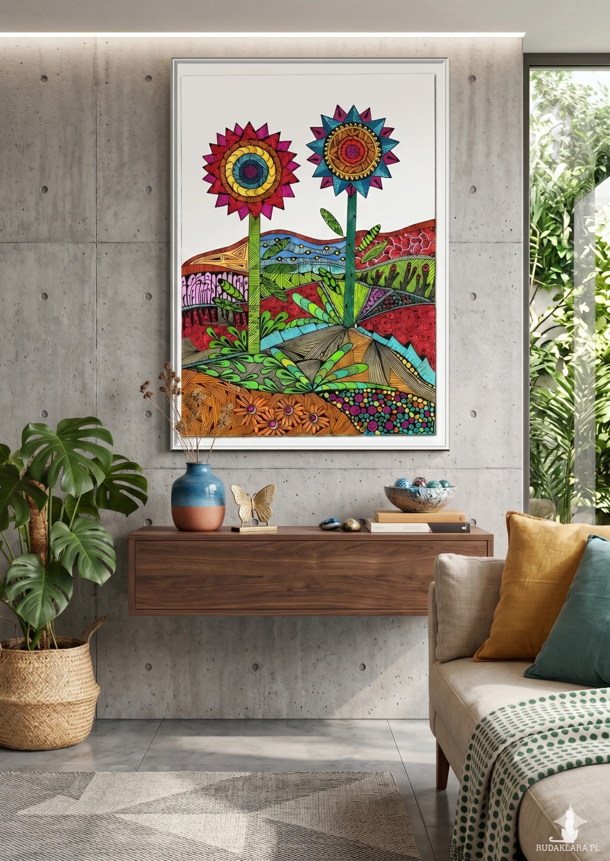Cała dolna część rysunku to złożony patchwork wzorów geometrycznych i organicznych, symbolizujący ziemię, rośliny i pagórki, utrzymany w ciepłych barwach (pomarańcz, czerwień, zieleń).
