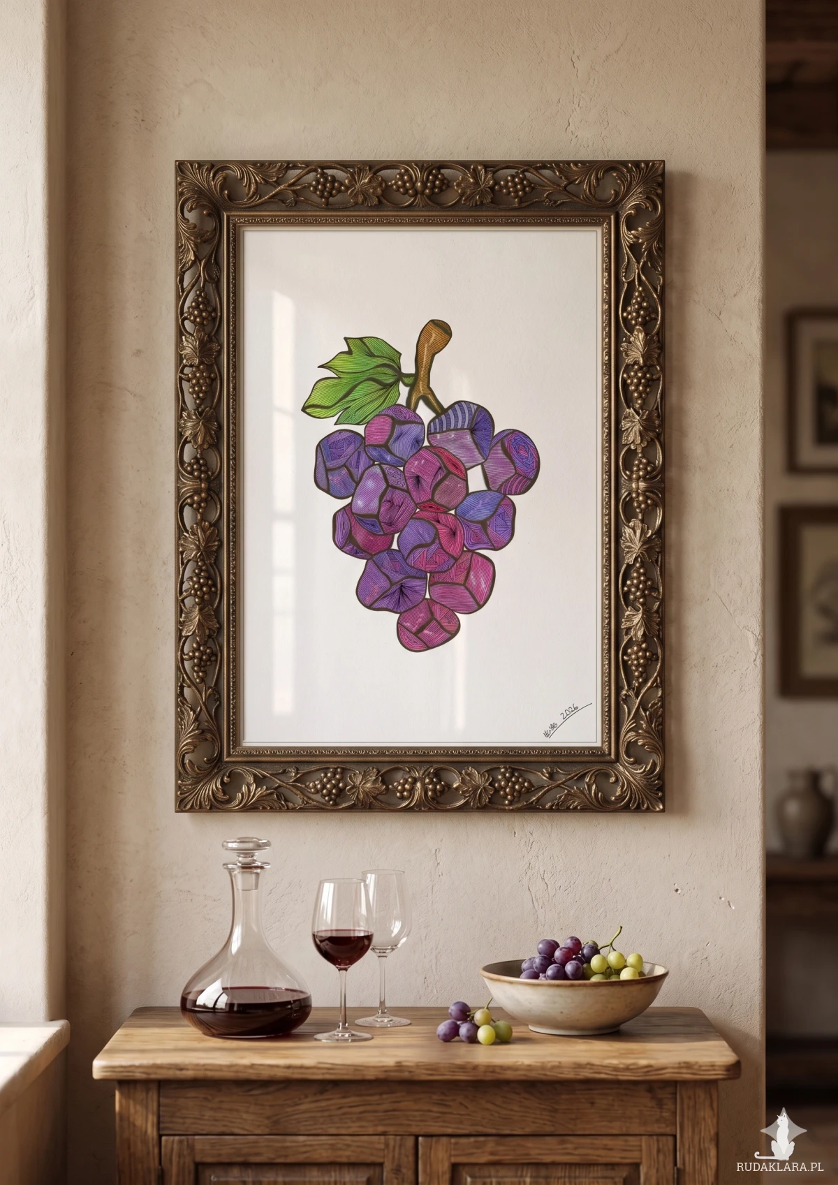 Dekoracyjna grafika przedstawiająca kiść winogron.