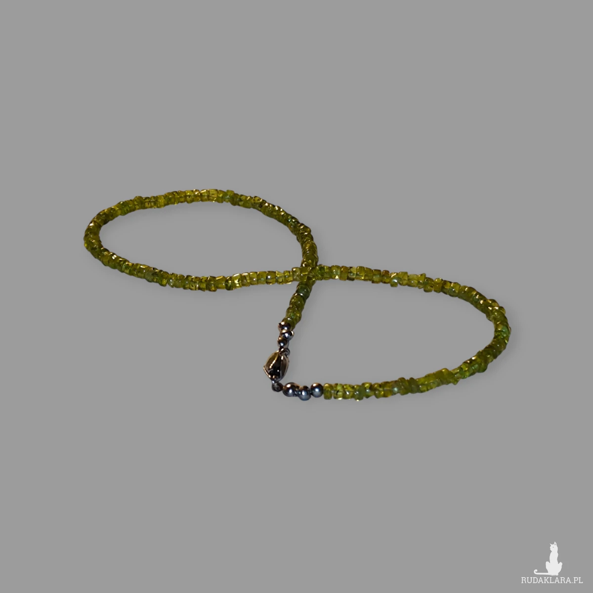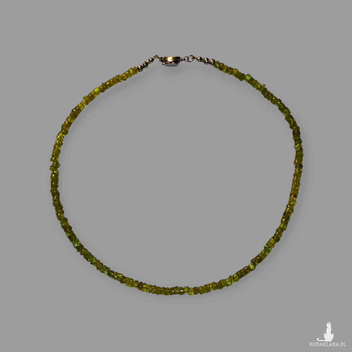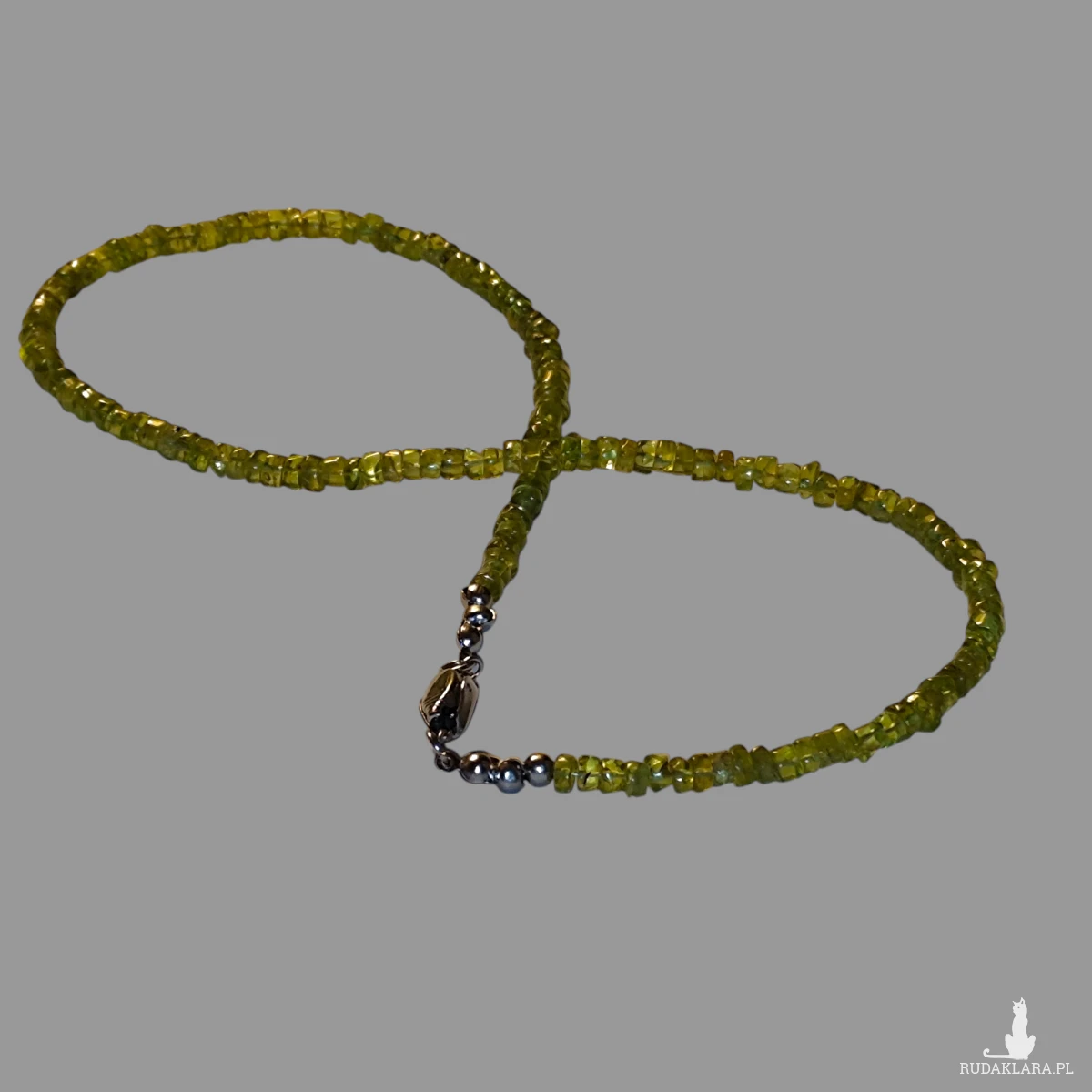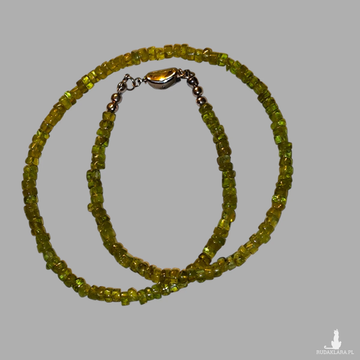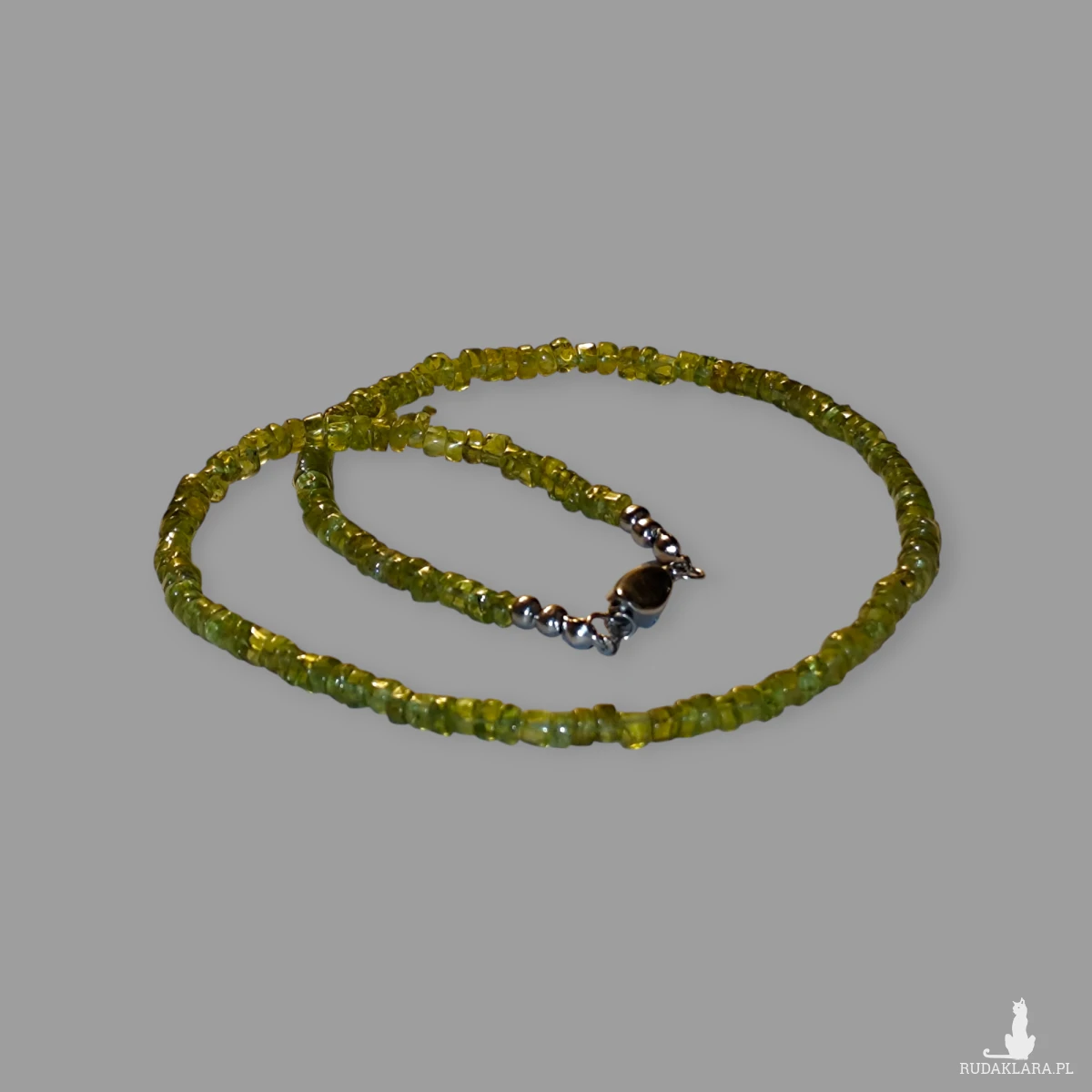 Ten wyjątkowy naszyjnik został wykonany z ręcznie selekcjonowanych, fasetowanych oponek naturalnego peridotu w radosnym odcieniu soczystej zieleni. Kamienie zostały nawleczone na wytrzymałą linkę jubilerską, co gwarantuje trwałość i bezpieczeństwo podczas codziennego noszenia. Całość dopełnia solidne, srebrne zapięcie (próba 925), które zapewnia komfort użytkowania.