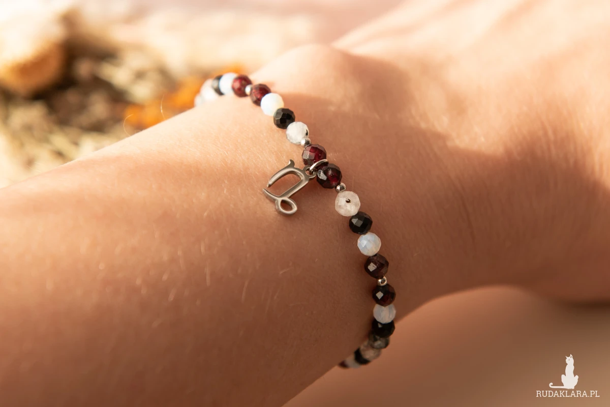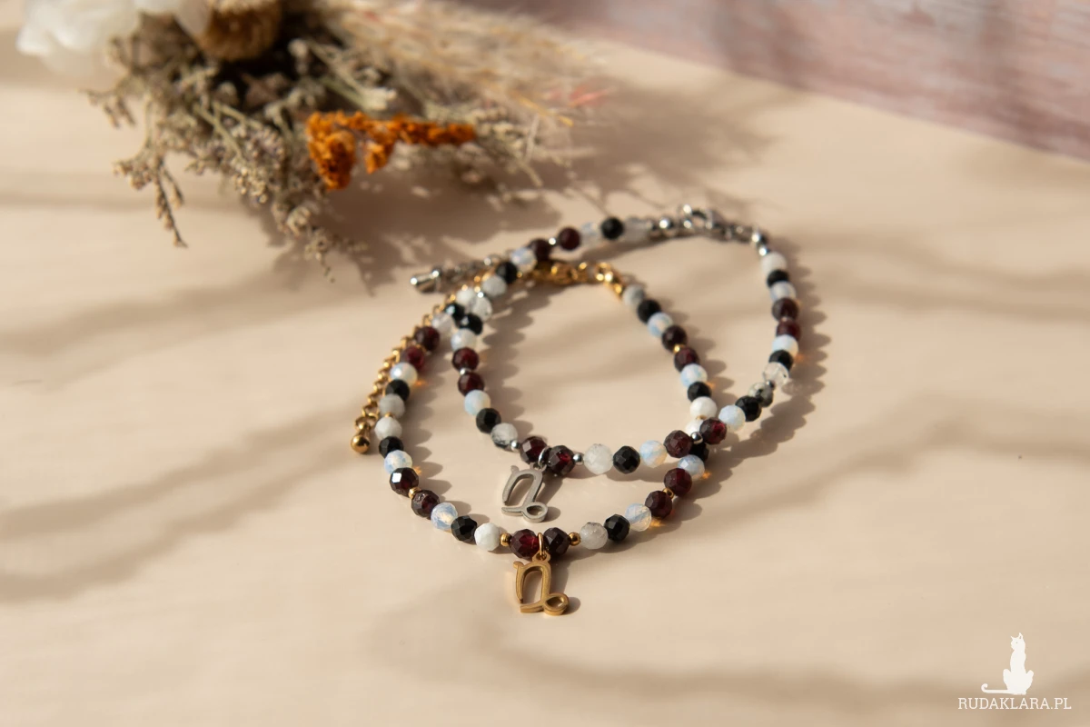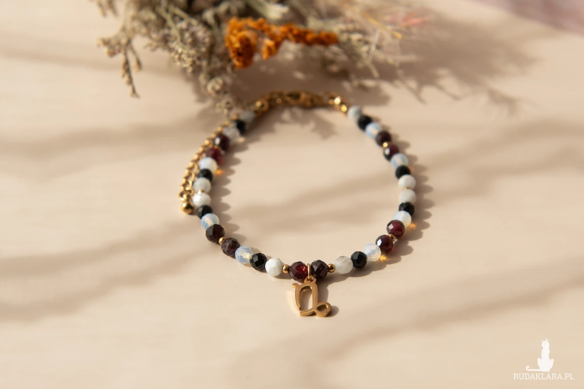 Bransoletka z kolekcji ZODIAC dla Koziorożca ♑️ z kamieni o wielkości ok. 4 mm, z zawieszką i elementami ze stali nierdzewnej. Dostępna do wyboru w kolorystyce złotej lub srebrnej.