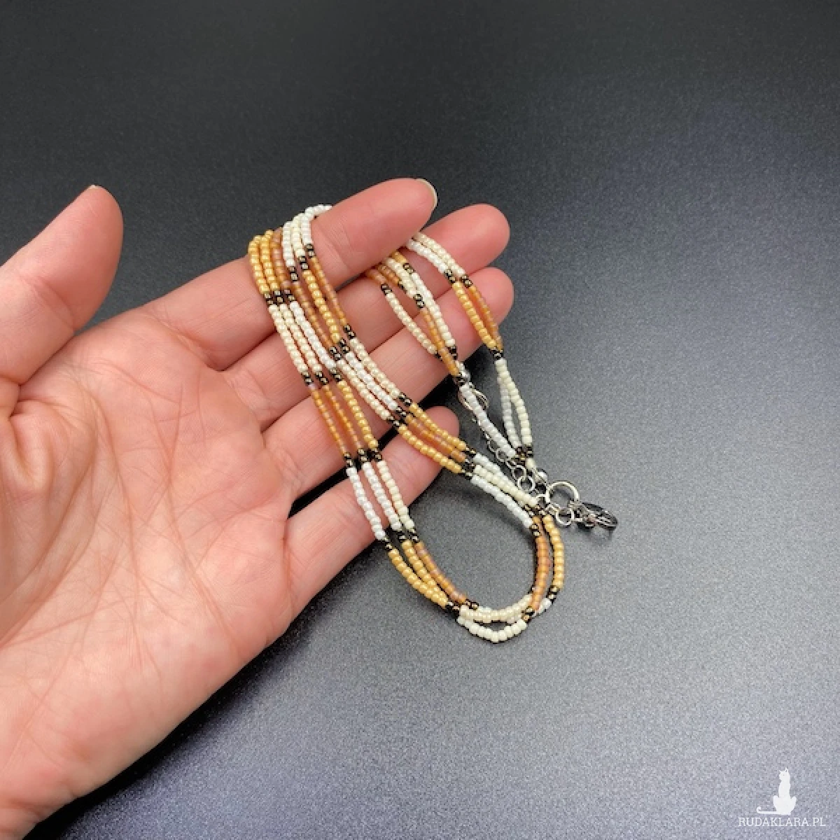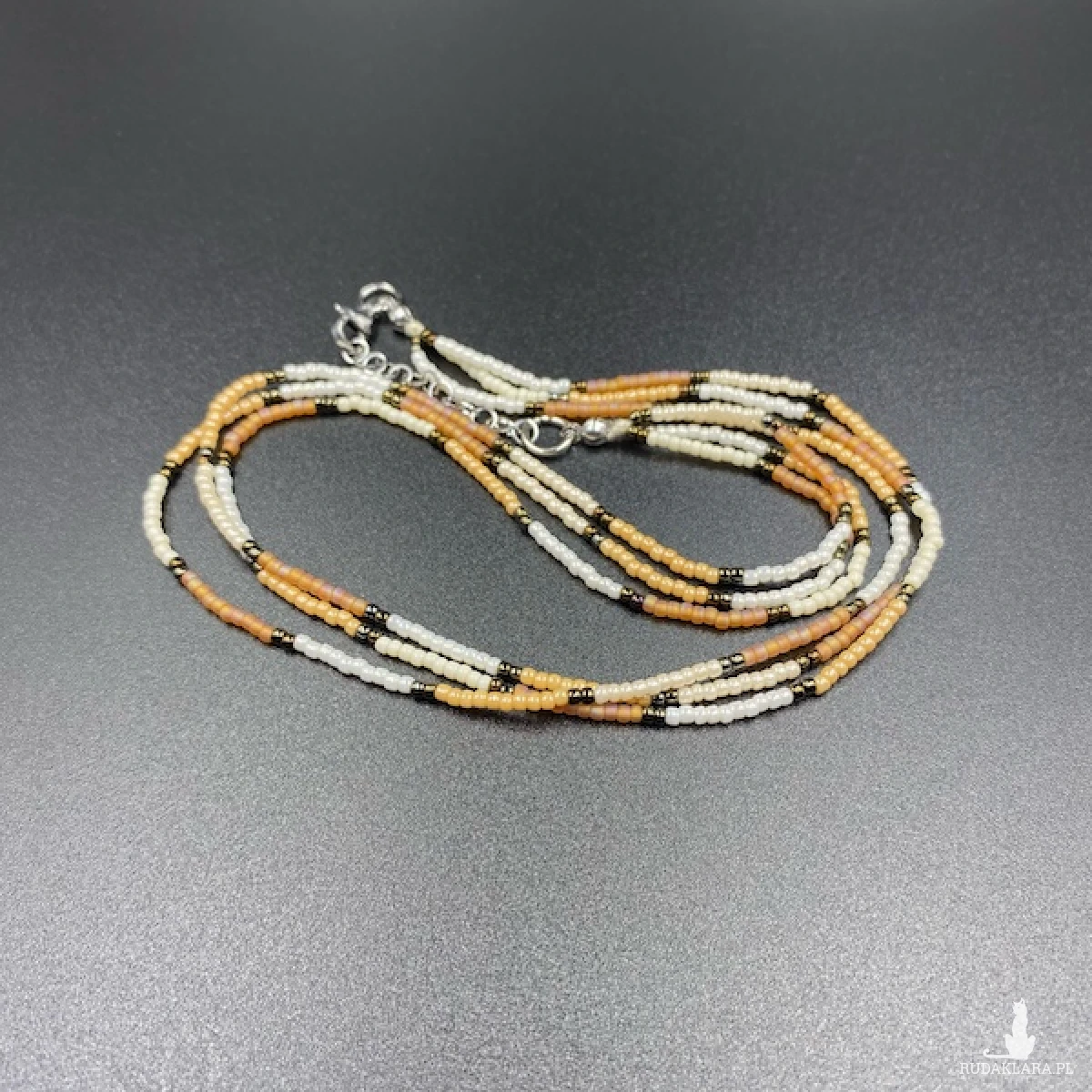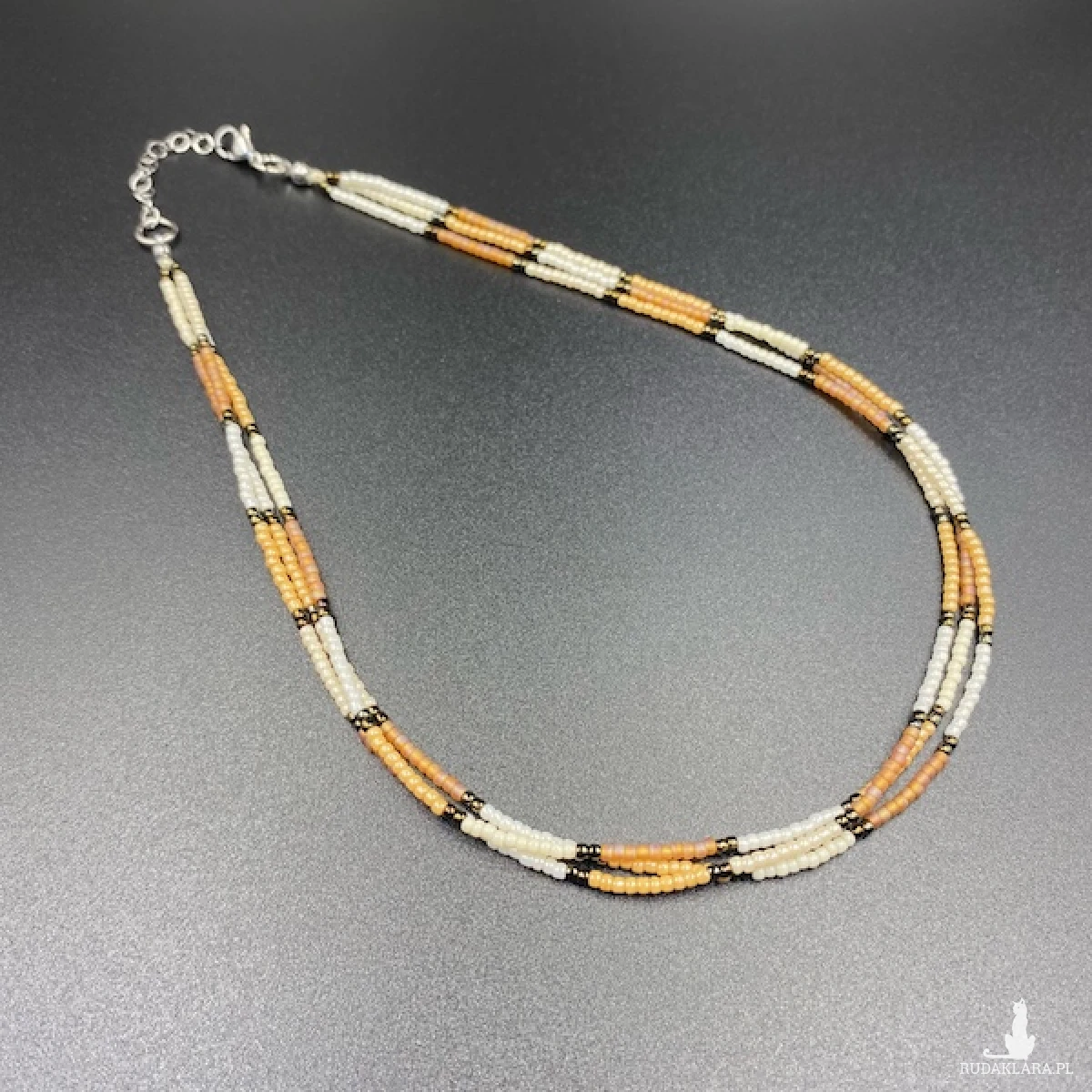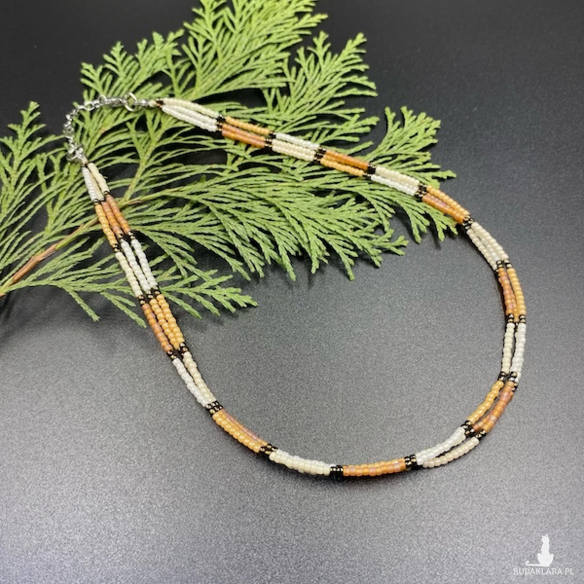 Krótki naszyjnik ( złożony z trzech sznurów ) został wykonany ręcznie ze szklanych koralików w kolorze; jasny brązowy, beżowy, kremowy, metaliczny ciemny brąz.