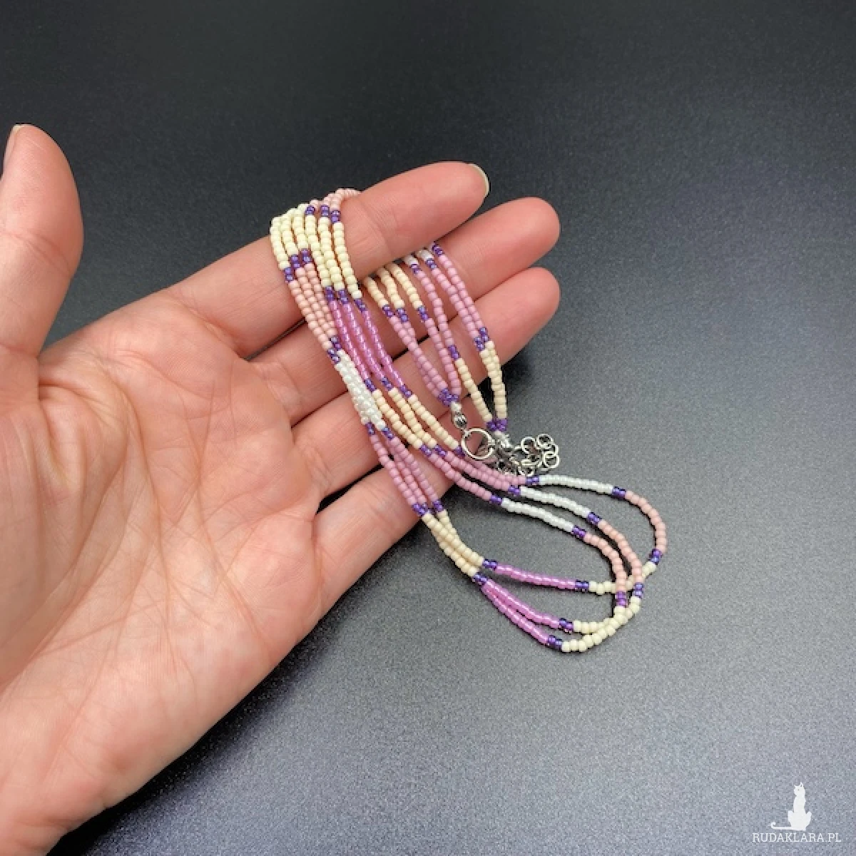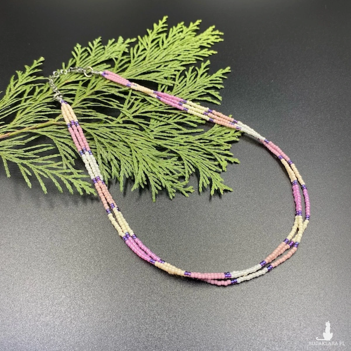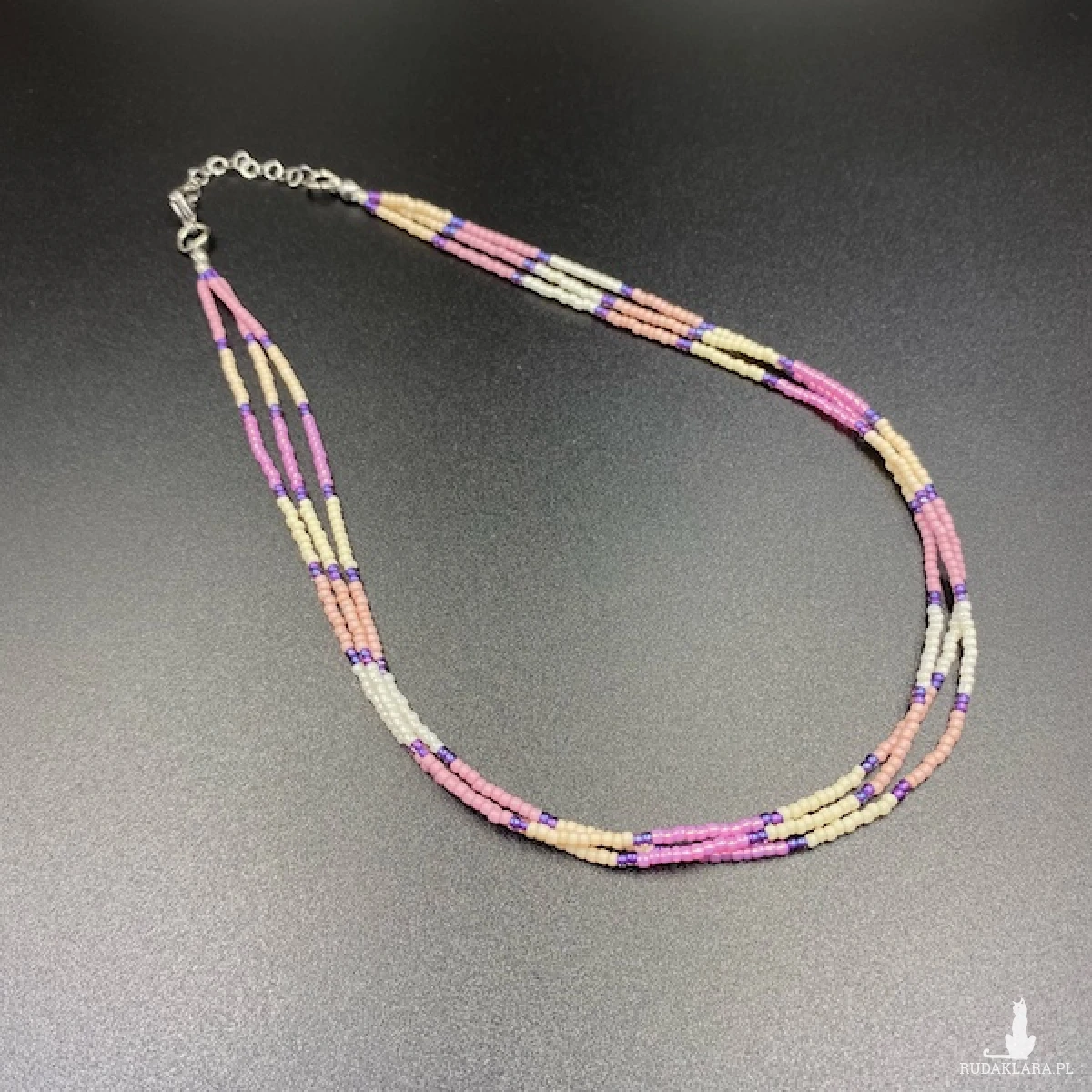 Krótki naszyjnik ( złożony z trzech sznurów ) został wykonany ręcznie ze szklanych koralików Toho w kolorze; odcienie różu, fiolet, kremowy.