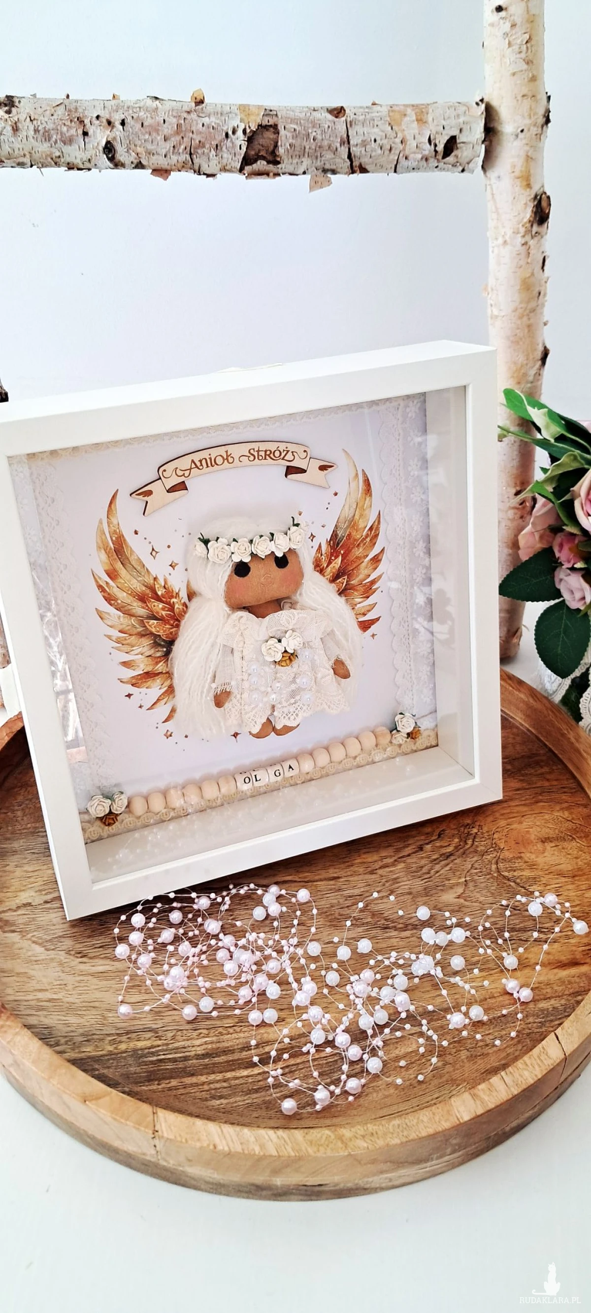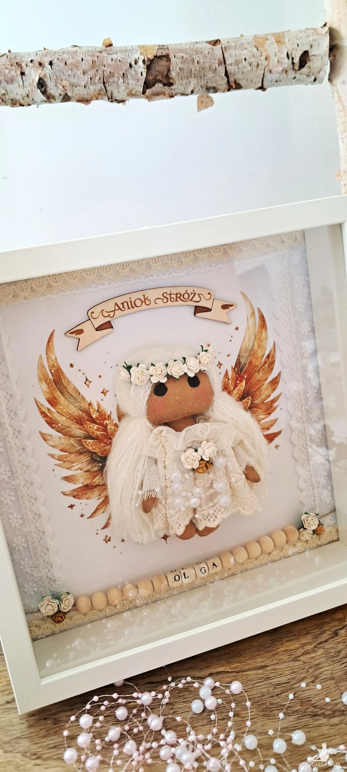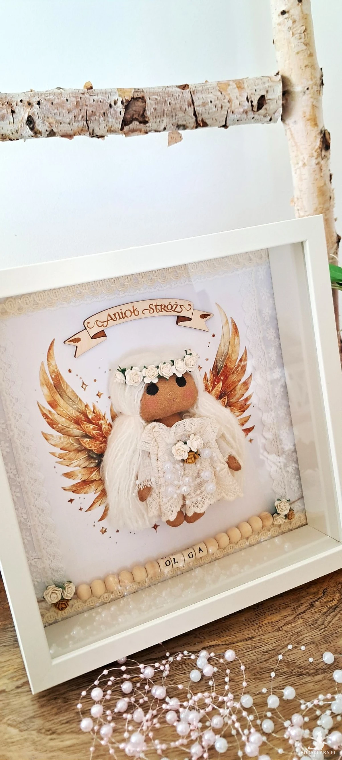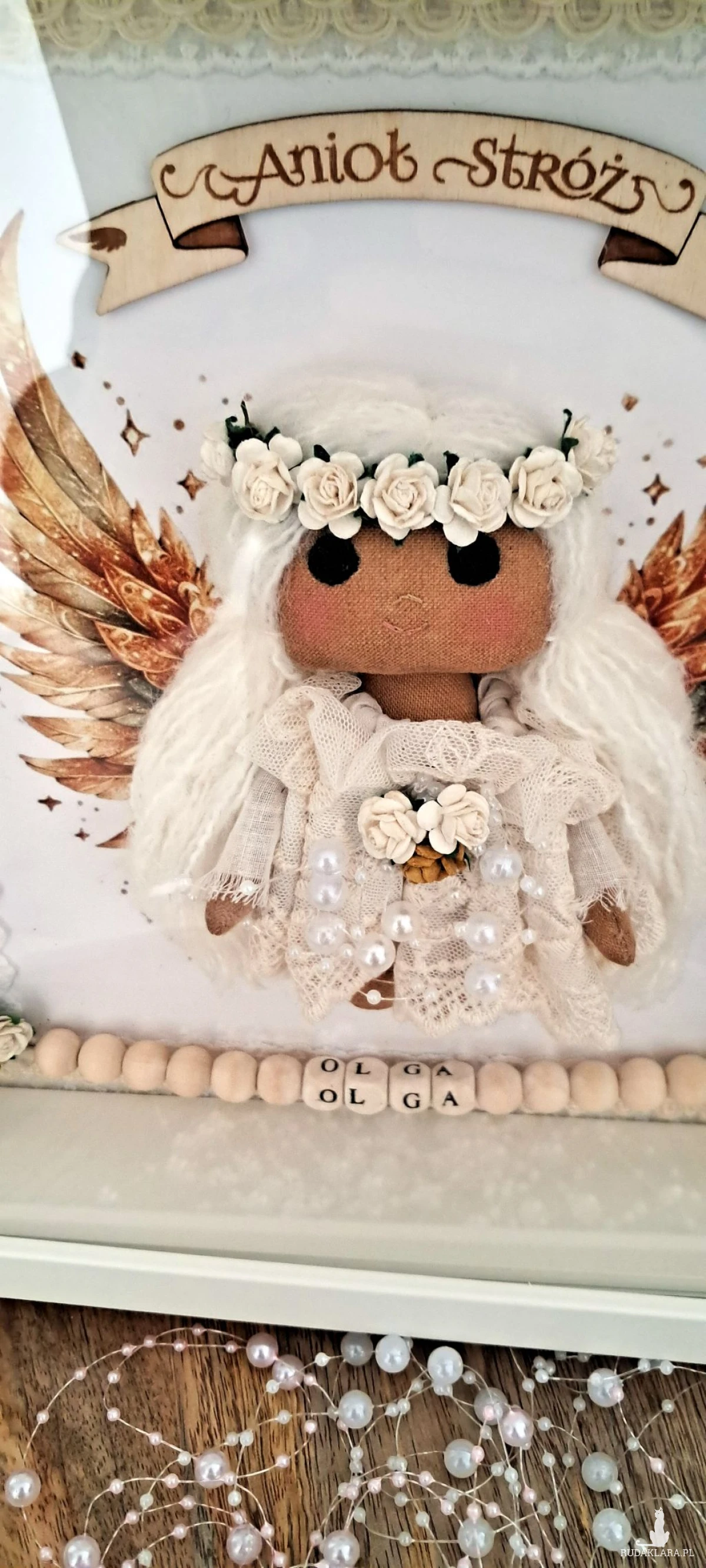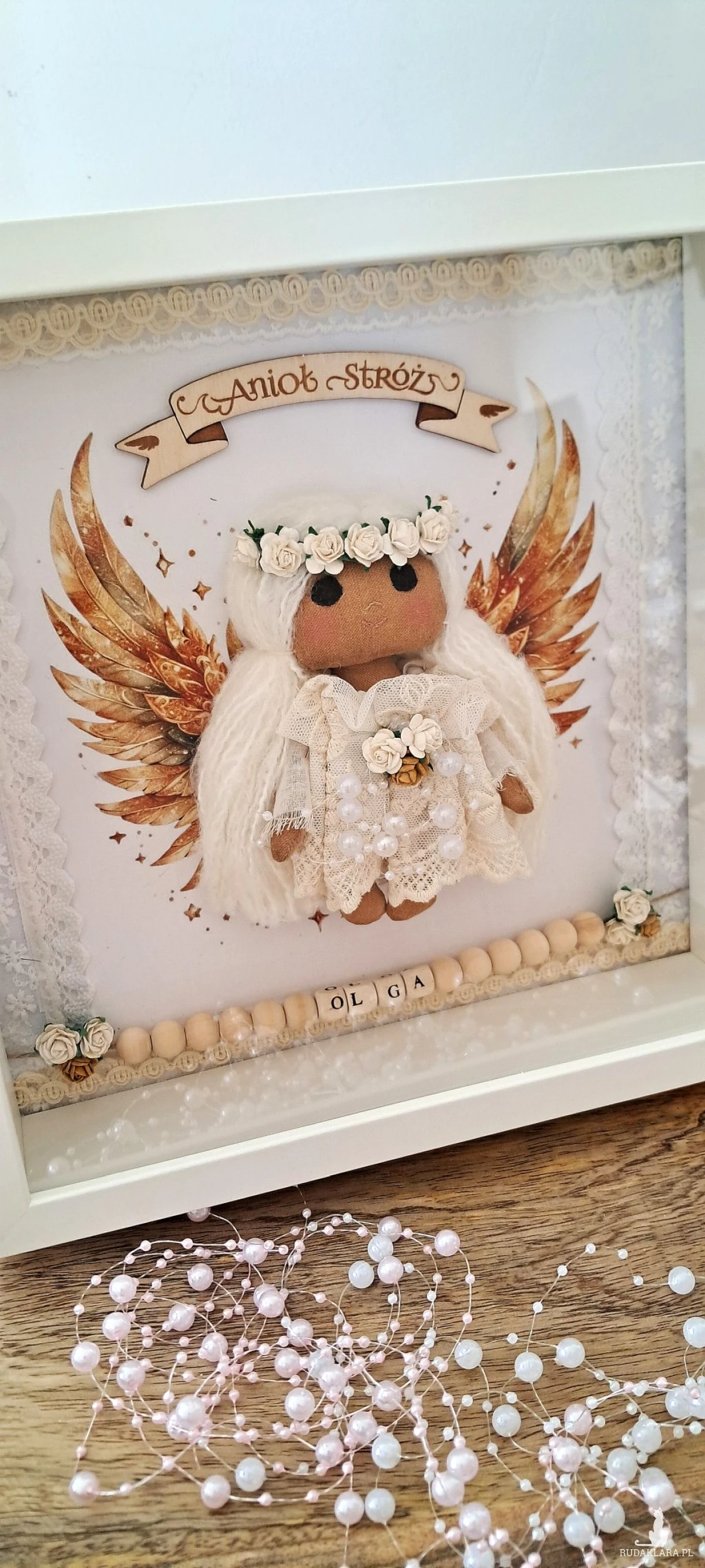 Mam do sprzedania aniołka stróża w ramce 3 d z szybką plexi. Aniołek uszyty z surówki bawełnianej, barwionej kawą. Wypełniony antyalergiczna kulką silikonową. Ubrany w sukienkę koronkową koloru ecri,ozdobioną różyczkami i perełkami.Skrzydełka w postaci grafiki. Włosy z włóczki koloru białego. Na główce wianuszek z białych różyczek.Oczy, nosek i usta wyszyte. Na środku ramki sklejkowy napis Anioł stróż. Koralikowe imię zmienię stosownie do potrzeb. Ramka o wymiarach 25x25 cm, wewnątrz udekorowana koronką bawełnianą oraz jutową. Ramkę można postawić lub zawiesić. Ramka będzie zapakowana w pudełko z okienkiem z dekoracyjnym wypełnieniem wprost do podarowania:) Całość wykonana z dbałością o każdy element i włożonym sercem. Serdecznie polecam:)