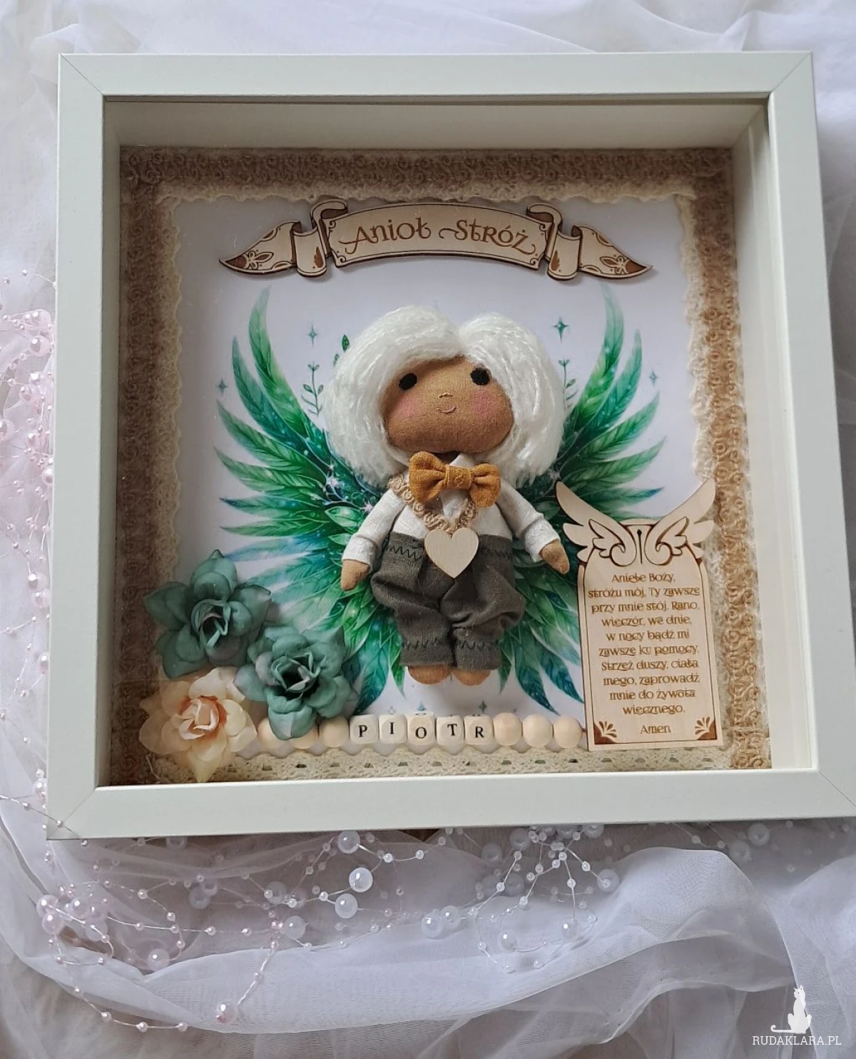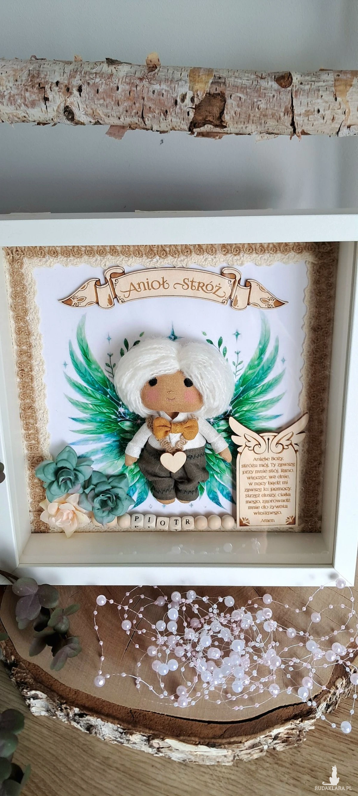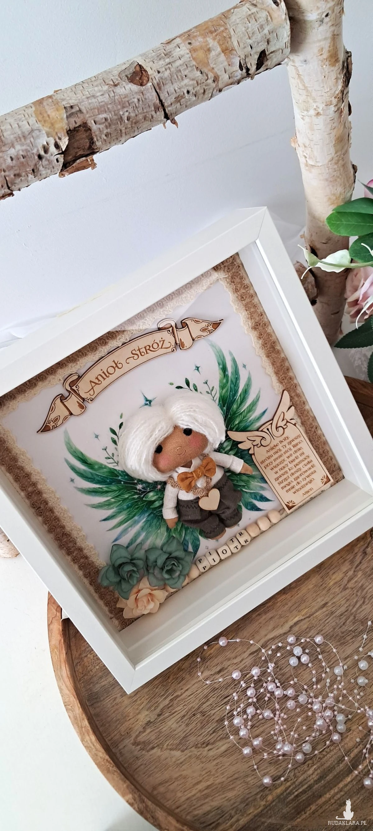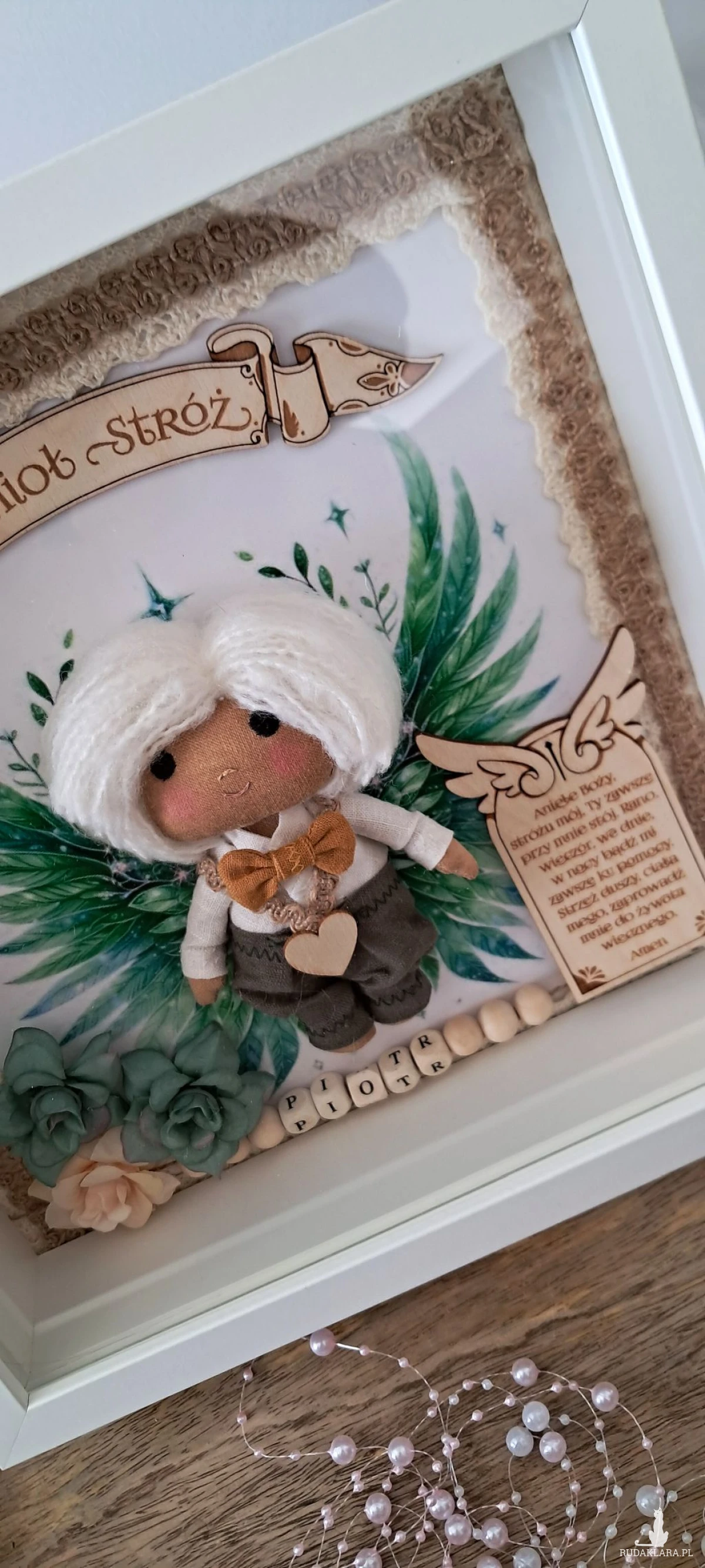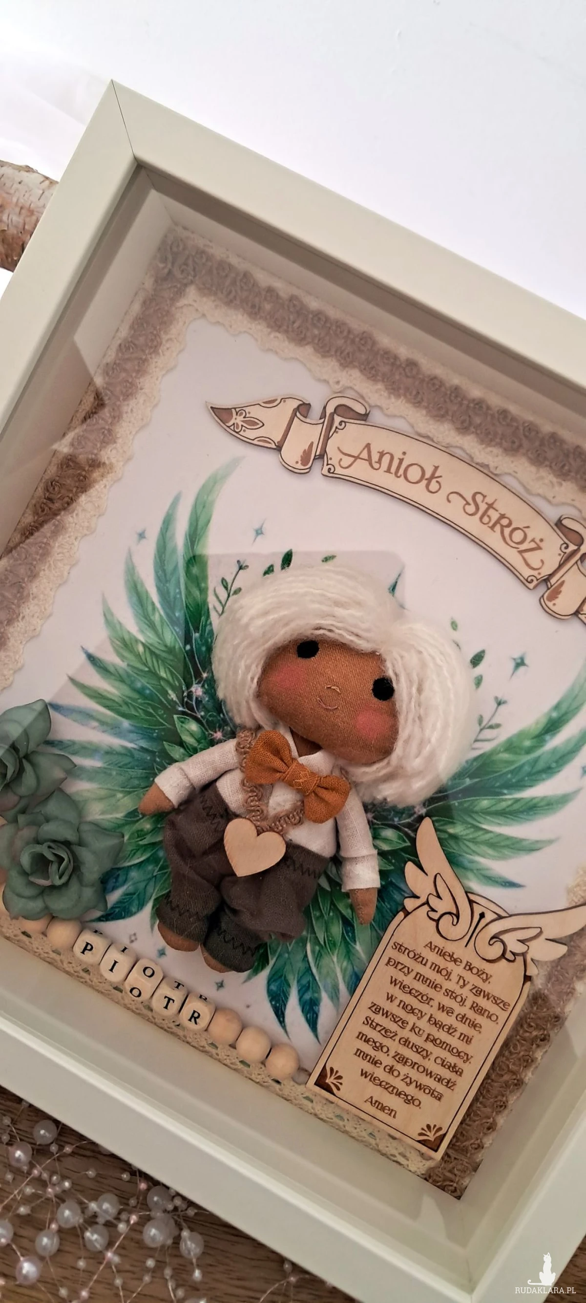 Mam do sprzedania aniołka stróża w ramce 3 d z szybką plexi. Aniołek uszyty z surówki bawełnianej,barwionej kawą. Wypełniony antyalergiczna kulką silikonową. Ubrany w spodnie lniane koloru khaki i lnianą koszulę koloru białego. U szyi ma musztardową muchę lnianą. Na przodzie przyklejone serduszko ze sklejki. Skrzydełka w postaci grafiki. Włosy z włóczki. Oczy,nosek i usta wyszyte. Na środku ramki sklejkowy napis Anioł stróż. Po jednej stronie u dołu na tabliczce widnieje modlitwa do Anioła Stróża. Po drugiej kwiatki kolor zielony i beżowy. Koralikowe imię zmienię stosownie do potrzeb. Ramka o wymiarach 25x25 cm, wewnątrz udekorowana koronką bawełnianą oraz jutową. Ramkę można postawić lub zawiesić. Ramka będzie zapakowana w pudełko z okienkiem z dekoracyjnym wypełnieniem wprost do podarowania:) Całość wykonana z dbałością o każdy element i włożonym sercem. Serdecznie polecam:)