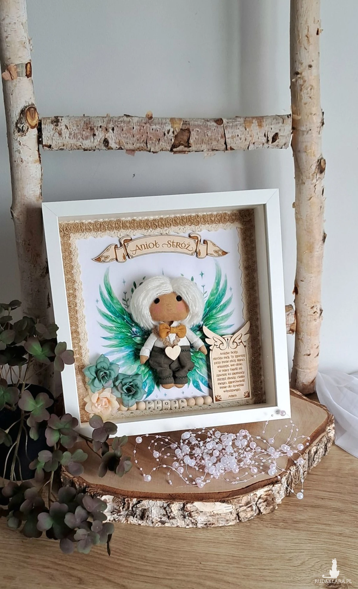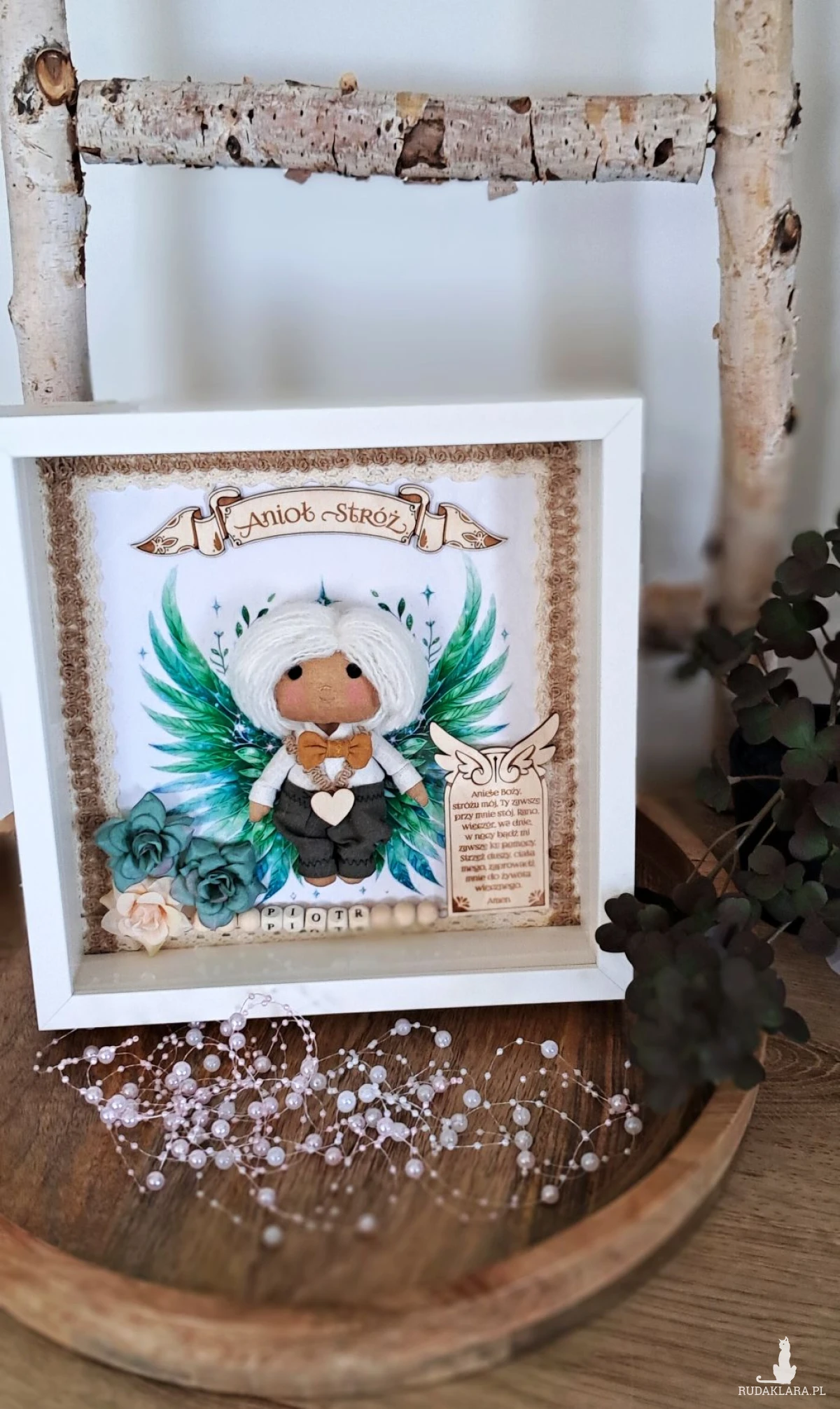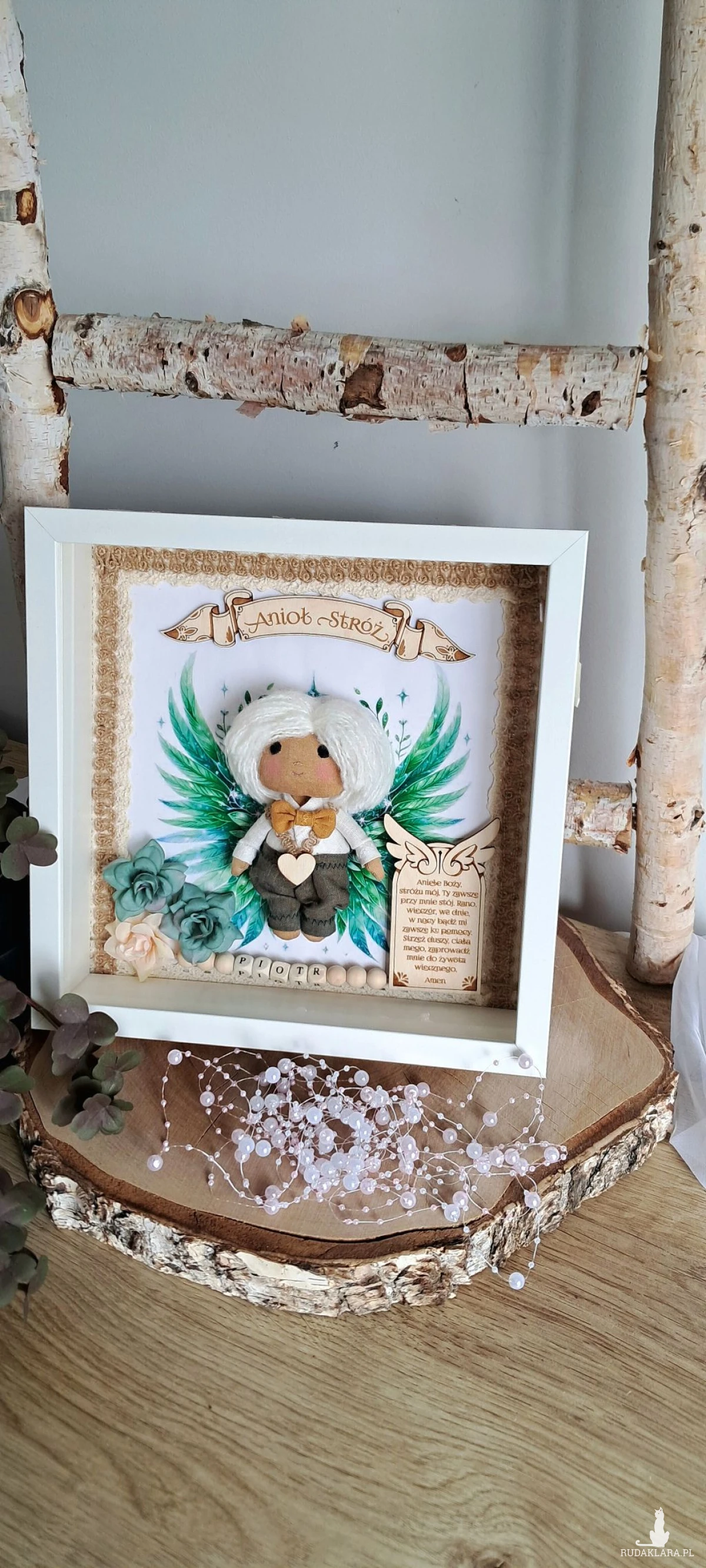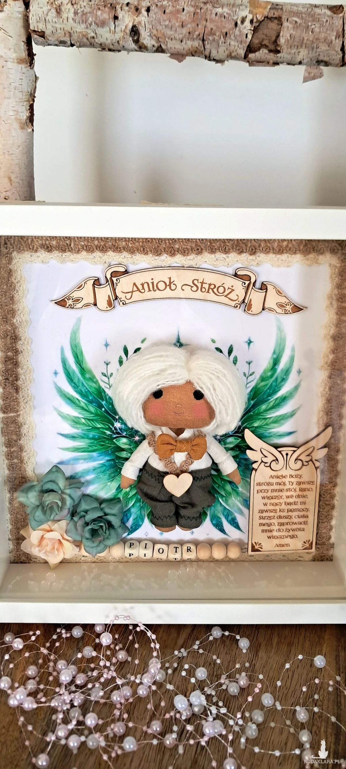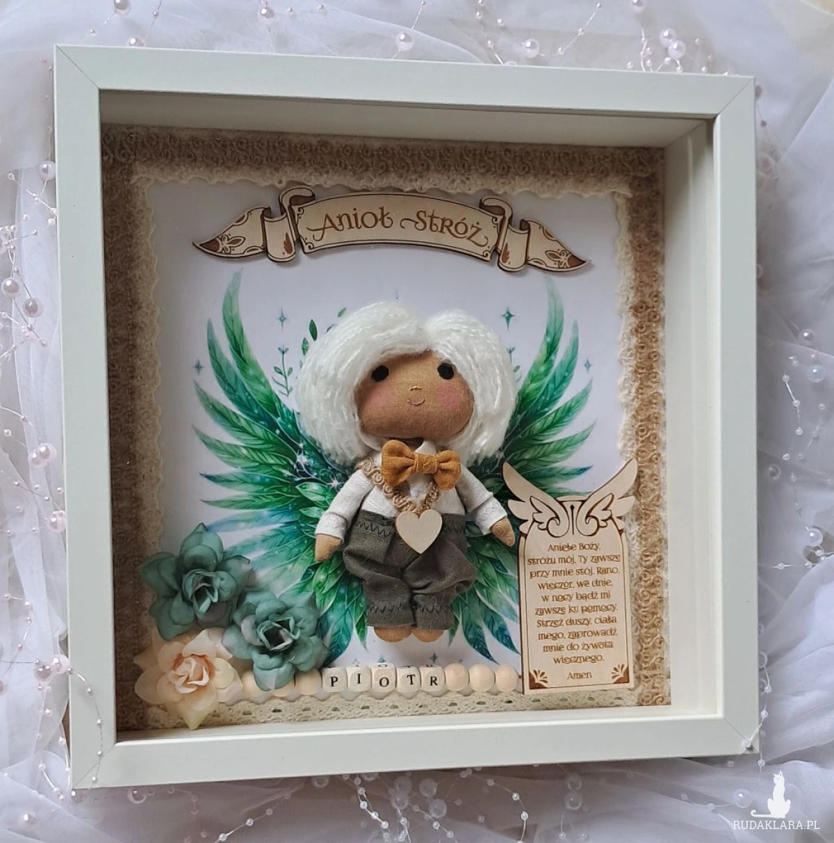 Mam do sprzedania aniołka stróża w ramce 3 d z szybką plexi. Aniołek uszyty z surówki bawełnianej,barwionej kawą. Wypełniony antyalergiczna kulką silikonową. Ubrany w spodnie lniane koloru khaki i lnianą koszulę koloru białego. U szyi ma musztardową muchę lnianą. Na przodzie przyklejone serduszko ze sklejki. Skrzydełka w postaci grafiki. Włosy z włóczki. Oczy,nosek i usta wyszyte. Na środku ramki sklejkowy napis Anioł stróż. Po jednej stronie u dołu na tabliczce widnieje modlitwa do Anioła Stróża. Po drugiej kwiatki kolor zielony i beżowy. Koralikowe imię zmienię stosownie do potrzeb. Ramka o wymiarach 25x25 cm, wewnątrz udekorowana koronką bawełnianą oraz jutową. Ramkę można postawić lub zawiesić. Ramka będzie zapakowana w pudełko z okienkiem z dekoracyjnym wypełnieniem wprost do podarowania:) Całość wykonana z dbałością o każdy element i włożonym sercem. Serdecznie polecam:)