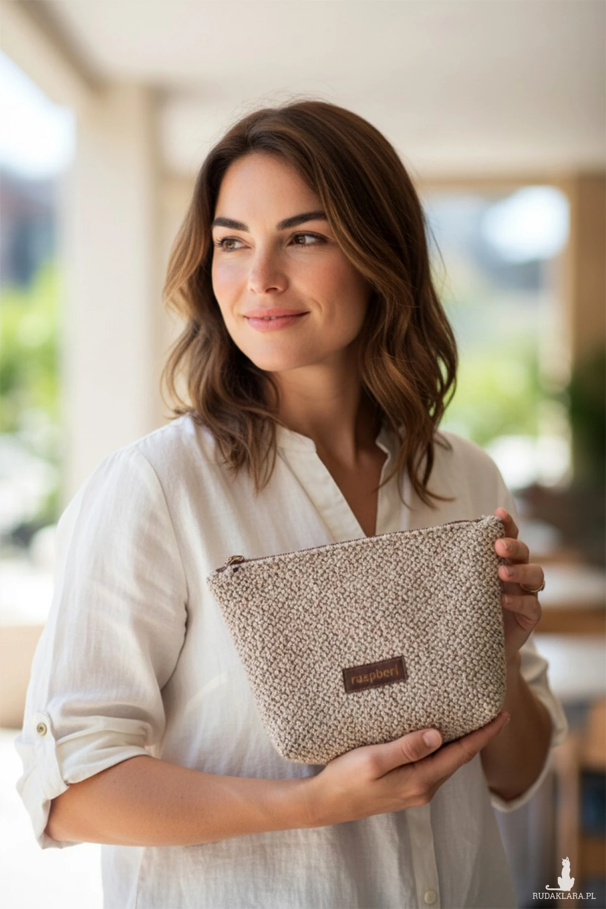 Duża kosmetyczka w kolorze beżowym.