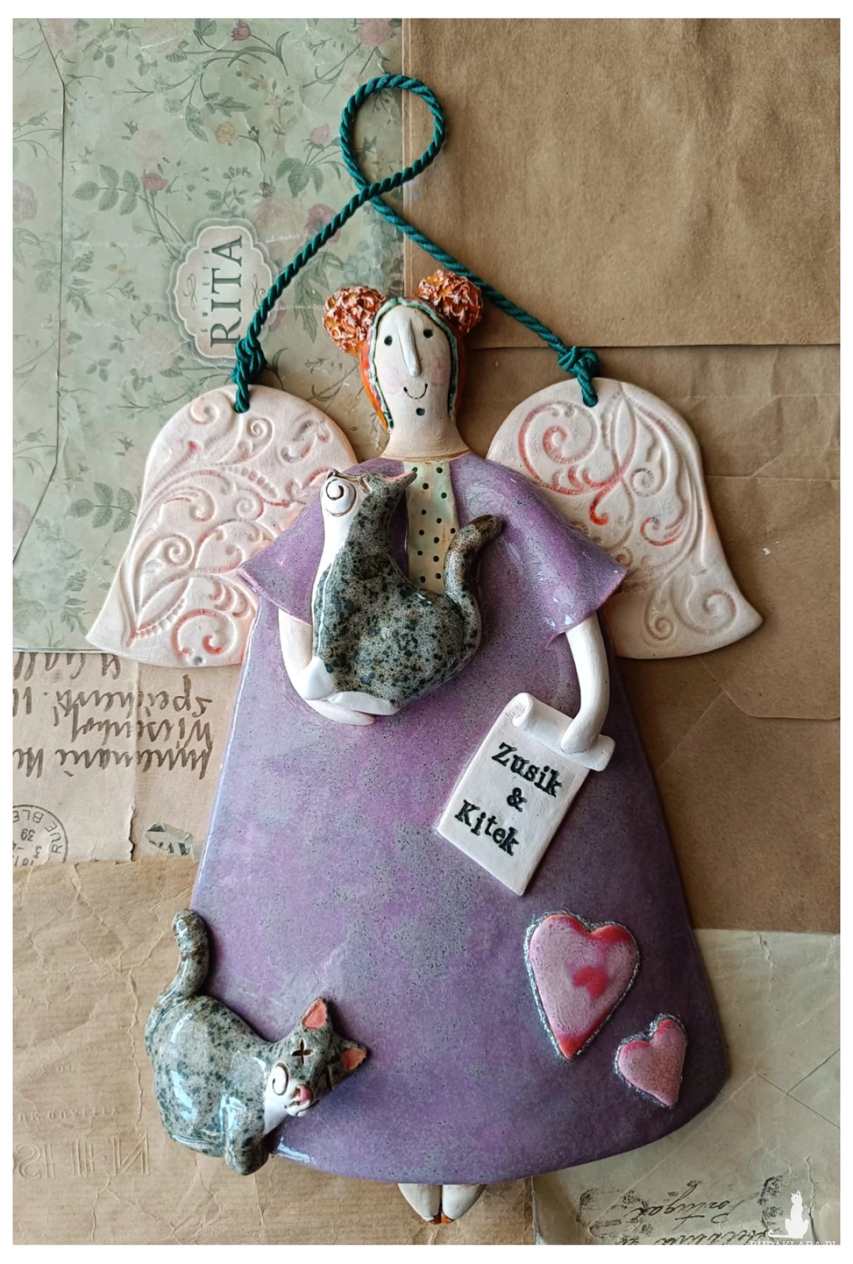Uroczy aniołek ceramiczny wykonany z gliny szamotowej, wypalony na biskwit, a następnie szkliwiony w temperaturze 1260 stopni C. Wymiary ok 17 cm x 24 cm. Do powieszenia na ścianie na ozdobnym sznureczku. Idealny jako prezent okolicznościowy lub do ozdoby domu.