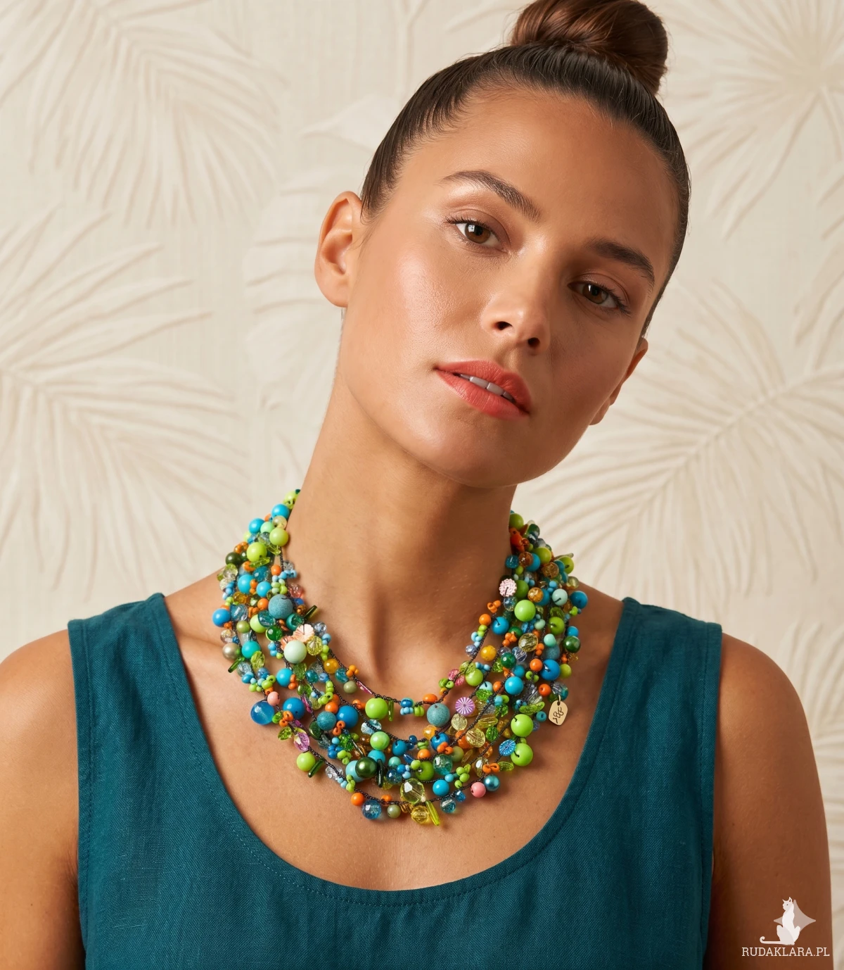 Naszyjnik efektownie układa się na dekolcie, stanowiąc dominujący akcent stylizacji.