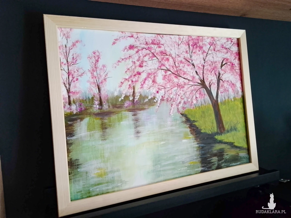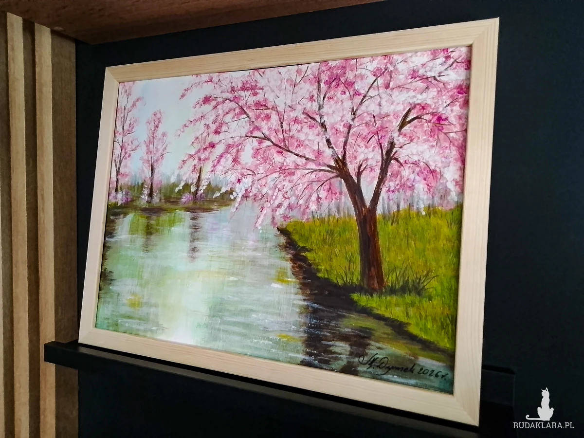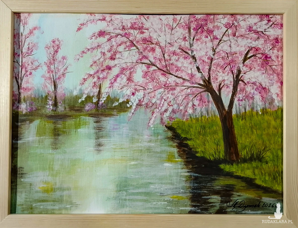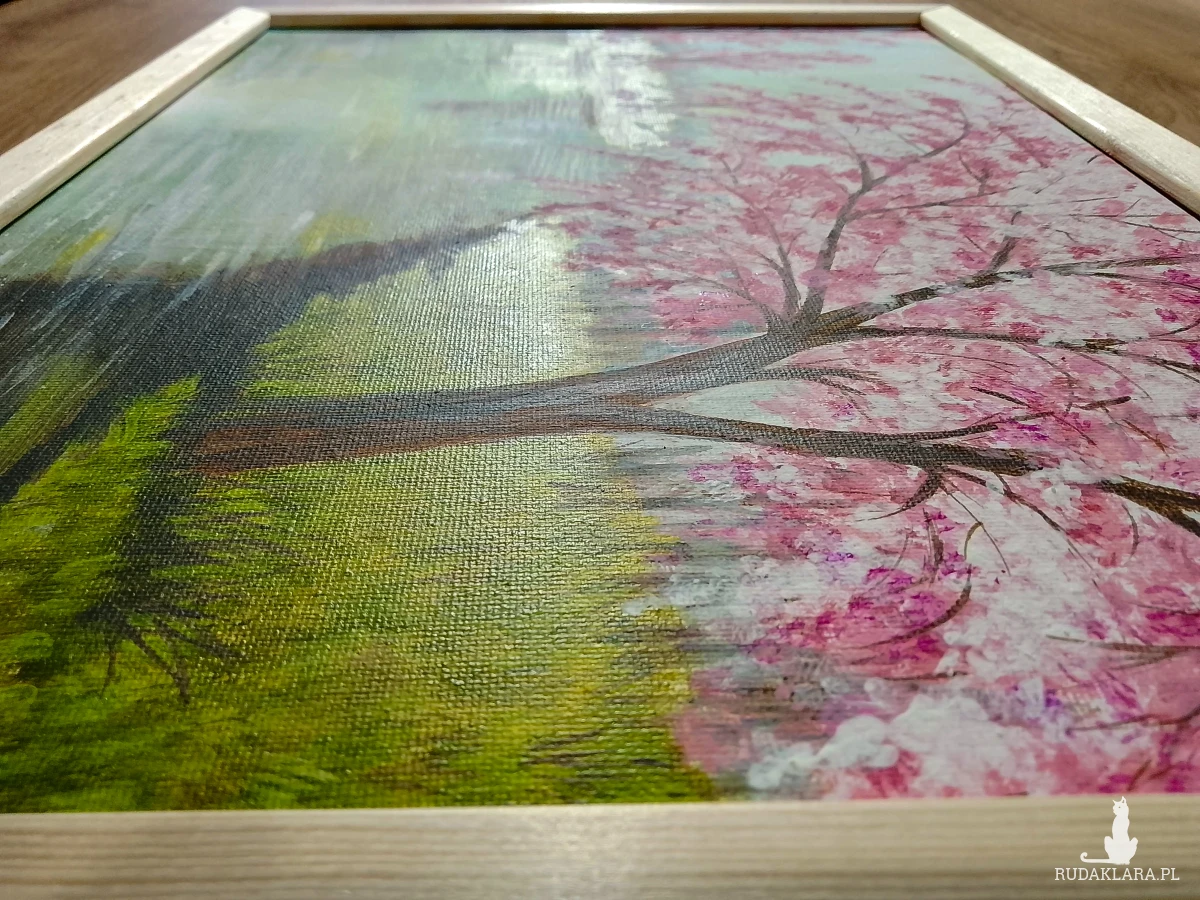 - Tematyka: Niepowtarzalny pejzaż - kwitnąca sakura malowniczo pochylona nad taflą wody