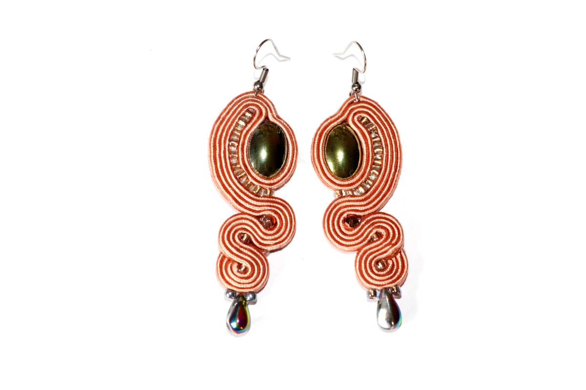 Te długie kolczyki sutasz to propozycja dla kobiet, które szukają biżuterii eleganckiej, ale z "pazurem". Ciepły, migdałowy odcień sznurków tworzy harmonijną całość z centralnie umieszczonym elementem o metalicznym blasku. Całość wieńczy lśniąca, opalizująca kropelka, która dodaje projektowi lekkości i tajemniczości.