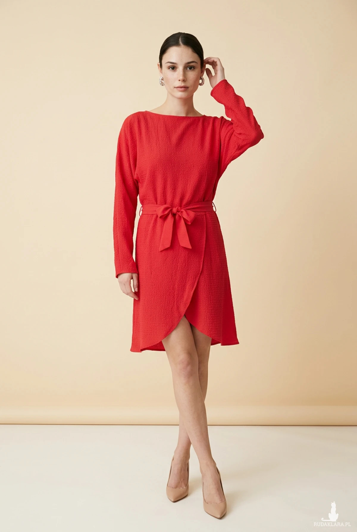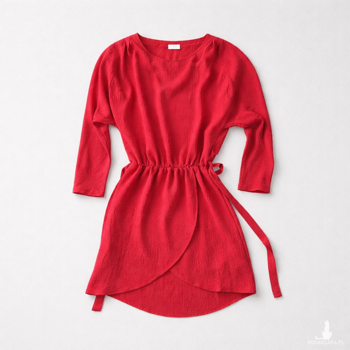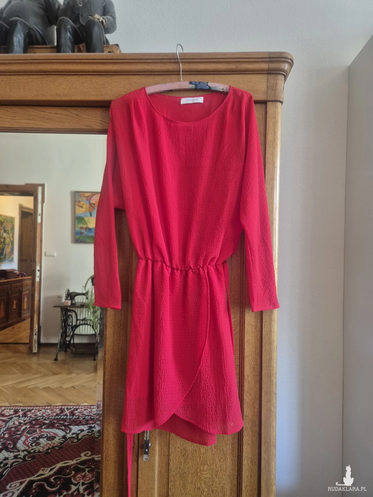 Czerwona sukienka firma Promod materiał troszkę jak żorżeta sukienka jest na podszewce, rozmiar 36, długość całości sukienki 98 cm w pasie na gumkę 36 cm odległość PHP luźna 56 cm bo krój jest nietoperzowy u góry