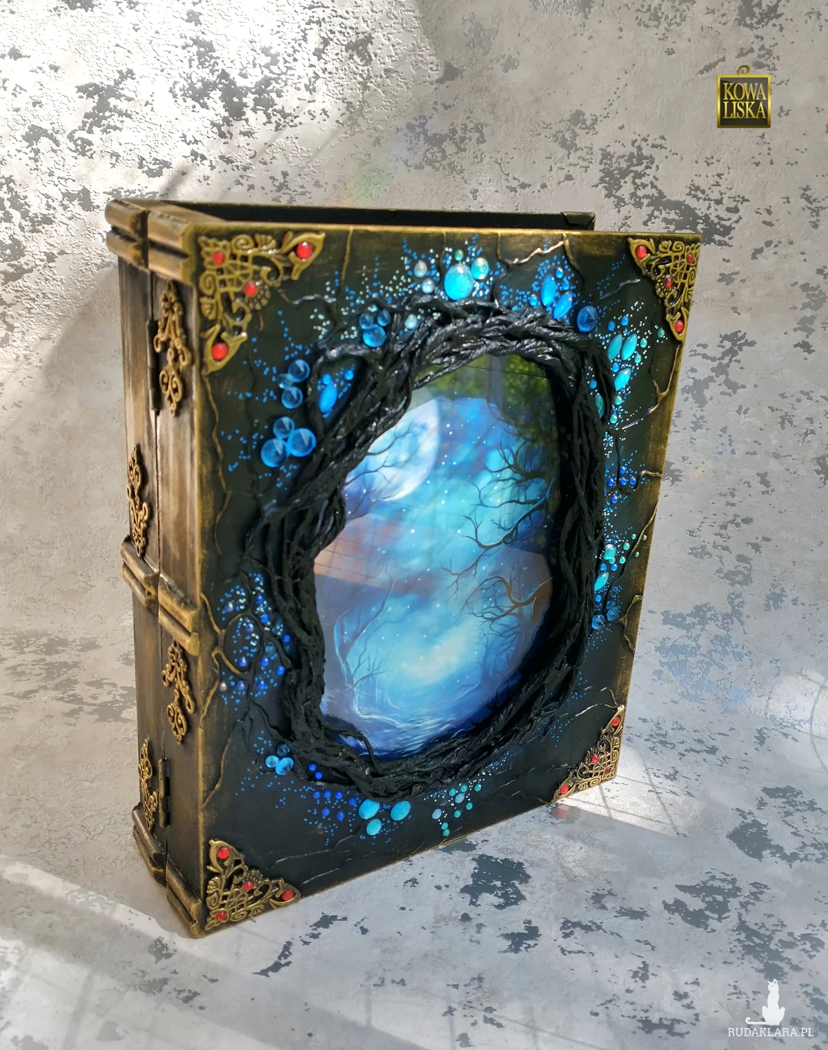 Wieczko stanowi oryginalne "okienko" porośnięte pnączami, odsłaniające nocny pejzażyk, zabezpieczony szybką. Wewnątrz jest wklejony podobny obrazek, w głębokich, wyrazistych kolorach. Zamknięcie na magnes, przód zdobiony metalowym ornamentem z kamieniami, tył stylizowany na starą księgę.