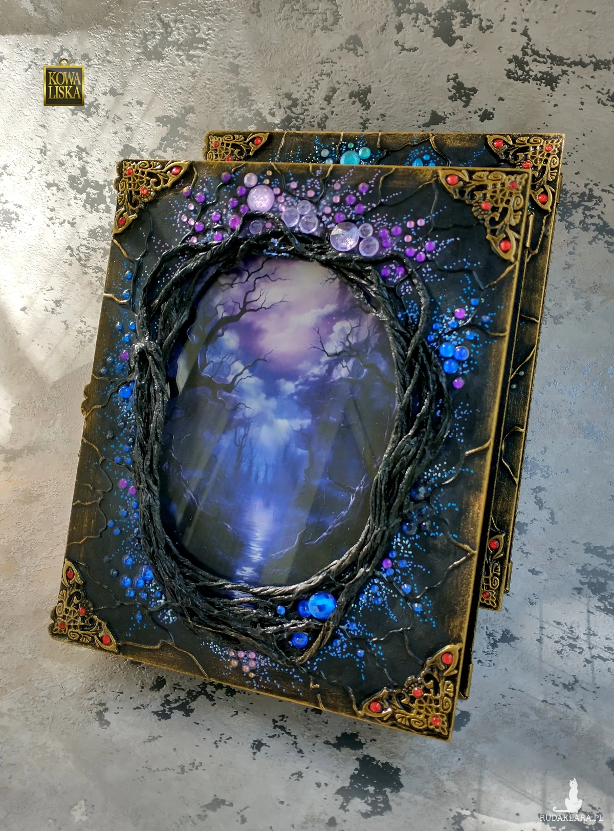 Wieczko stanowi oryginalne "okienko" porośnięte pnączami, odsłaniające nocny pejzażyk, zabezpieczony szybką. Wewnątrz jest wklejony podobny obrazek, w głębokich, wyrazistych kolorach. Zamknięcie na magnes, przód zdobiony metalowym ornamentem z kamieniami, tył stylizowany na starą księgę.