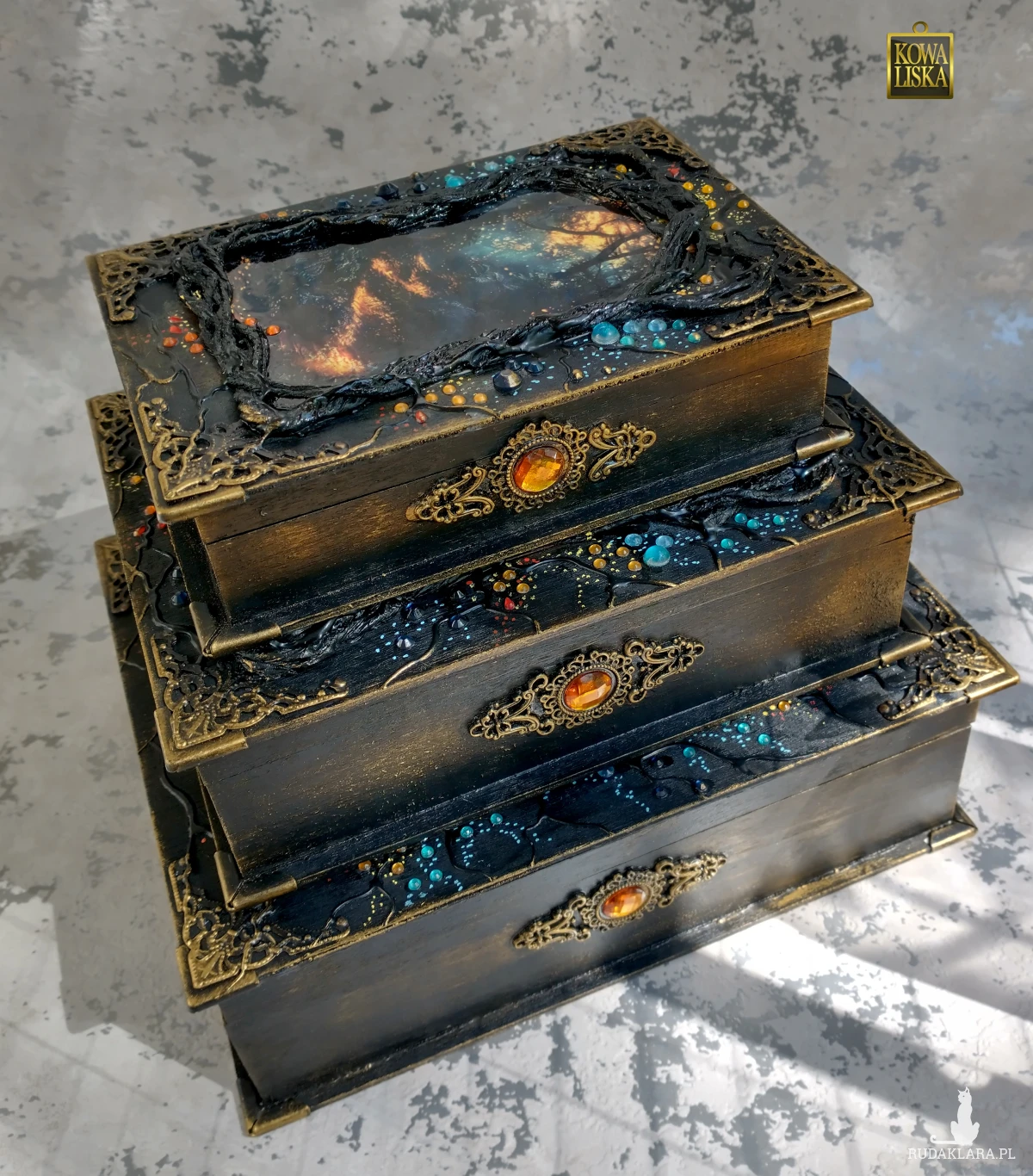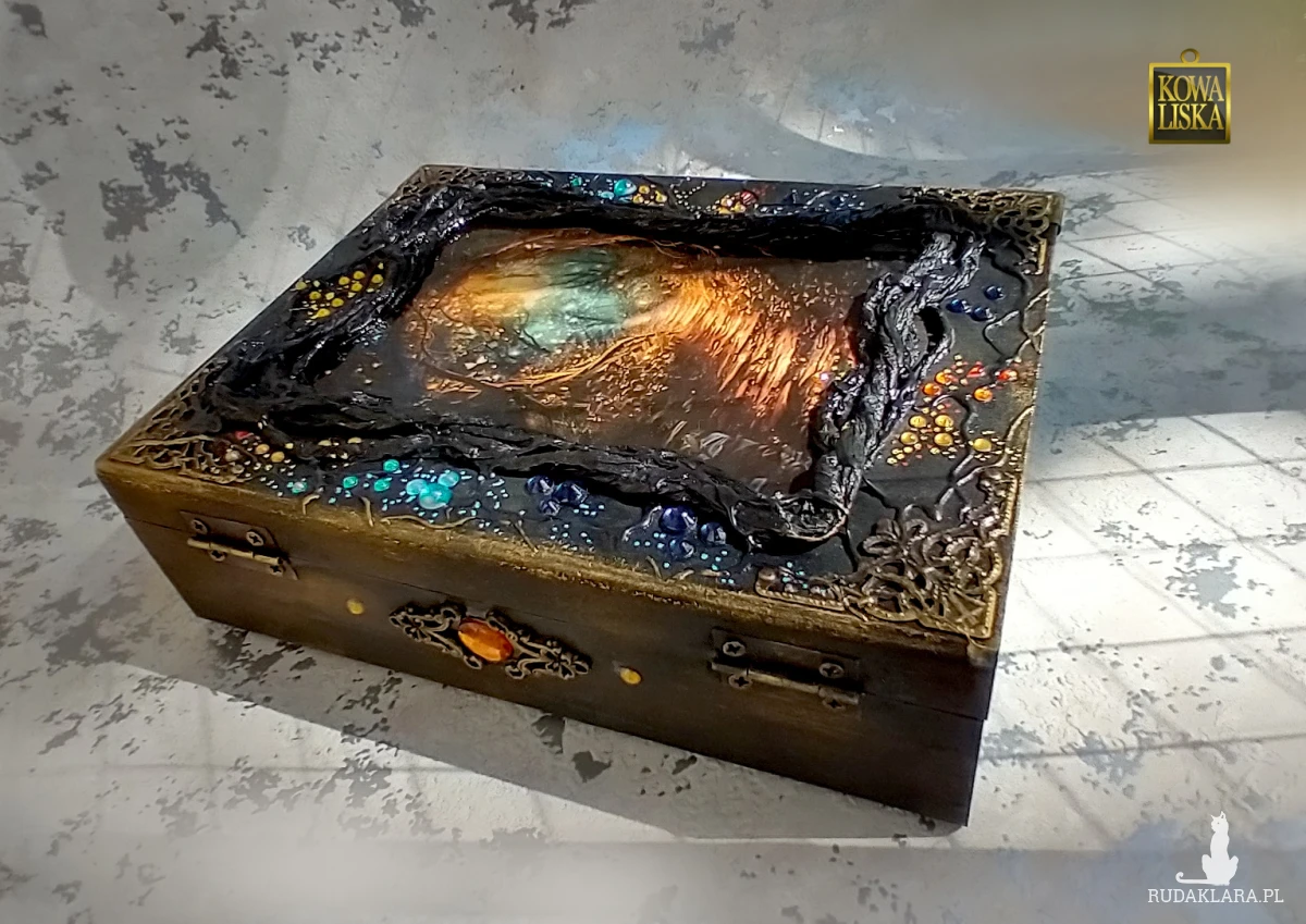 Szkatułka może stanowić komplet z dwiema innymi, wystawionymi pod nazwą "Uroczysko". Ostatnie ze zdjęć ukazuje wszystkie trzy szkatułki - razem wyglądają pięknie i bardzo dekoracyjnie. Na tej aukcji do sprzedania jedna, średnia. Bardzo efektowne, ale też serco- i pracochłonne - jeśli powstaną podobne, to i tak żadna nie będzie taka sama.