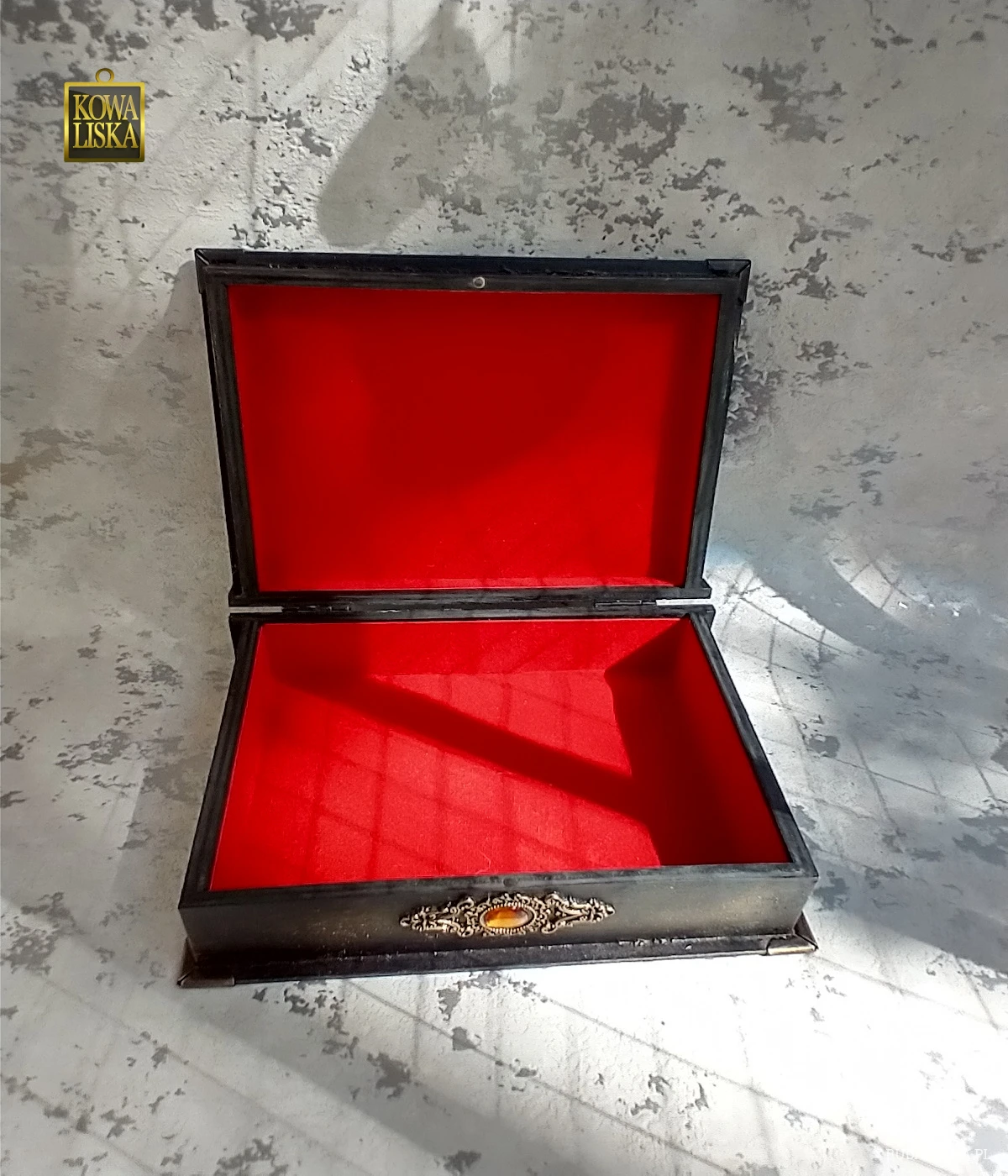 Wieczko umocowane na metalowych zawiasach, stanowi oryginalne "okienko" porośnięte pnączami, odsłaniające urokliwy pejzażyk. Wnętrze wyklejone czerwonym welurem, przód i tył zdobiony metalowym ornamentem z kamieniem.