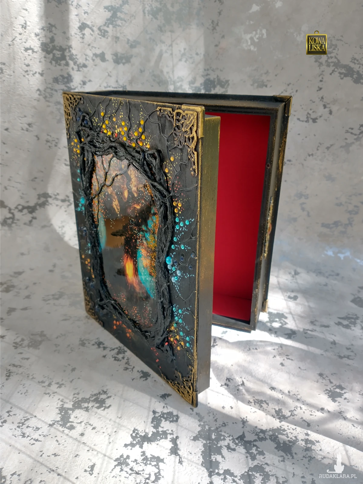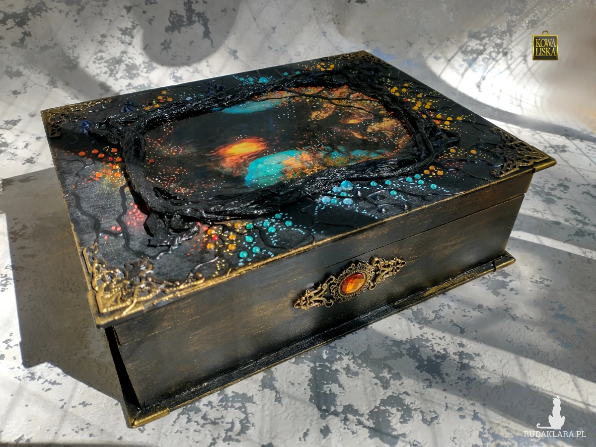 Szkatułka może stanowić komplet z dwiema innymi, wystawionymi pod nazwą "Uroczysko". Ostatnie ze zdjęć ukazuje wszystkie trzy szkatułki - razem wyglądają pięknie i bardzo dekoracyjnie. Na tej aukcji do sprzedania jedna, największa. Bardzo efektowne, ale też serco- i pracochłonne - jeśli powstaną podobne, to i tak żadna nie będzie taka sama.