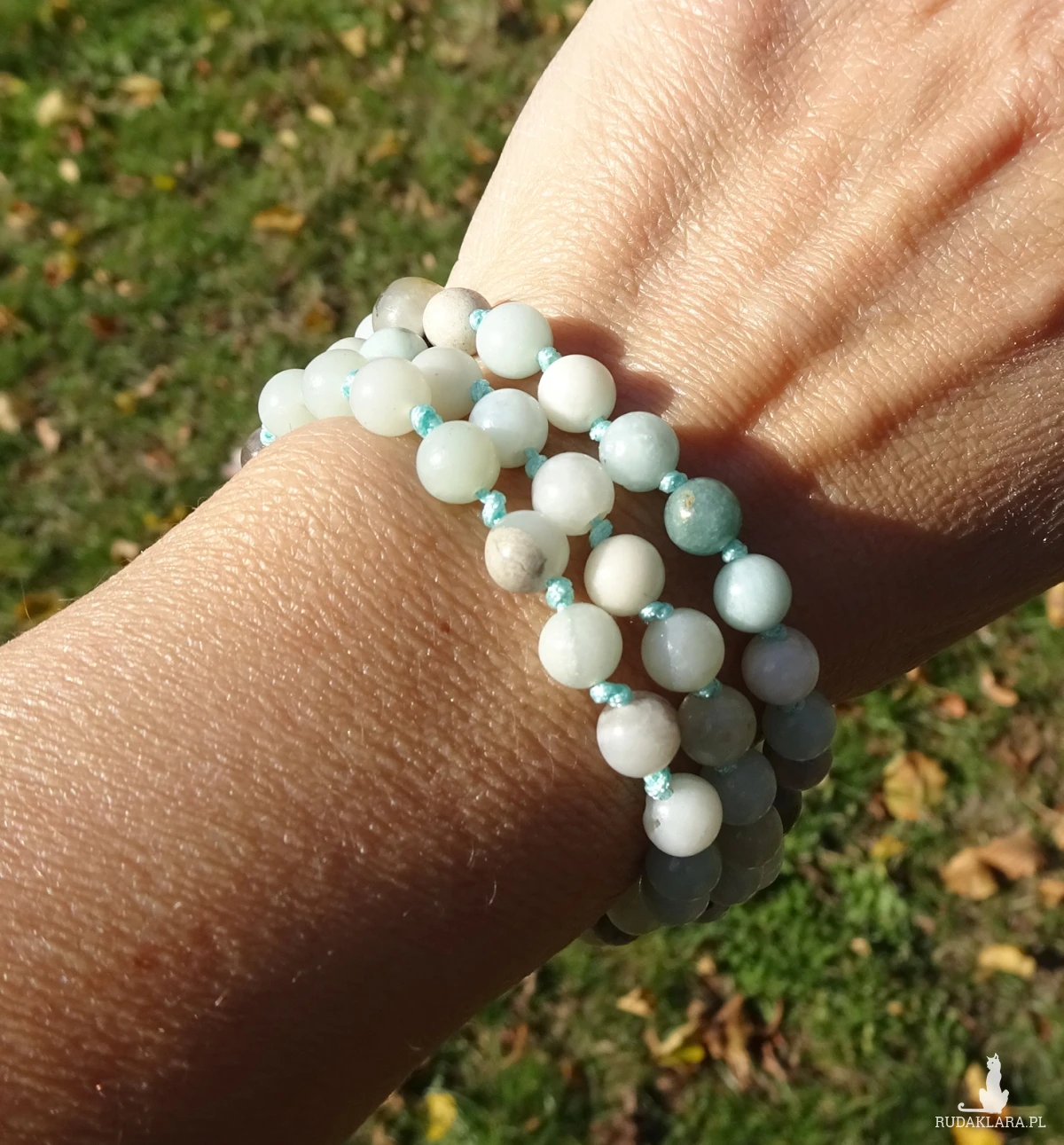 Amazonit to kamień „na poprawę samopoczucia”. Łagodzi i uspokaja, pozytywnie oddziałuje na aurę. Warto mieć go przy sobie w stanach nerwowości, stresu czy wyczerpania umysłowego. Usuwa blokady energetyczne. Zmniejsza wahania nastroju. Sprzyja bezwarunkowej miłości, spokojowi, przebaczeniu i dobrobytowi. Ułatwia współczujące wzajemne zrozumienie. Przeciwdziała bezsilności w przypadku depresji. Mobilizuje do wzięcia odpowiedzialności za własne życie. Korzystnie wpływa na kreatywność. Przywraca równowagę między rozsądkiem a uczuciami i emocjami oraz między czakrą serca i gardła. Jeżeli masz przed sobą stresujący dzień bransoletka z amazonitu pozwoli Ci zachować spokój. Natomiast po sporach i przykrych przeżyciach przynosi odprężenie. Eliminuje negatywne energie.