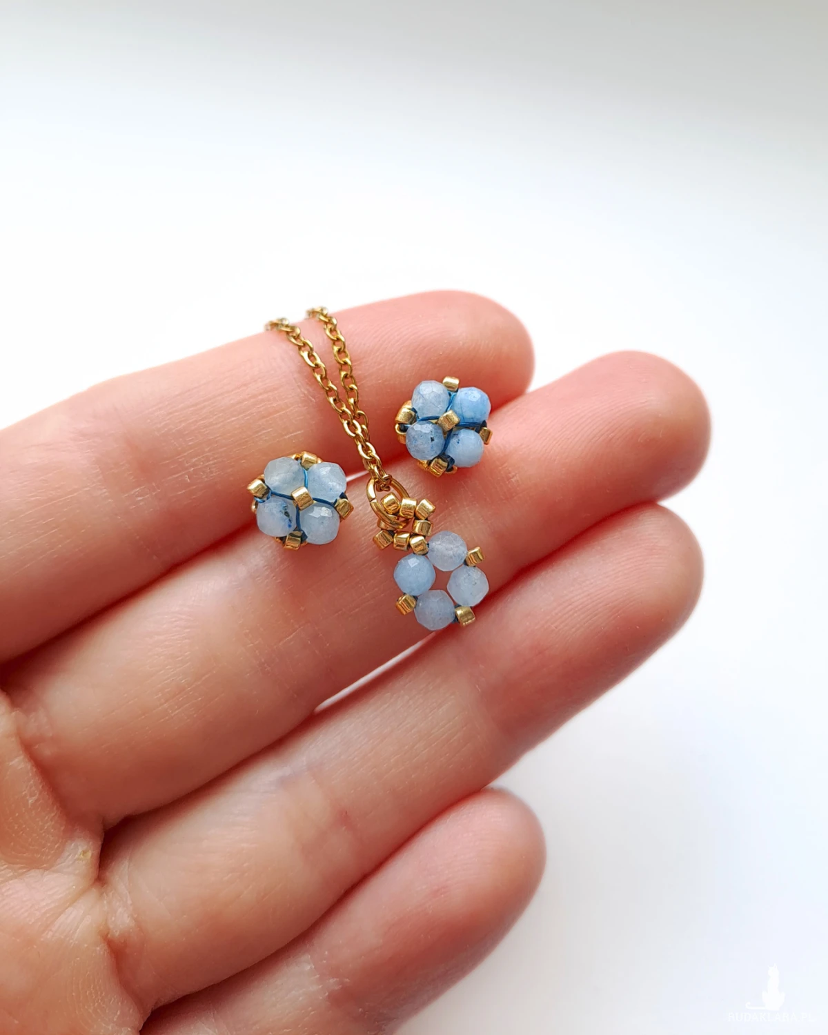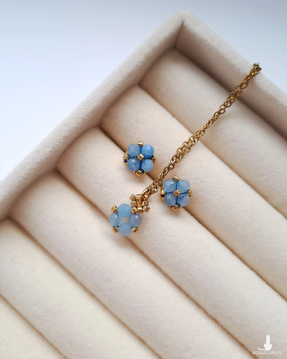 Delikatny komplet z akwamarynu to połączenie minimalistycznych sztyftów i pasującego naszyjnika, które razem tworzą spójną, harmonijną całość. Subtelny odcień błękitu oraz złote detale nadają biżuterii świeży, spokojny charakter. To zestaw, który doskonale sprawdzi się zarówno na co dzień, jak i jako elegancki, nienachalny akcent do bardziej wyjątkowych stylizacji.