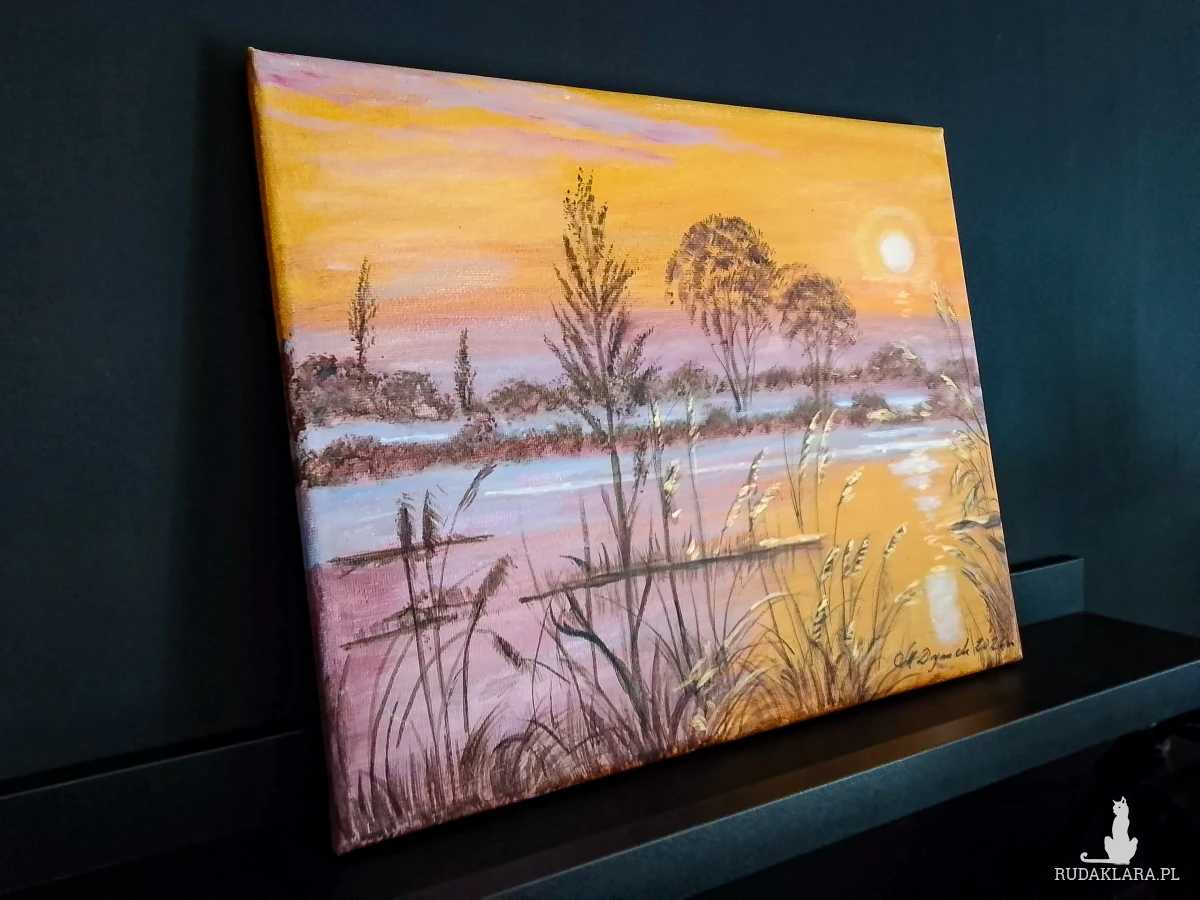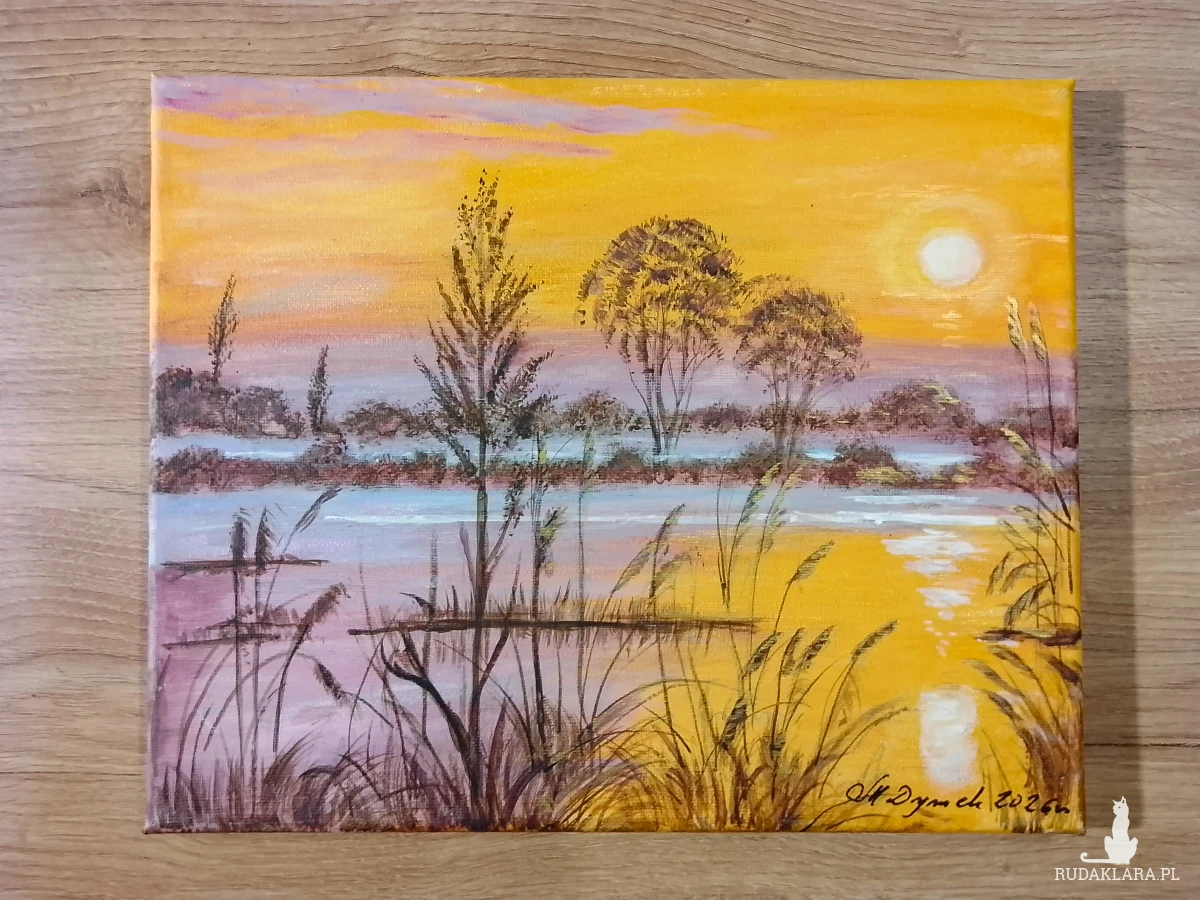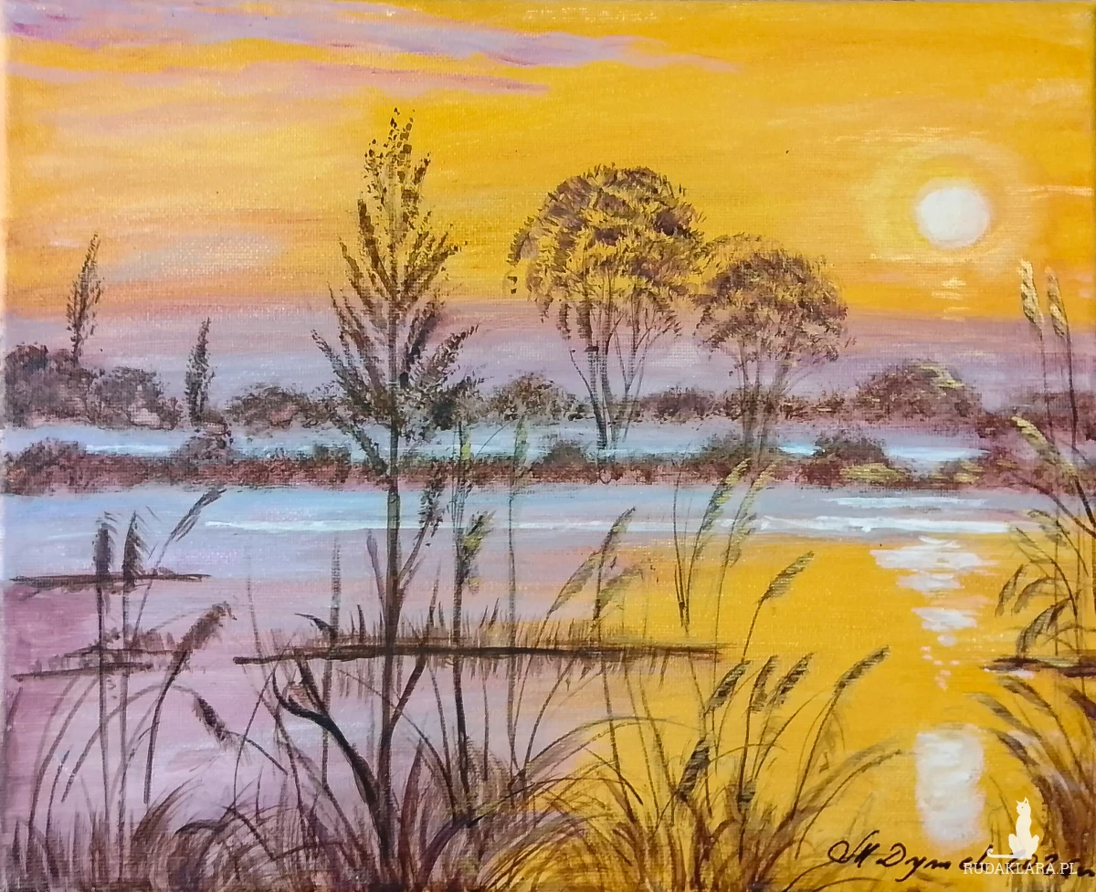 - Tematyka: Klasyczny pejzaż - romantyczna wizja zachodu słońca nad jeziorem