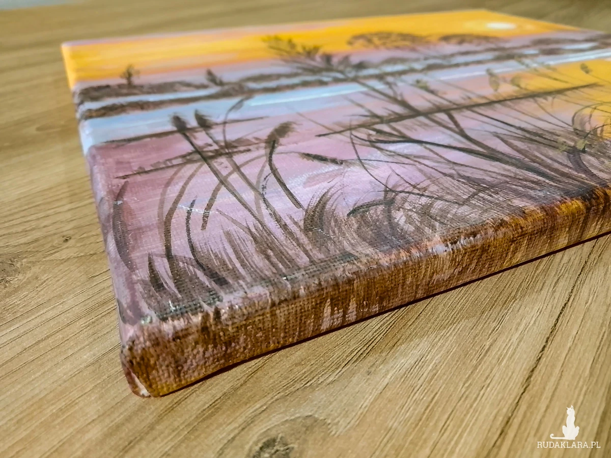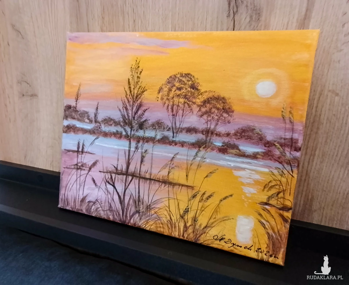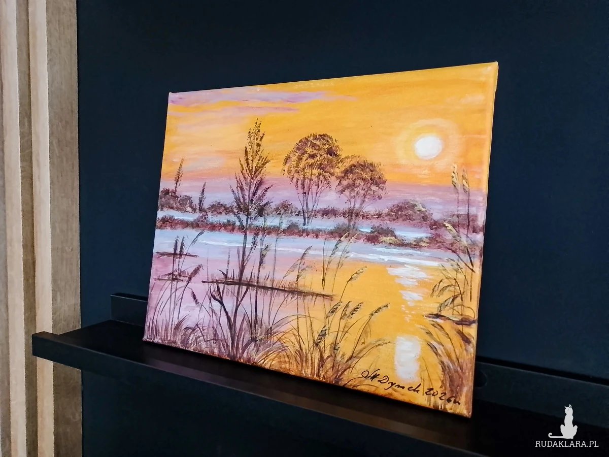 - Tematyka: Klasyczny pejzaż - romantyczna wizja zachodu słońca nad jeziorem