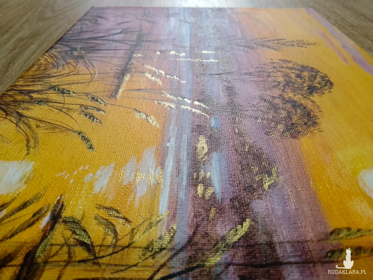 - Kolorystyka: Dominacja ciepłych odcieni żółci, złotych refleksów i soczystego pomarańczu, które kontrastują z chłodnymi fioletami i lawendą - obraz się przepięknie mieni