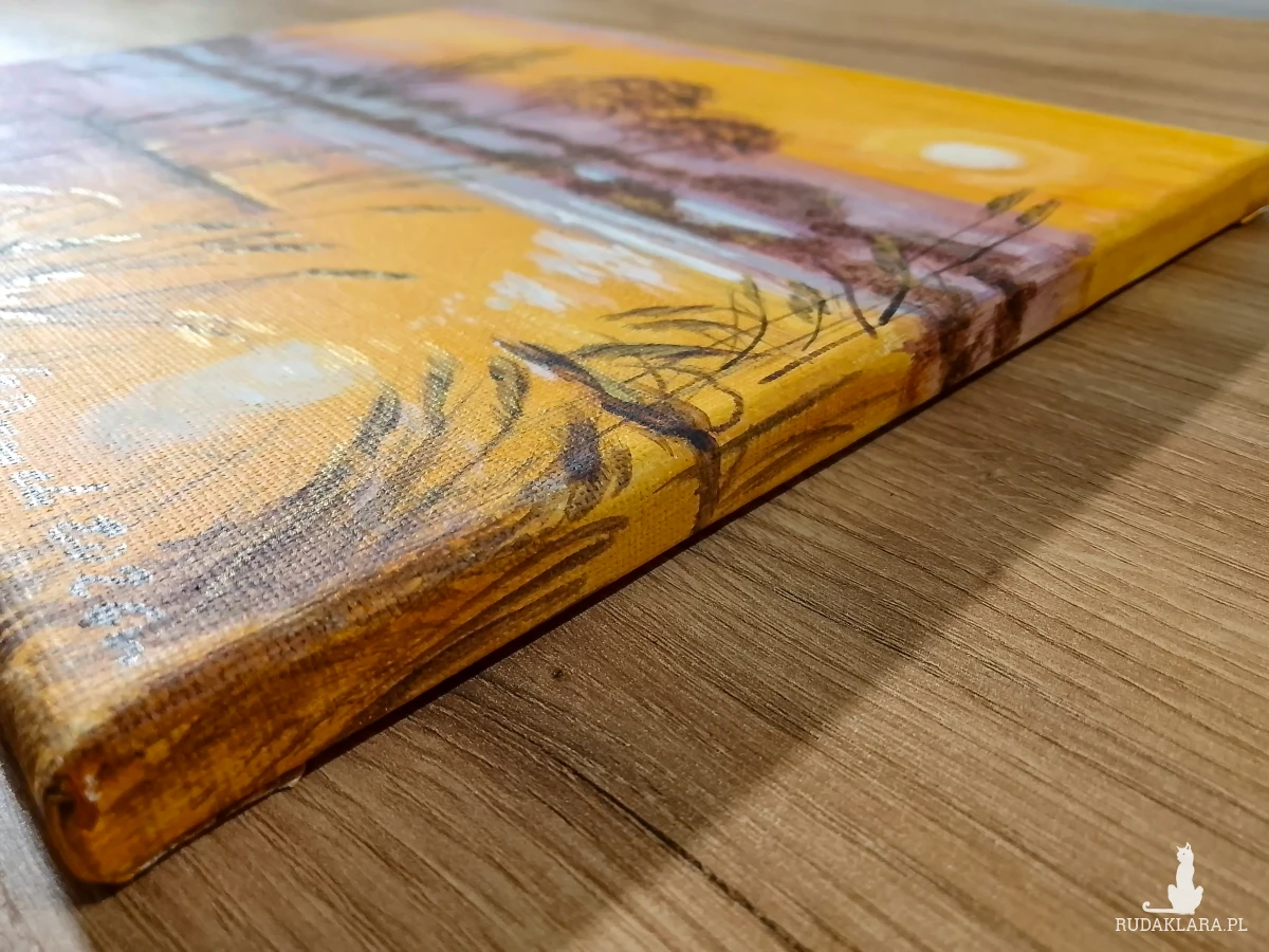 Zatrzymaj promienie słońca w swoim domu. To nie tylko dekoracja, ale bilet do świata spokoju i harmonii. Subtelne przejścia kolorystyczne i dynamiczne pociągnięcia pędzla sprawiają, że płótno "żyje" w zależności od oświetlenia, wprowadzając do wnętrza ciepło oraz relaksującą atmosferę. Idealny prezent dla miłośników natury lub akcent, który ożywi salon, sypialnię, czy gabinet.