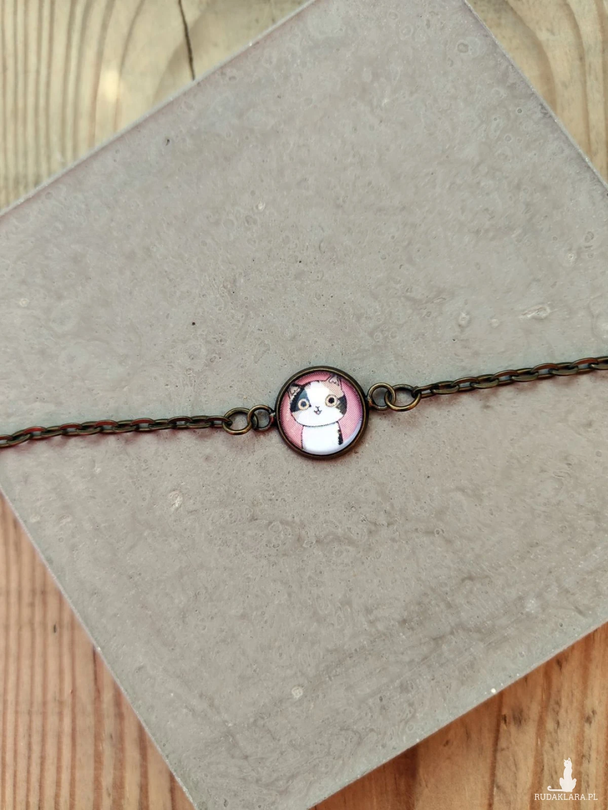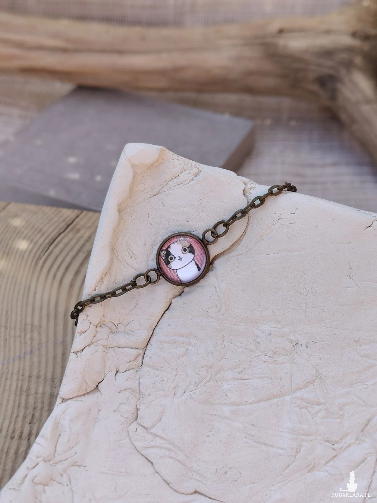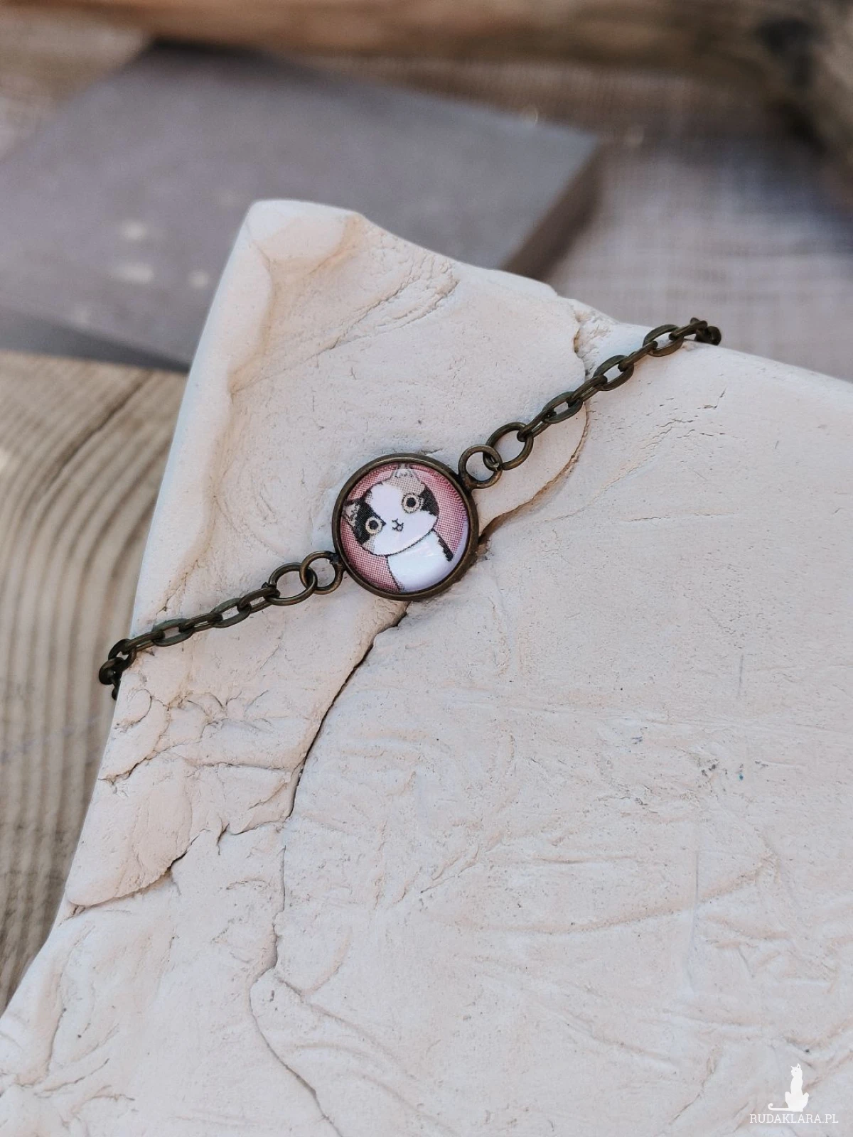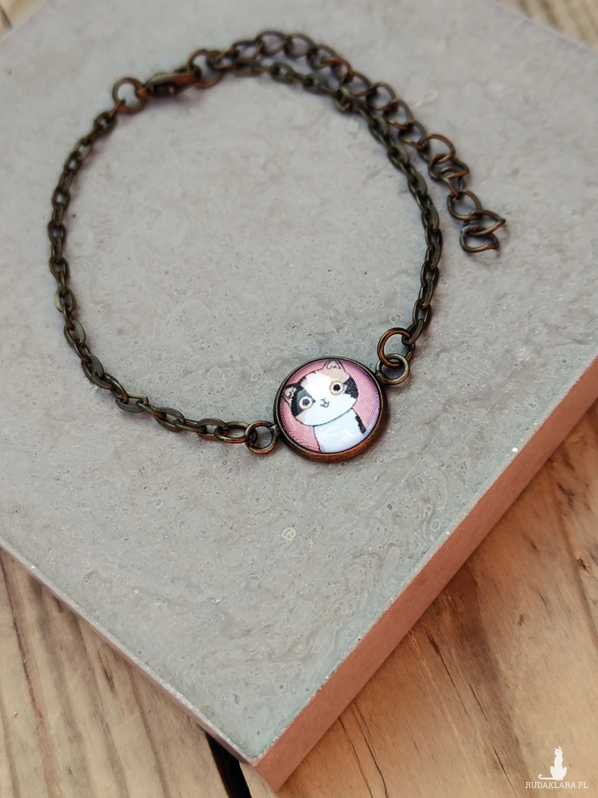 Subtelna i urocza bransoletka z ręcznie oprawionym szklanym kaboszonem przedstawiającym słodkiego kotka na pastelowym tle. Delikatny łańcuszek w stylu vintage pięknie podkreśla nadgarstek, a minimalistyczna forma sprawia, że pasuje zarówno do codziennych stylizacji, jak i bardziej wyjątkowych okazji. Dzięki możliwości przedłużenia dopasujesz ją idealnie do swojego nadgarstka, zapewniając komfort noszenia przez cały dzień.