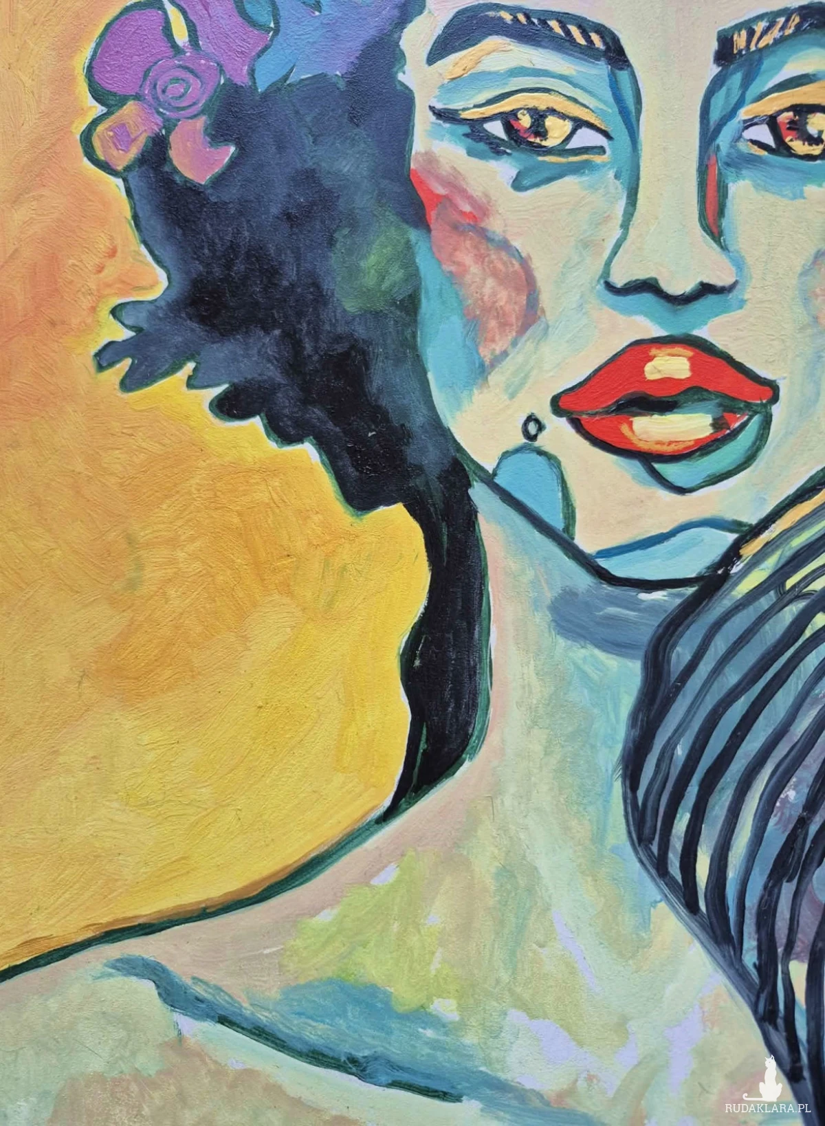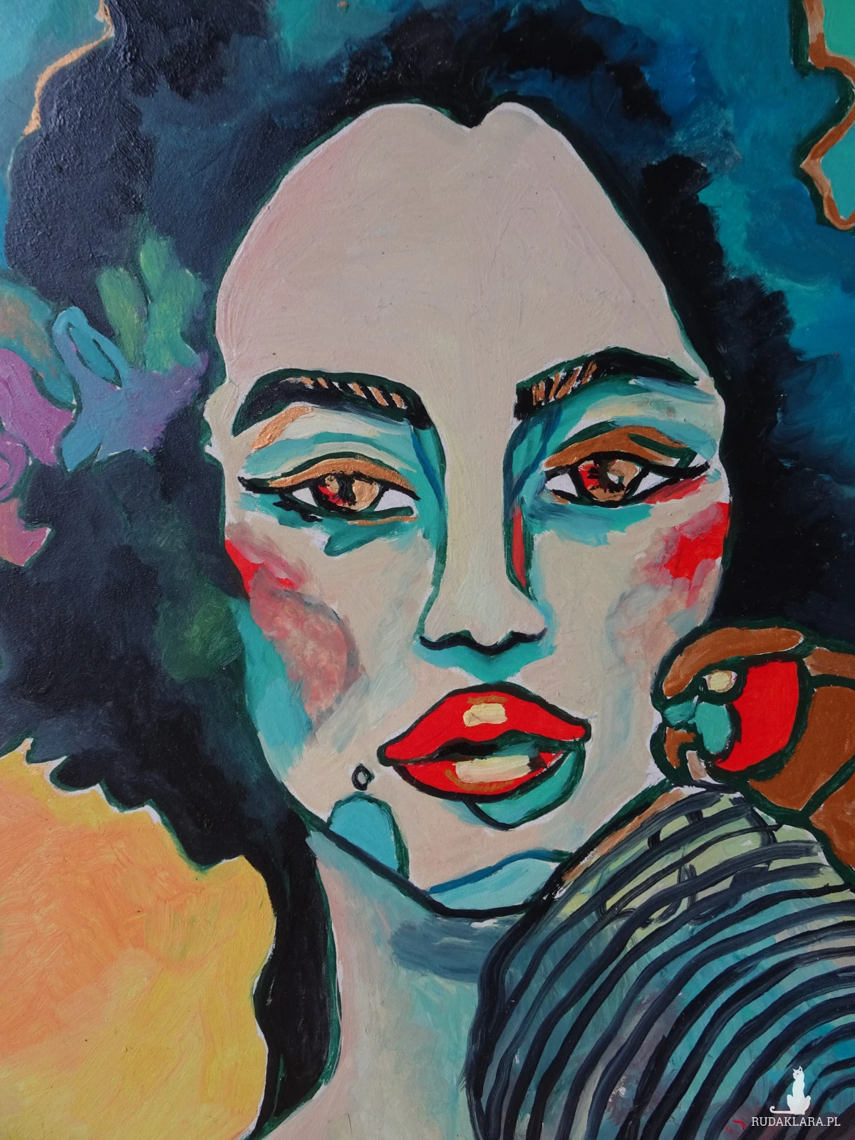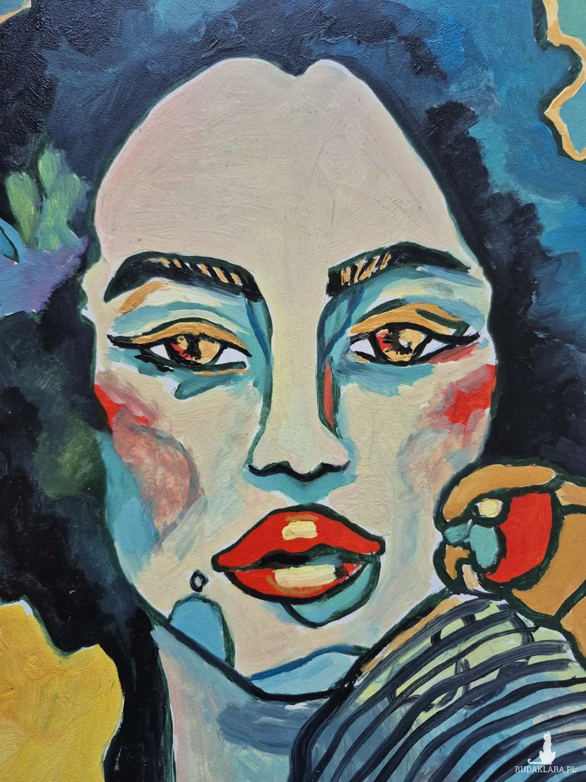 Obraz przedstawia stylizowany, ekspresyjny portret kobiety, namalowany w sposób bardzo kolorowy i nieco abstrakcyjny. Jej twarz ma chłodne odcienie błękitu i zieleni, przełamane intensywnymi plamami czerwieni na policzkach i ustach, co nadaje jej dramatyzmu i emocjonalnej głębi. Oczy są wyraziste, lekko przymknięte, jakby zamyślone lub melancholijne.