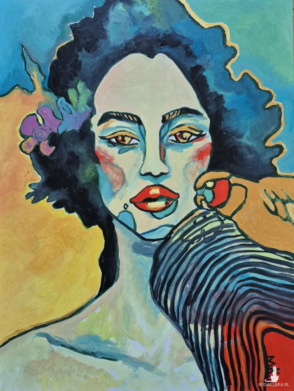 Całość sprawia wrażenie połączenia klasycznego portretu z nowoczesną, odważną formą wyrazu — jakby uchwycono chwilę refleksji w świecie pełnym kolorów i emocji.