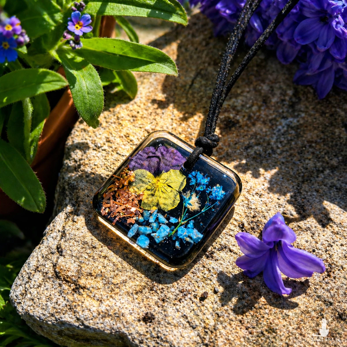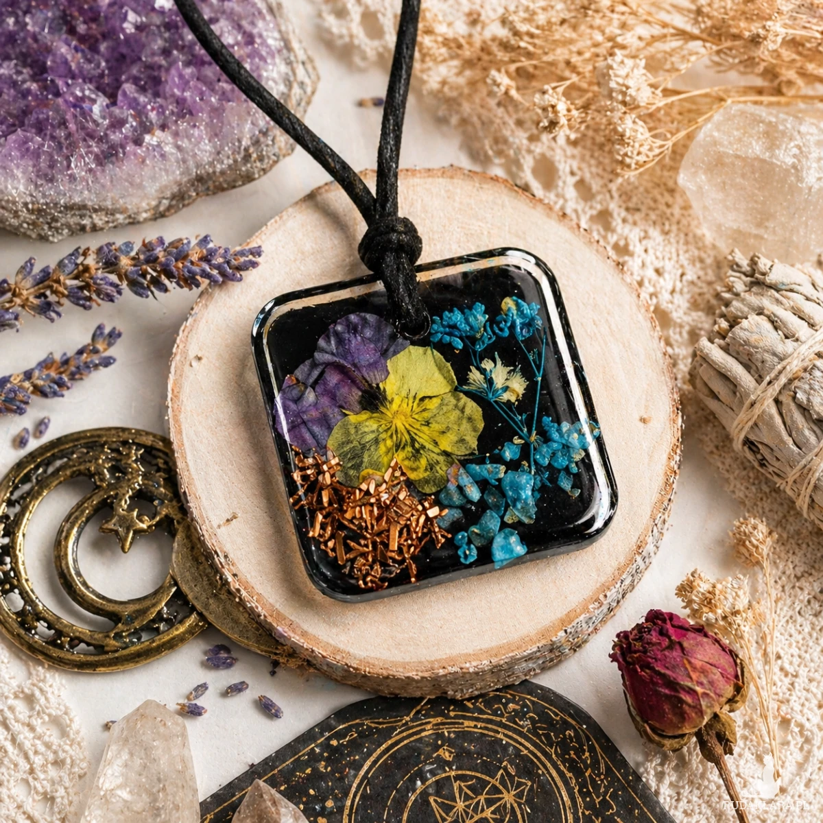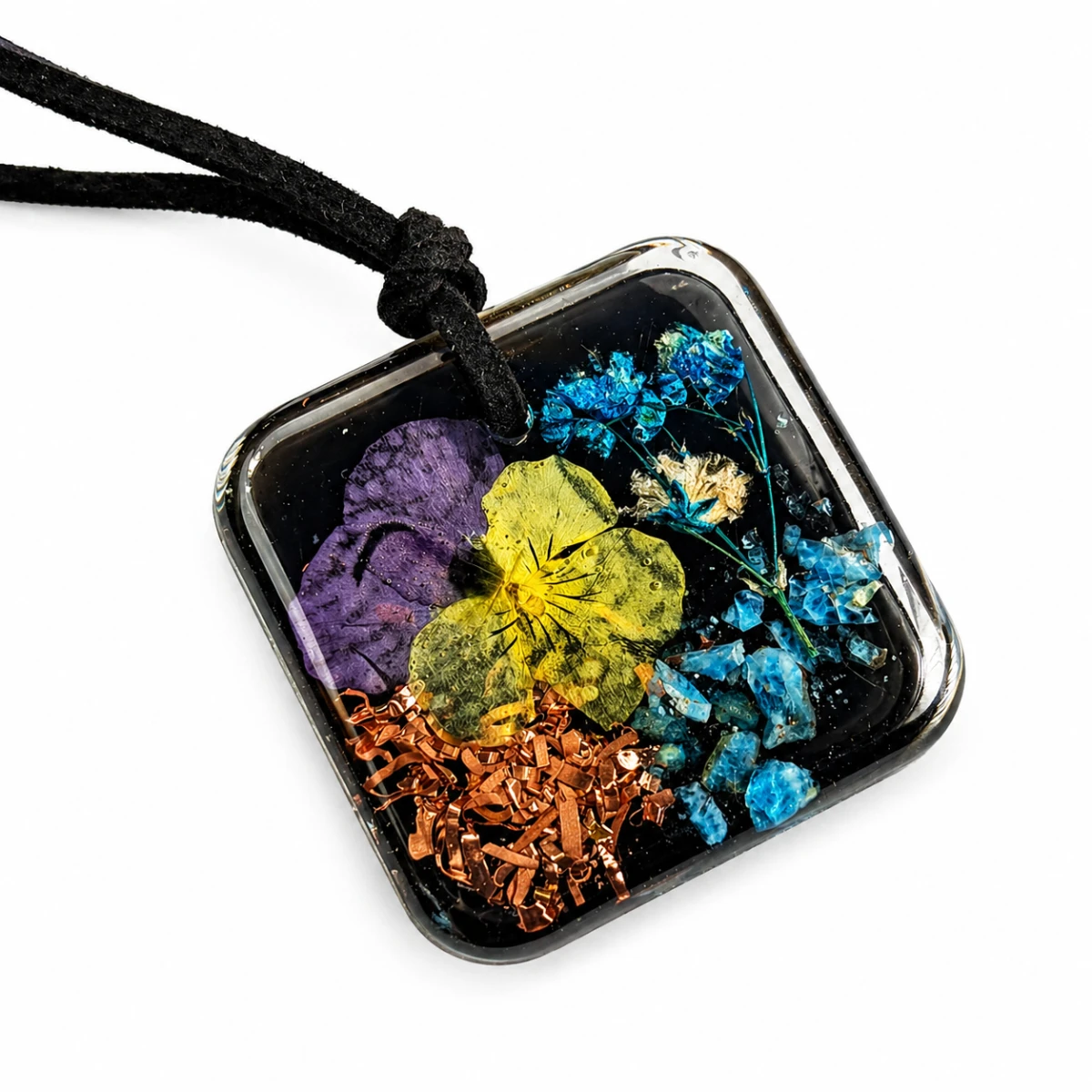 Ręcznie wykonany wisiorek orgonit w formie kwadratu to wyjątkowy amulet łączący naturalne materiały i symbolikę energii. W transparentnej żywicy zatopione zostały kamienie, rośliny i metaliczne elementy, tworząc harmonijną kompozycję inspirowaną naturą.